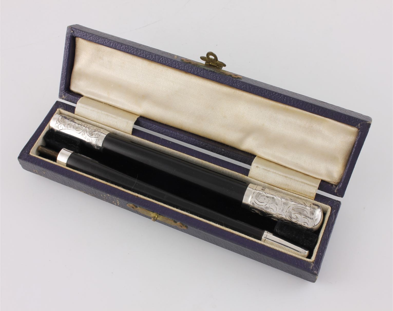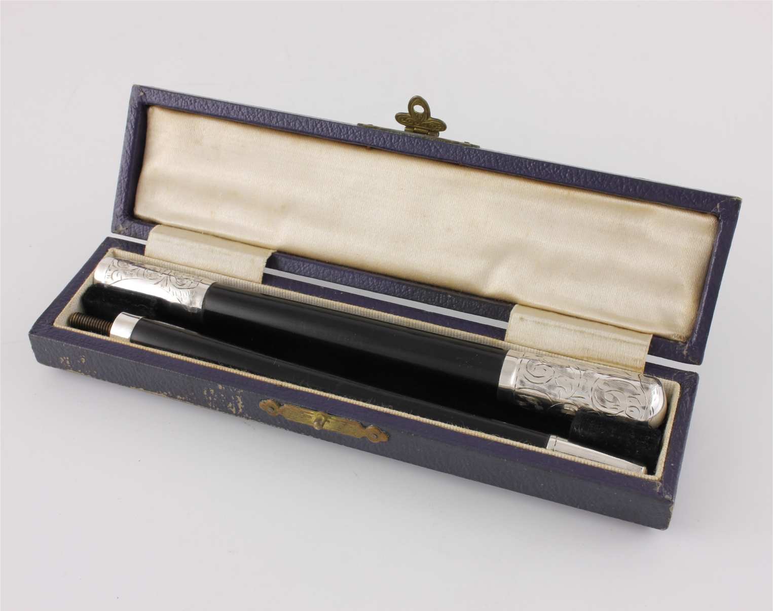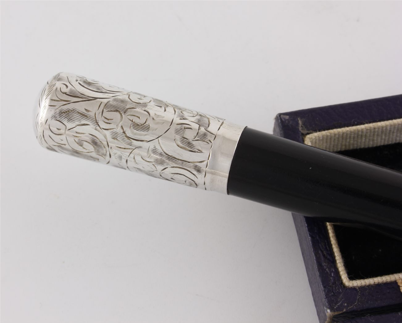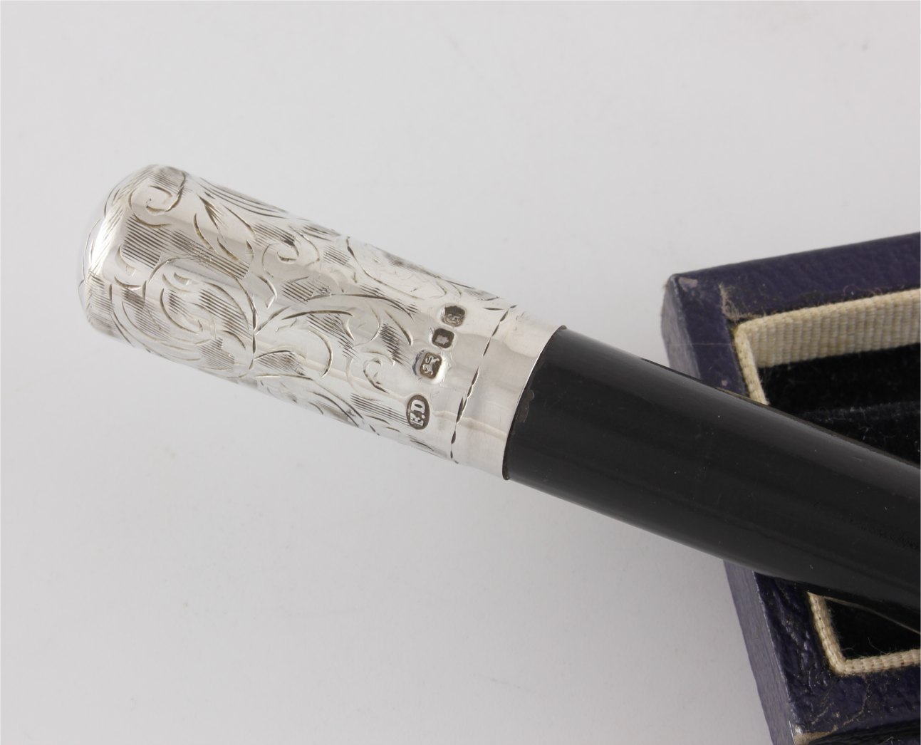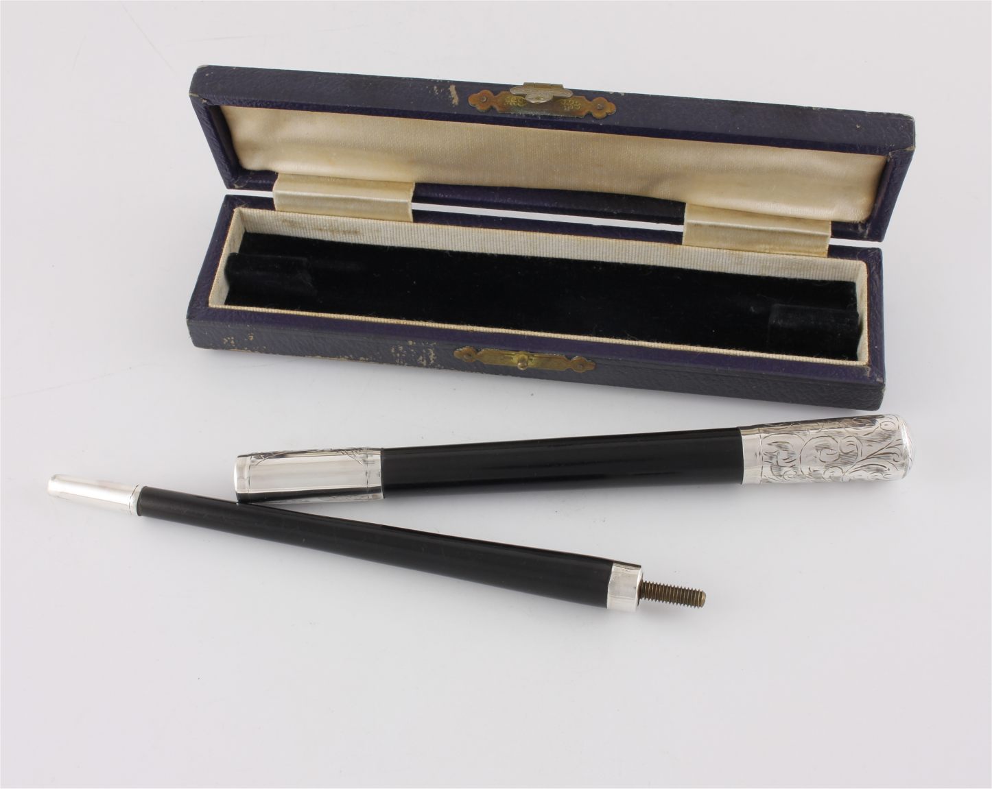 This two piece pocket sized conductor's baton which is made of ebony has silver fittings which are hallmarked for 1942 and unscrews so it can be packed away in it's case for transportation.