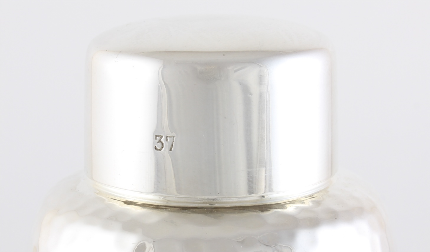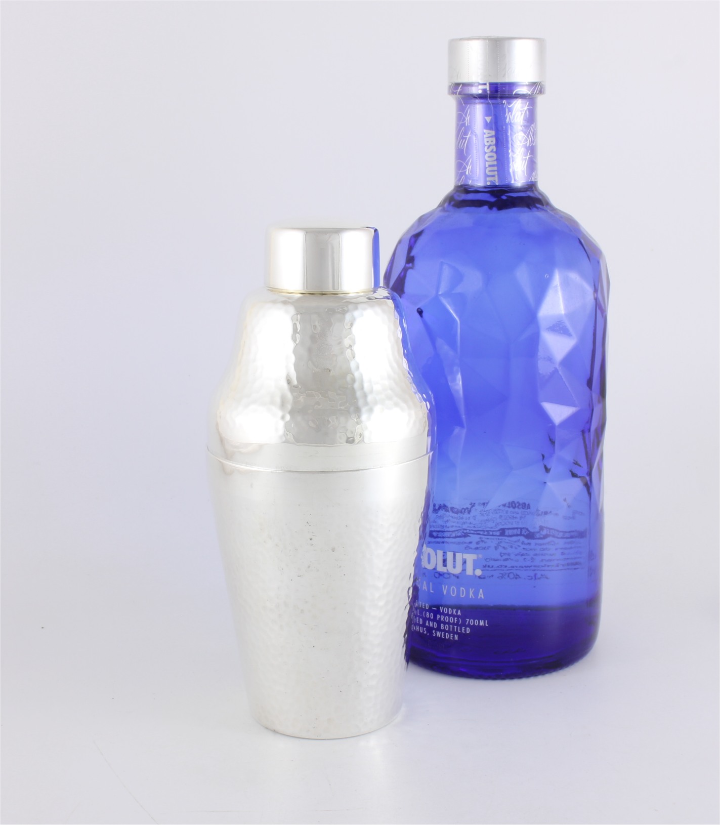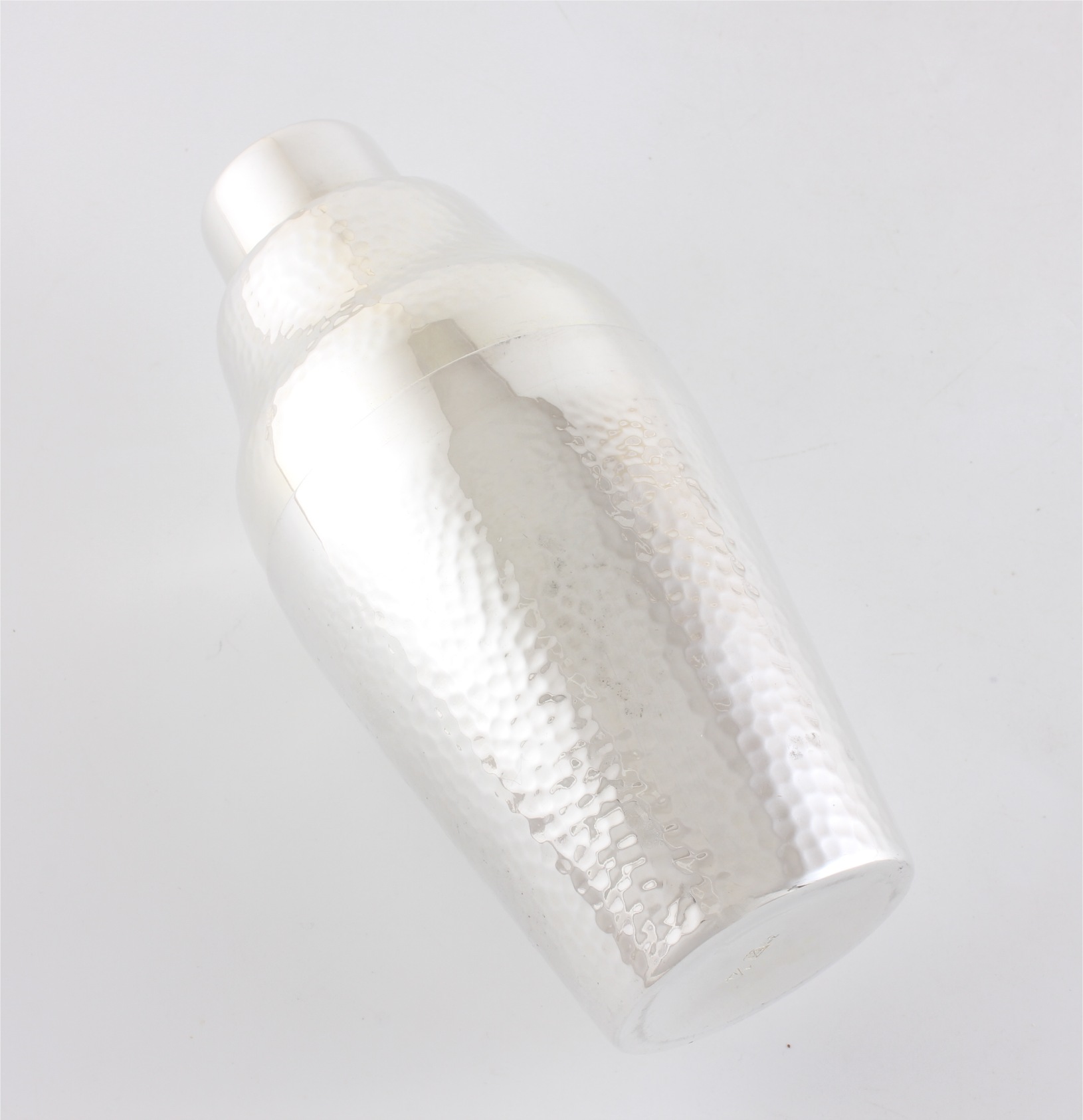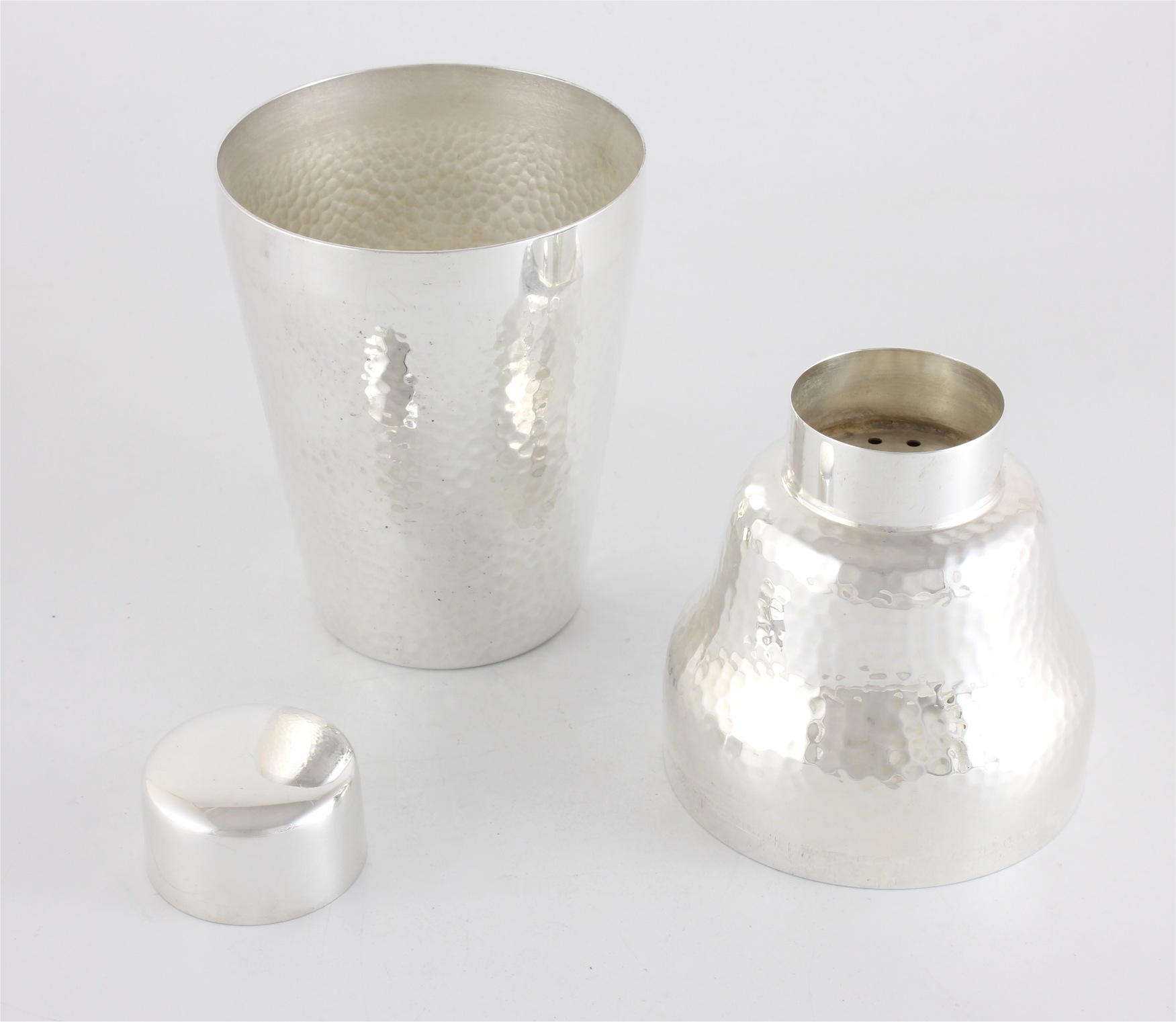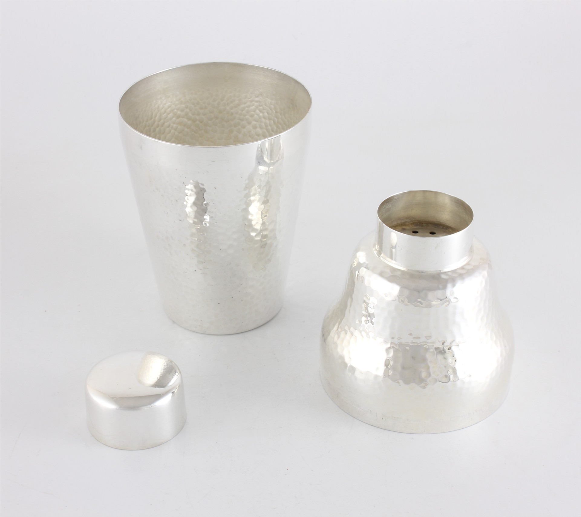 This stylish antique 3 piece cocktail shaker which has hammered design decoration to the body is made of high quality silver plate by Carl Deffner and dates from c1920.