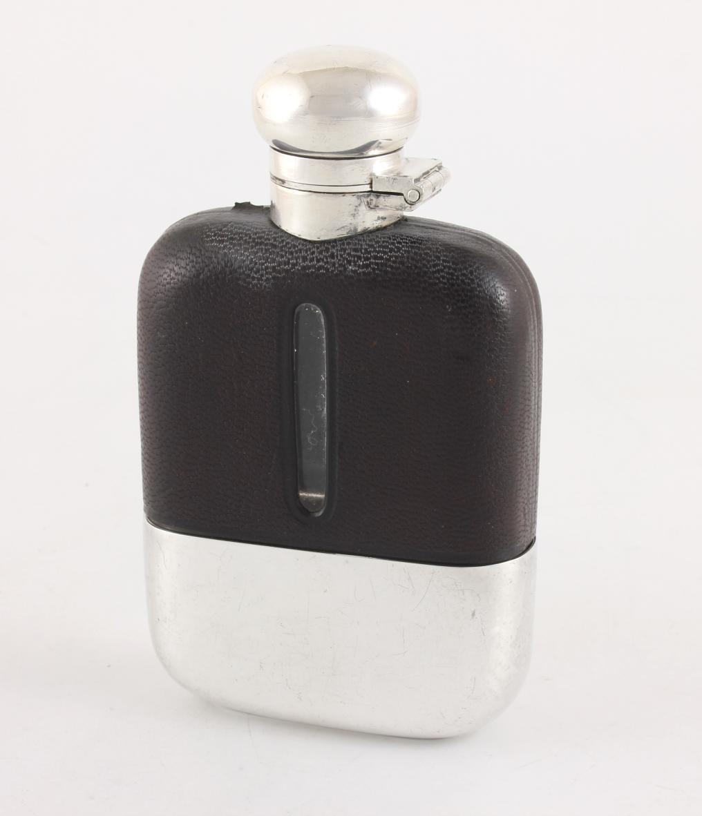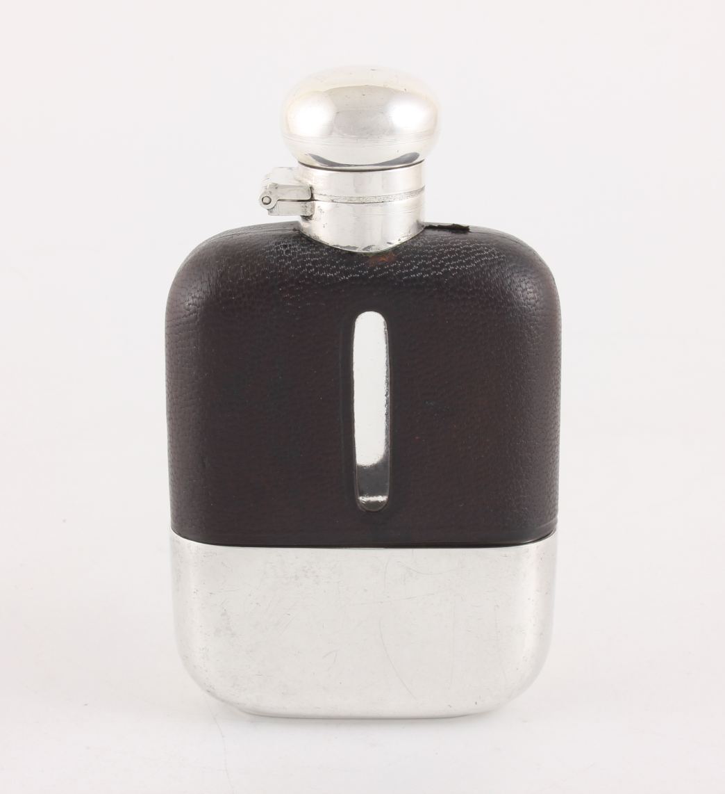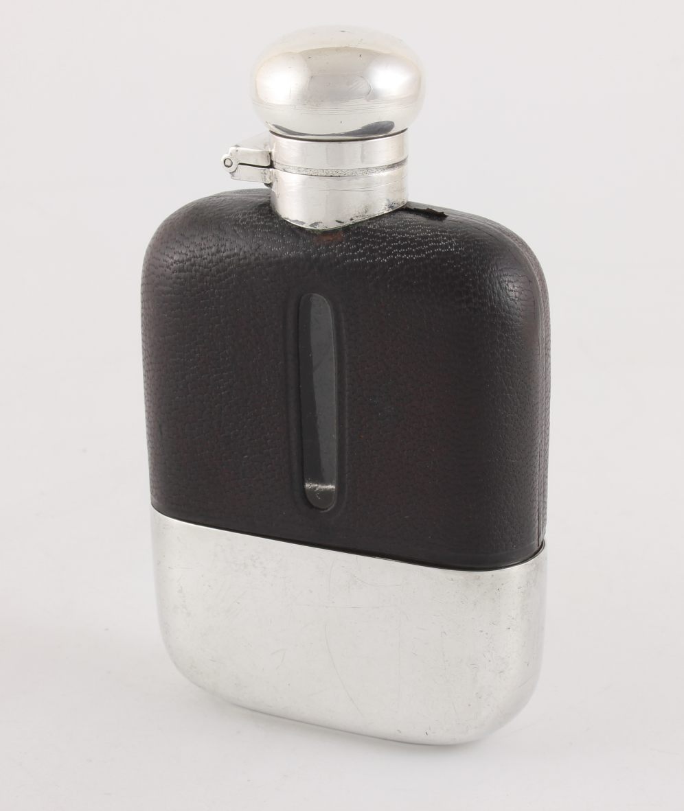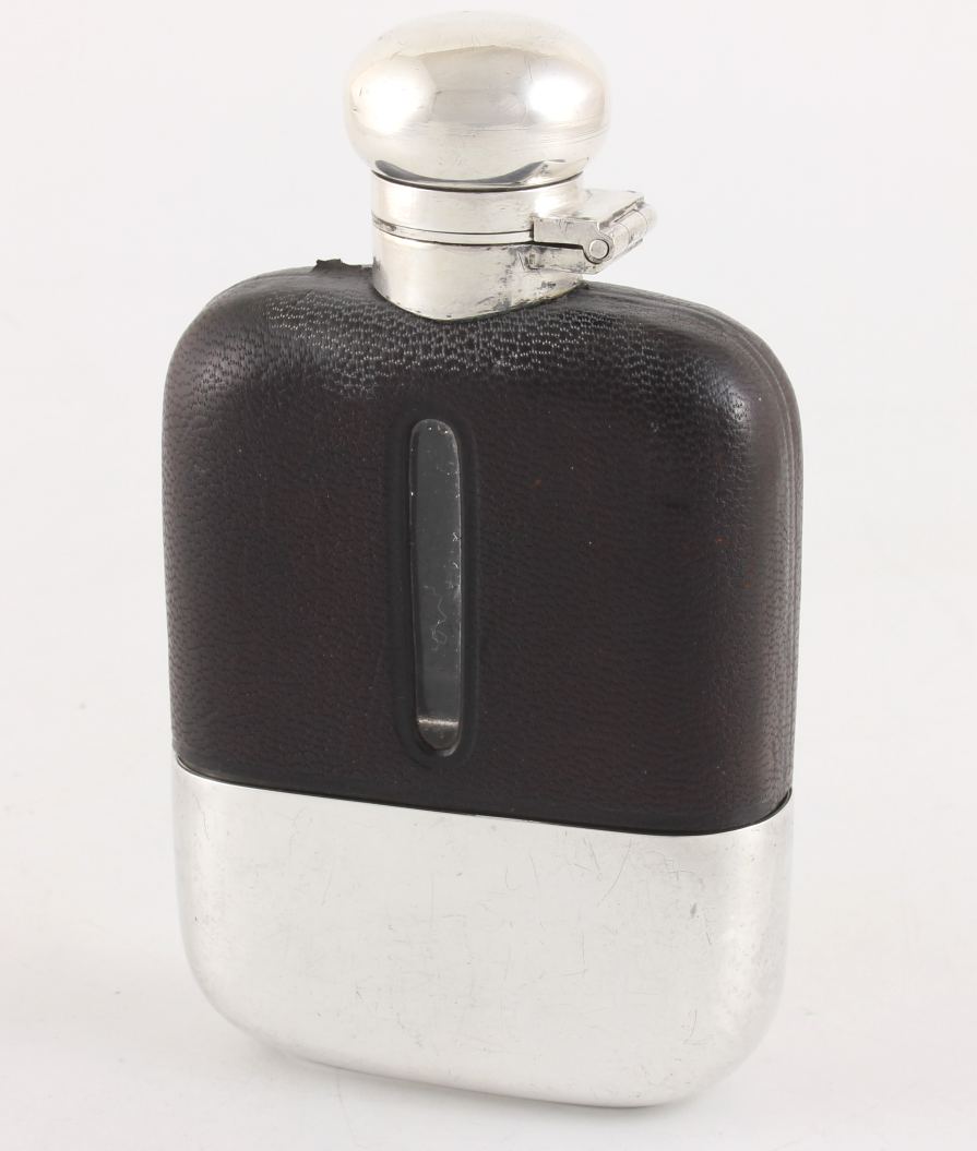 This small vintage hip flask which has a detachable silver plated cup and bayonet top has the outer top half of the glass body covered in dark brown leather with a sight level on both sides.