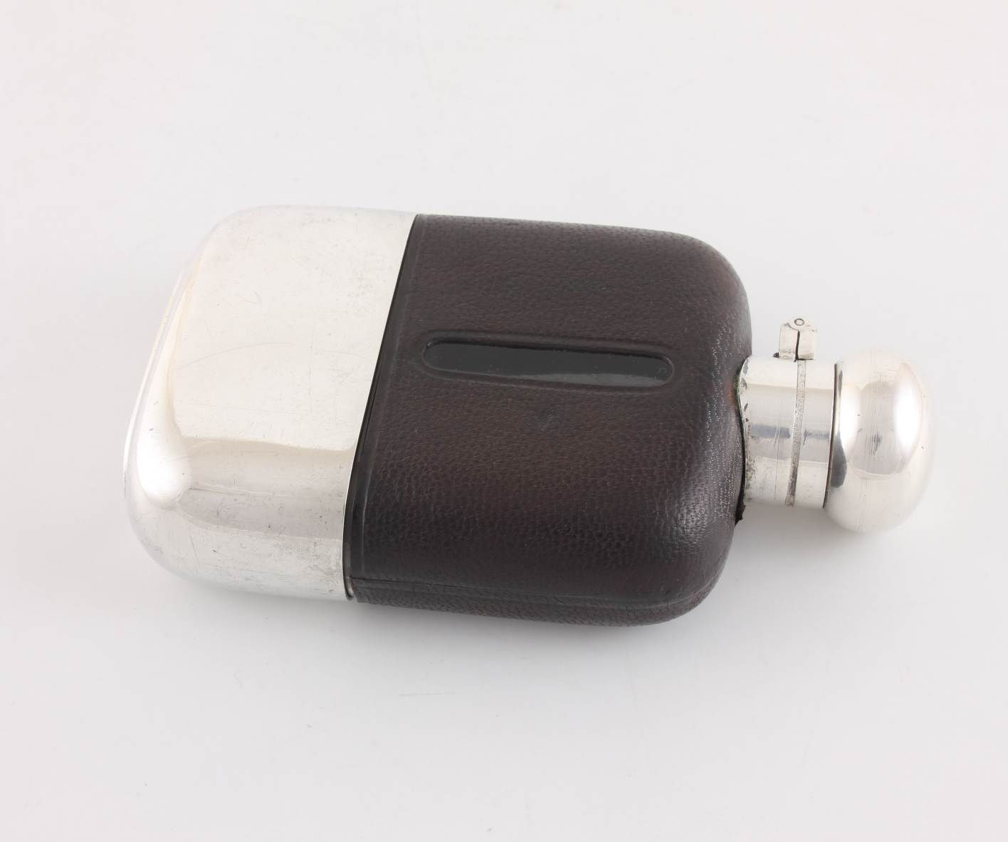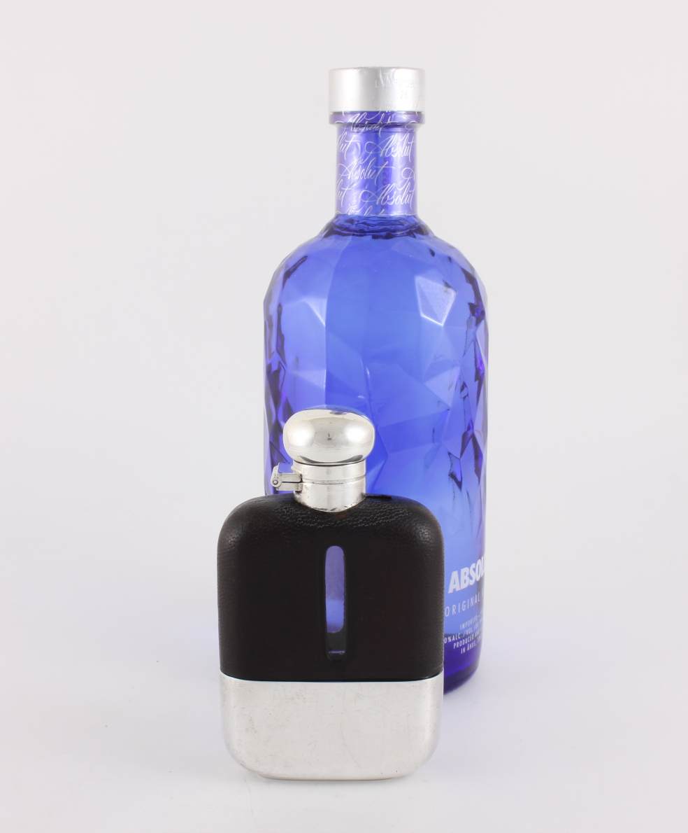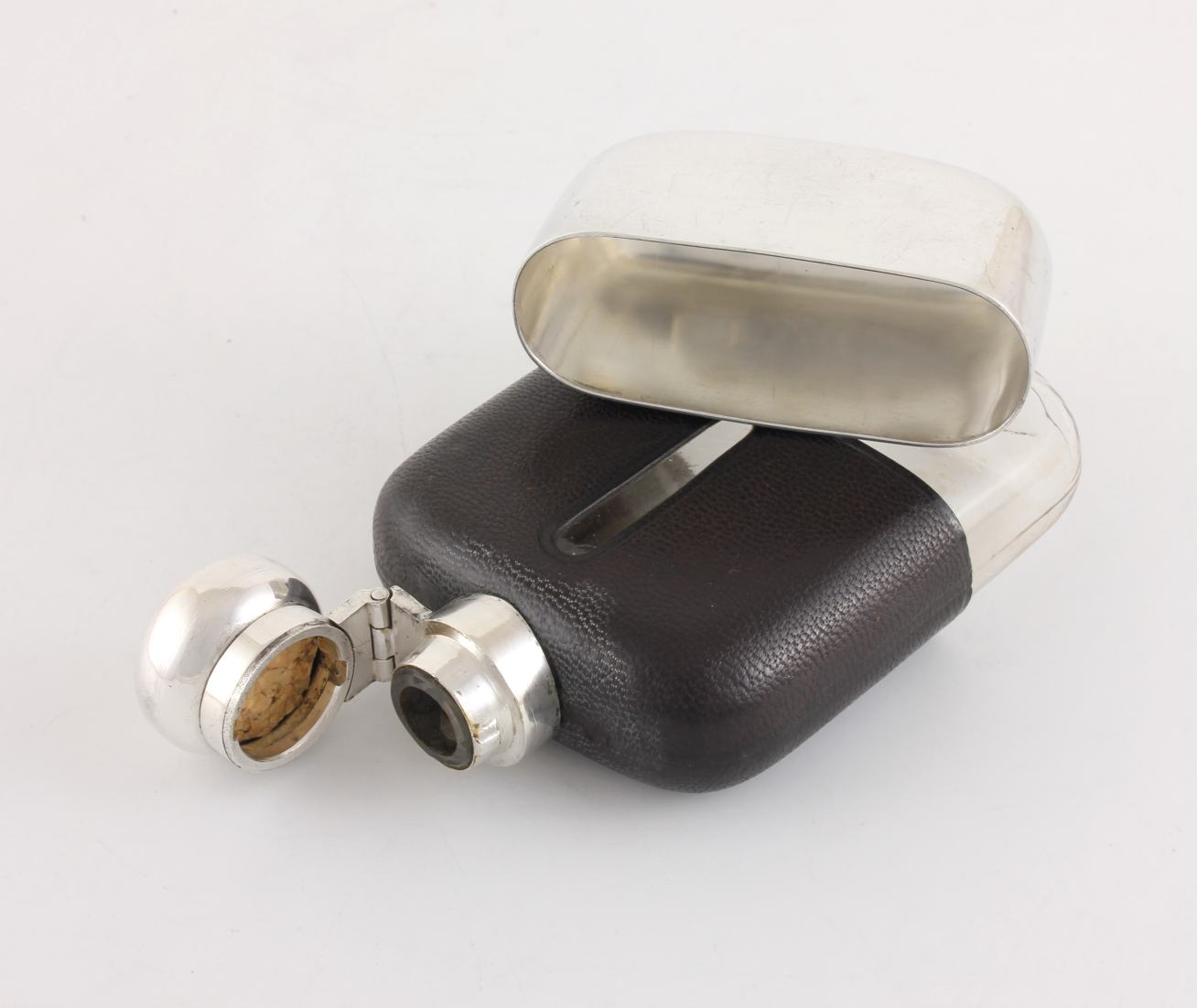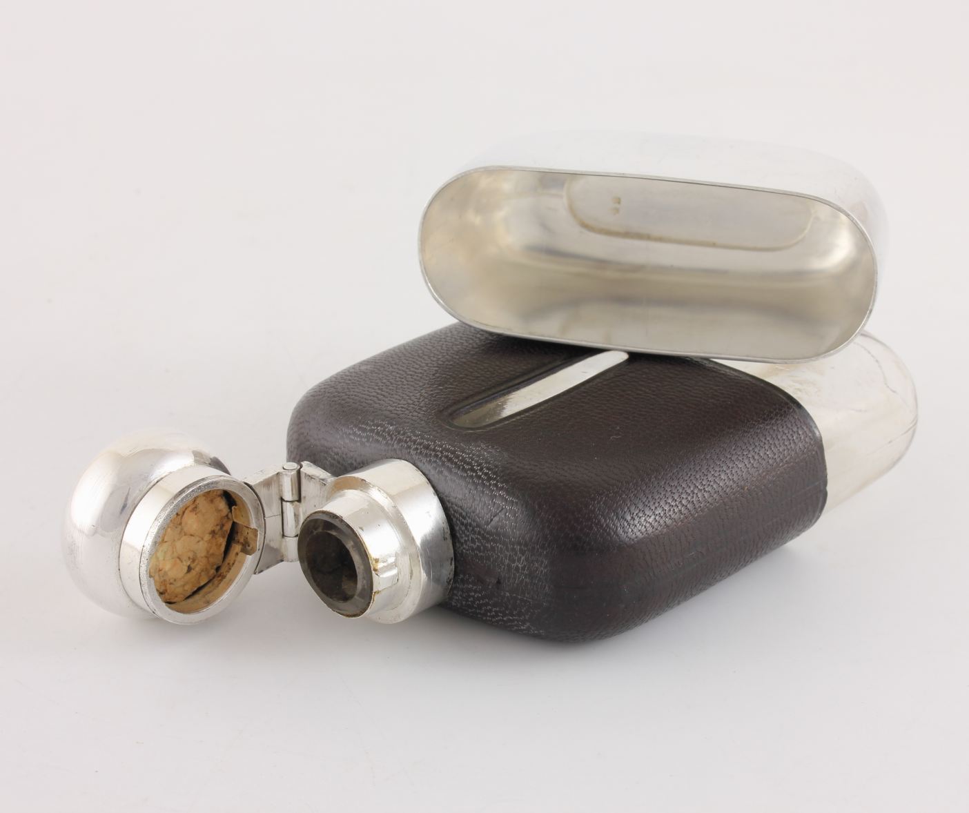 This small vintage hip flask which has a detachable silver plated cup and bayonet top has the outer top half of the glass body covered in dark brown leather with a sight level on both sides.