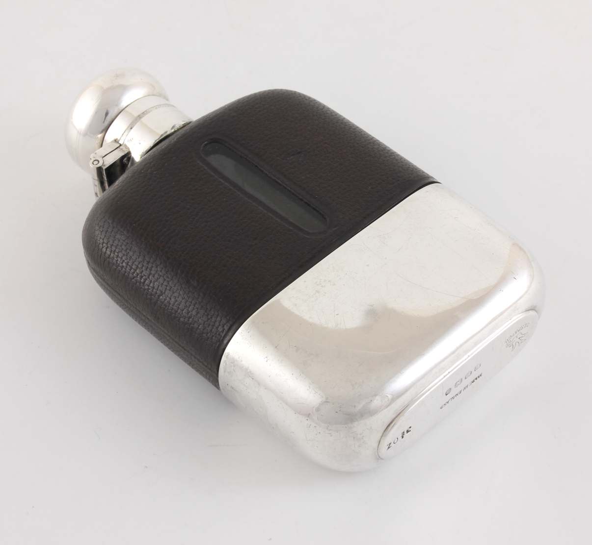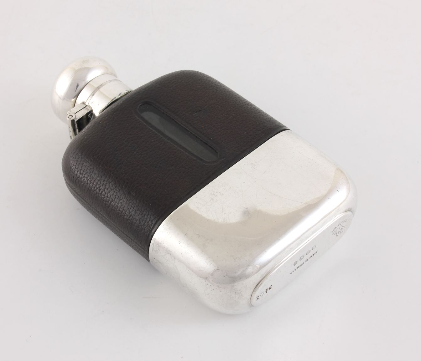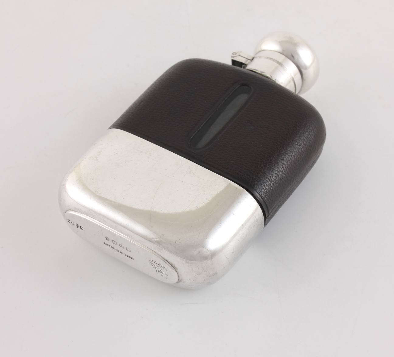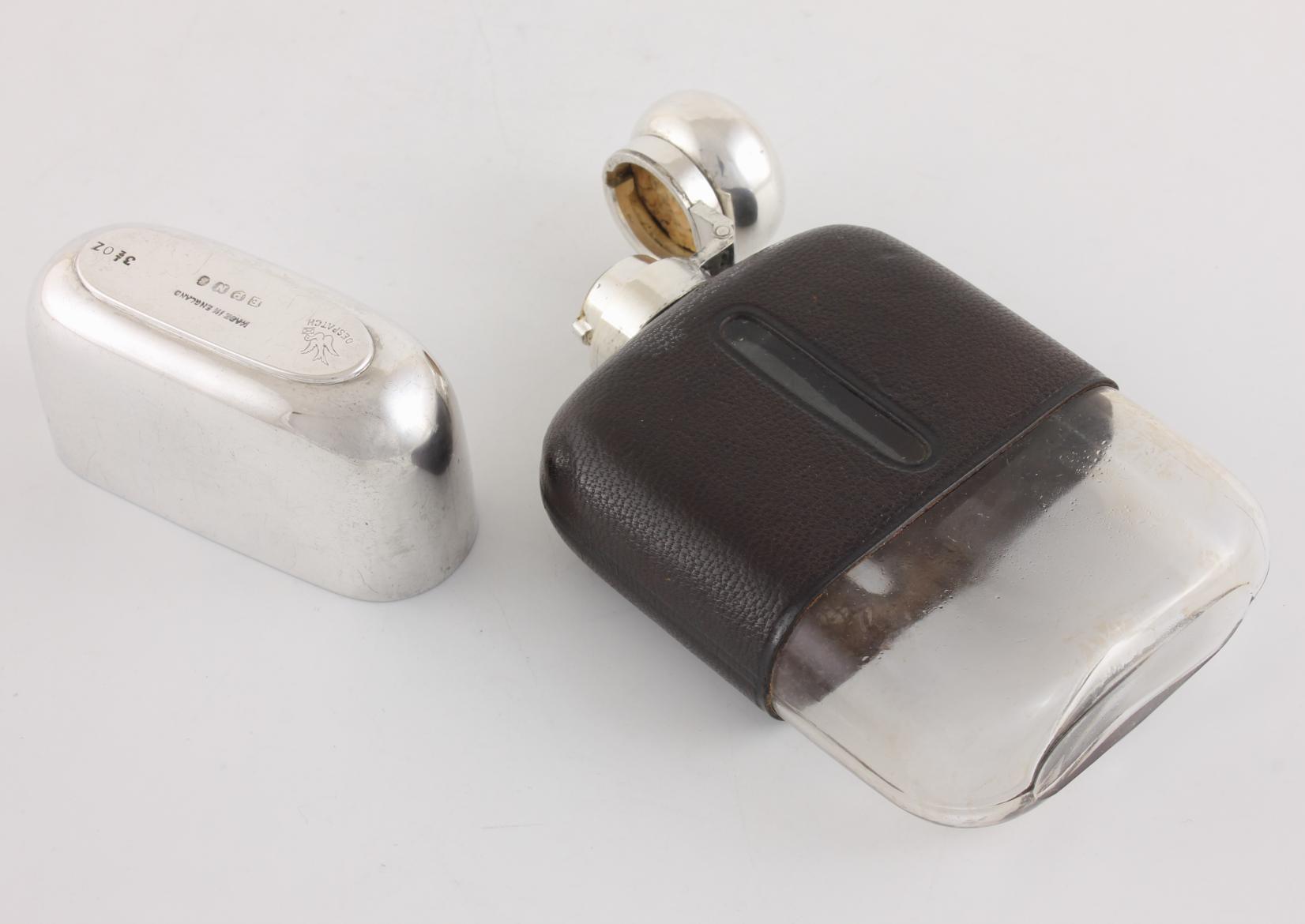 This small vintage hip flask which has a detachable silver plated cup and bayonet top has the outer top half of the glass body covered in dark brown leather with a sight level on both sides.