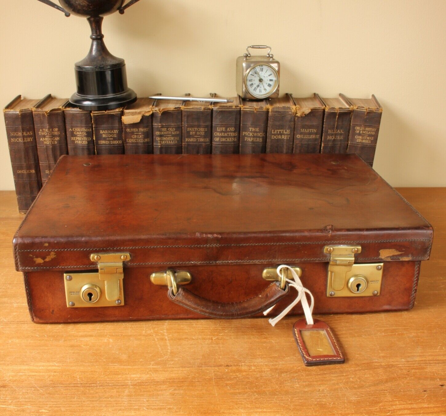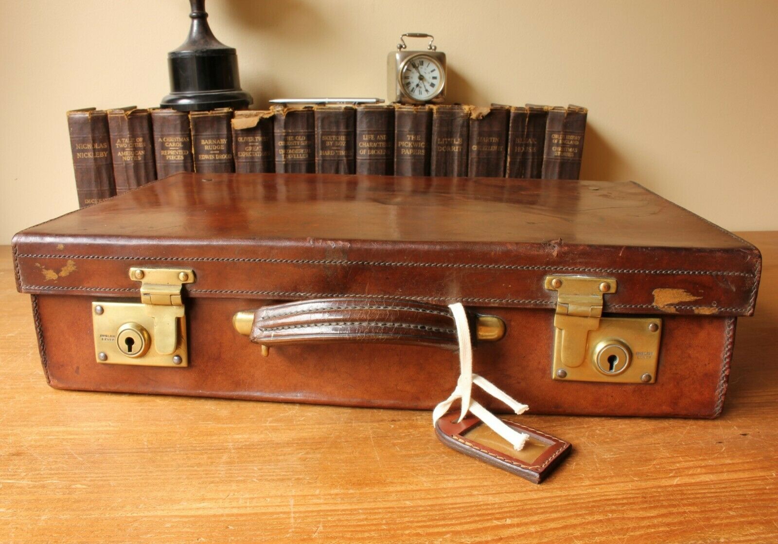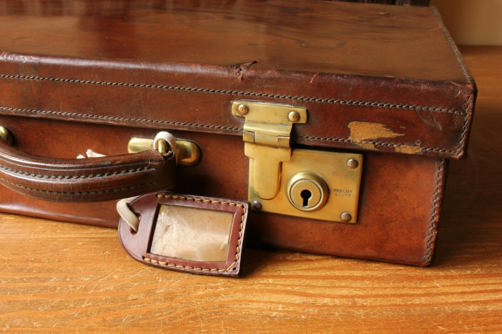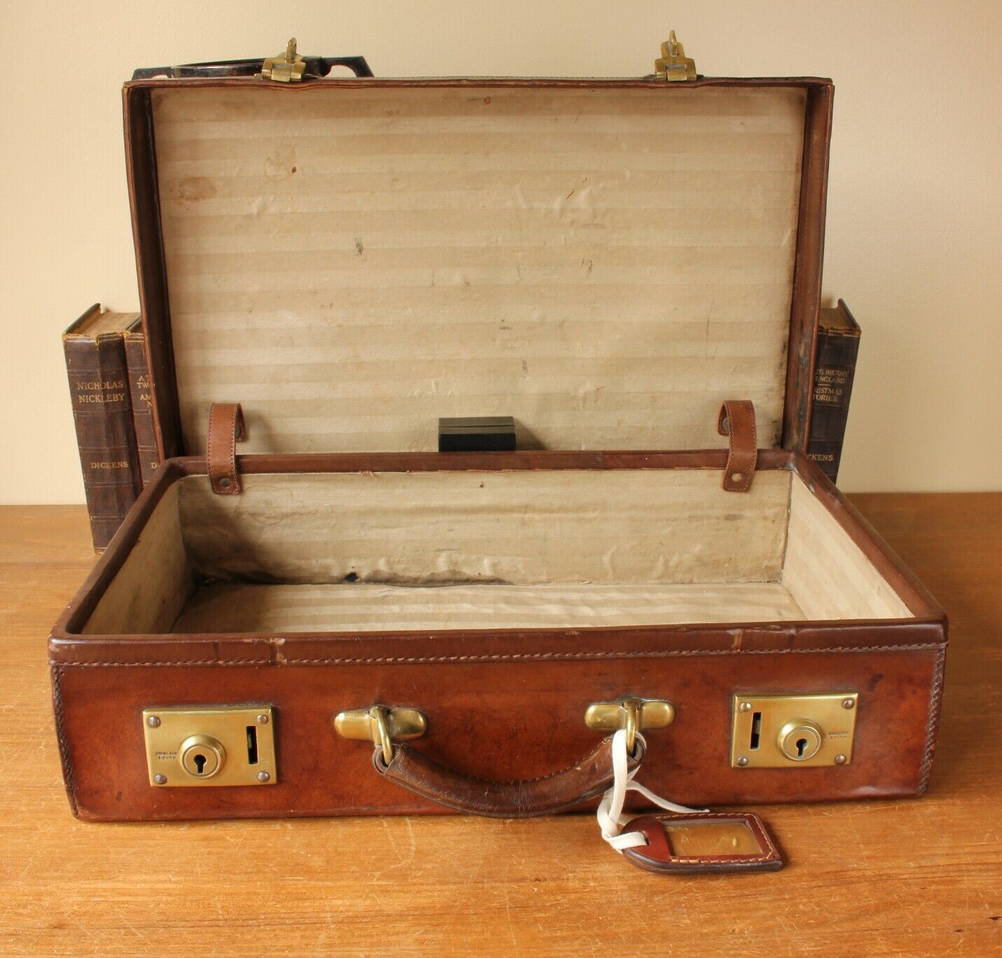 The leather has a wonderful aged look with a warm patina and a dark rich colour. Both brass locks/clasps are stamped 'British Lever' and work OK but the left one sometimes can be a little cheeky and needs a hand to pop out when released. The interior lining is a little worn with some staining and creasing.