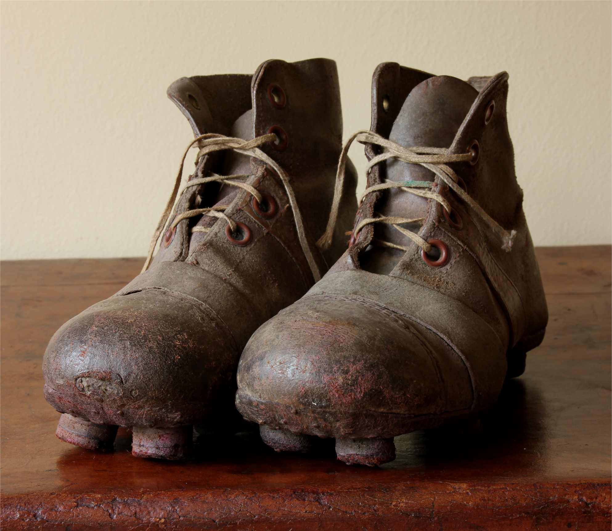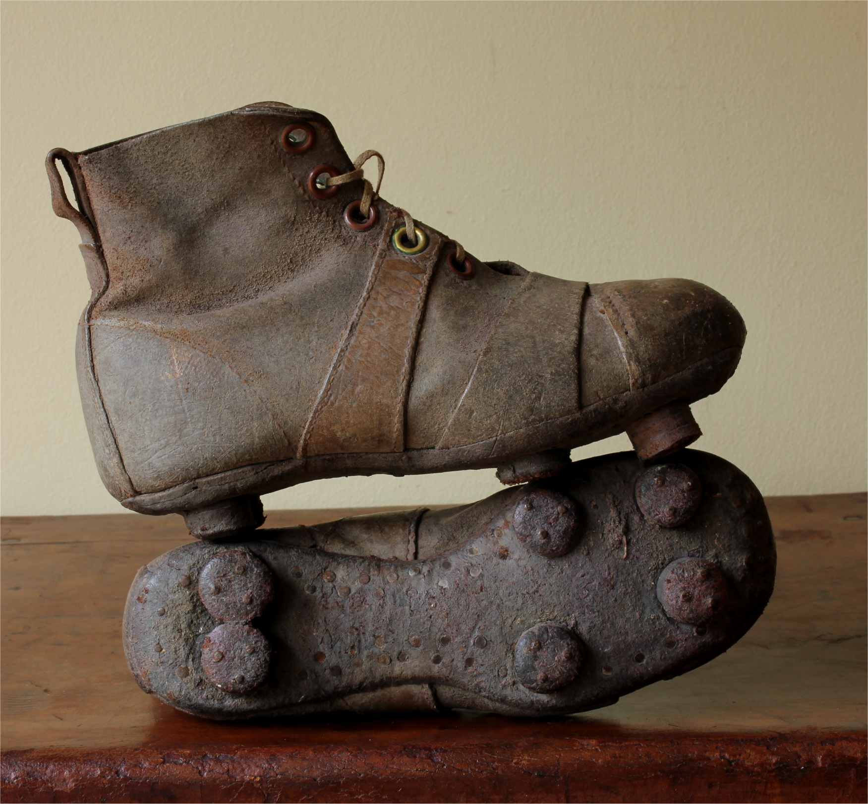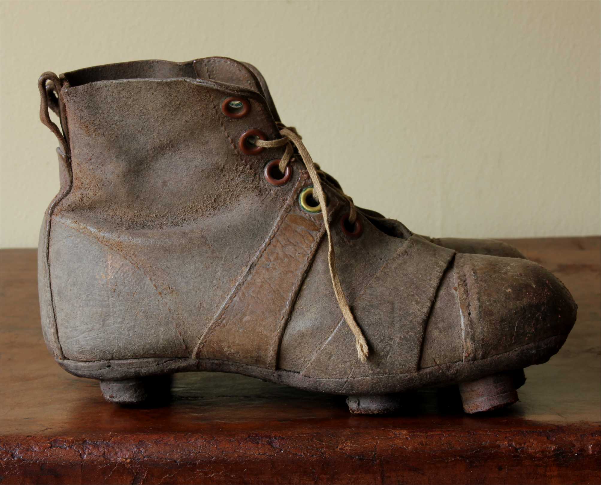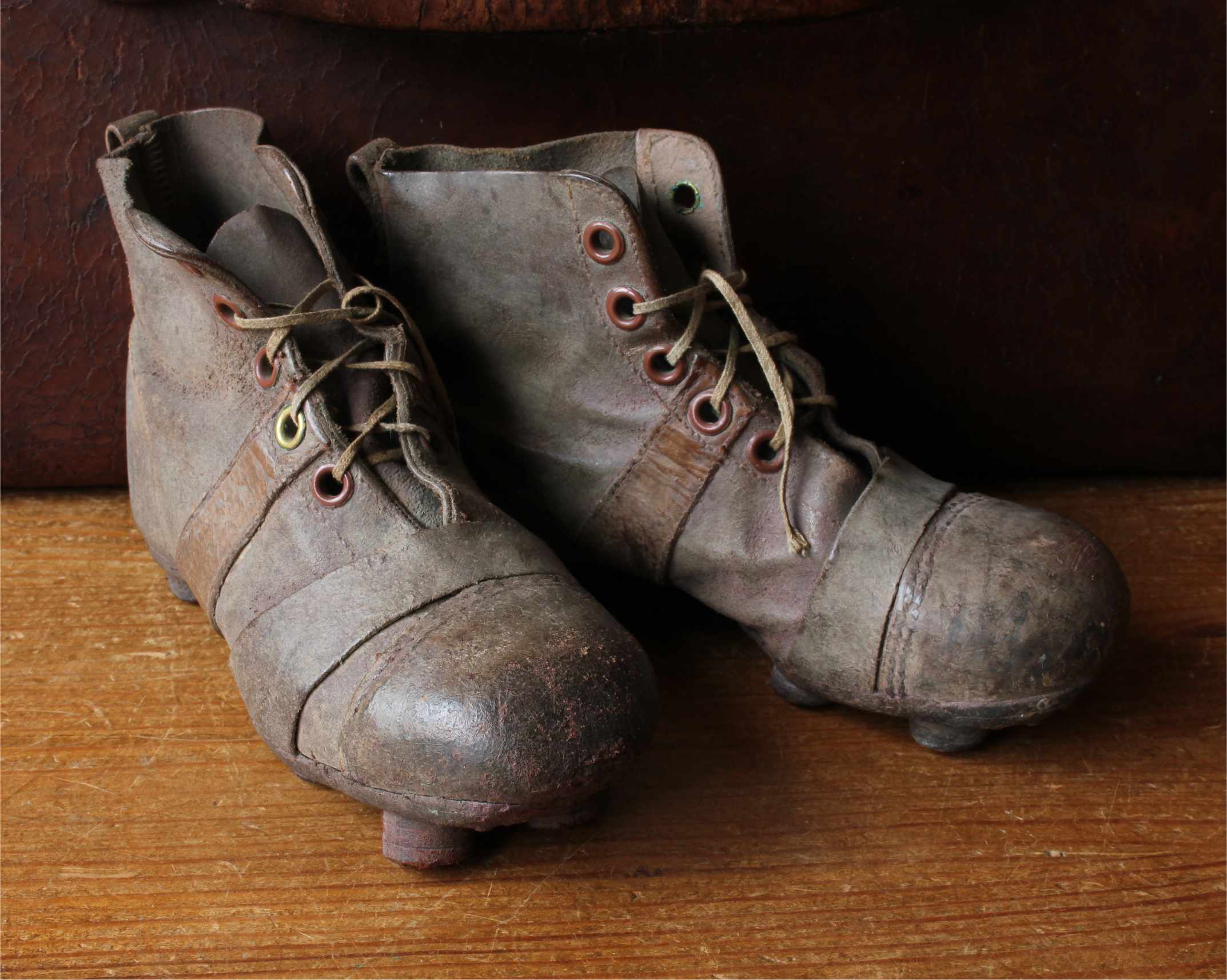 This charming pair of original vintage football boots which are made of brown leather have leather nailed on soles & studs, date from c1940 and are in a child's small size.
