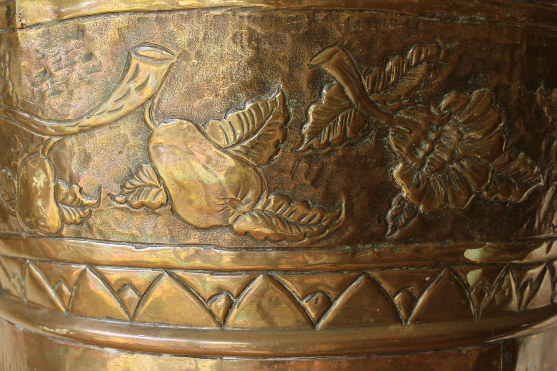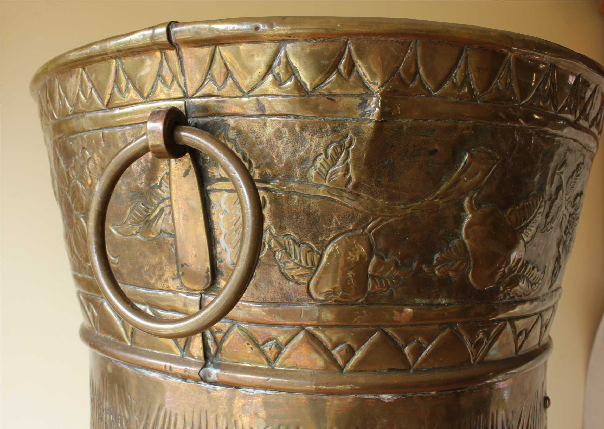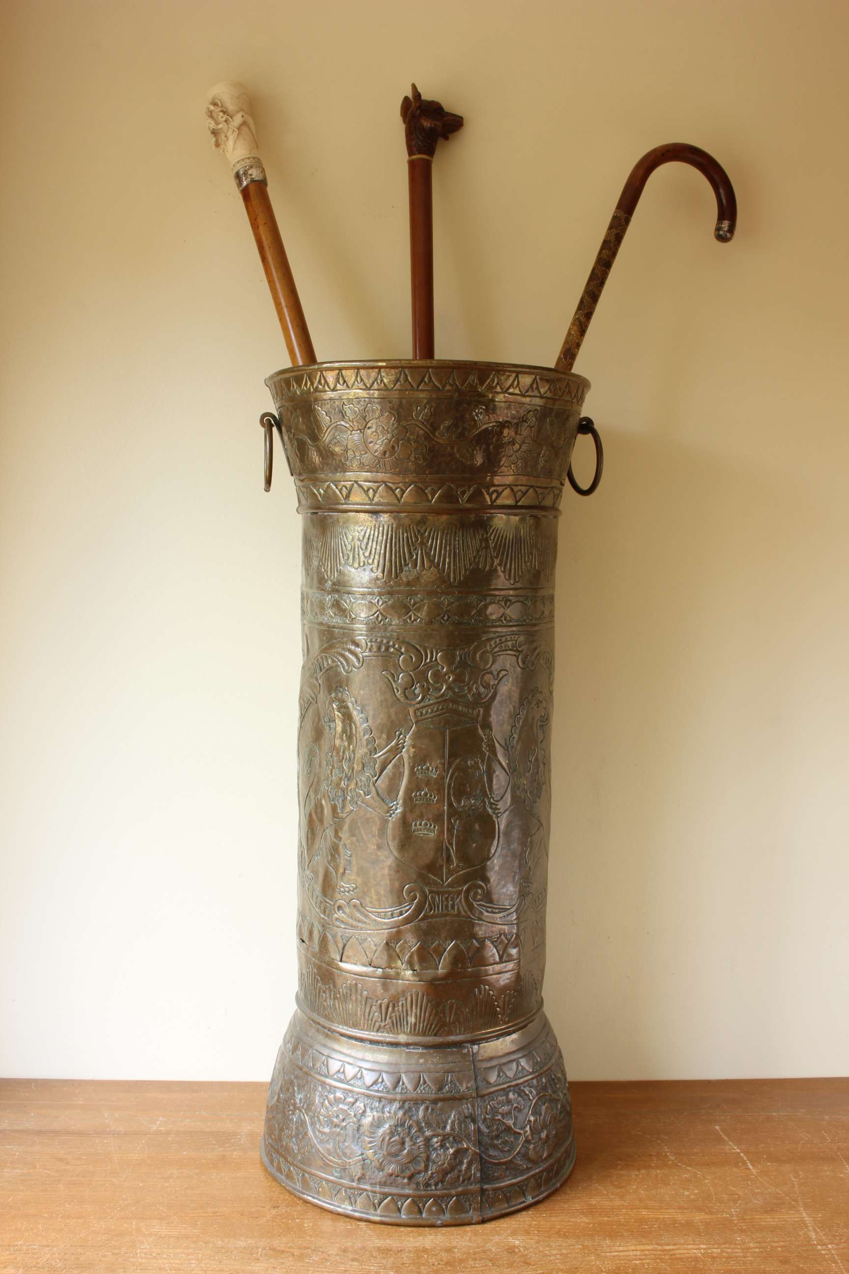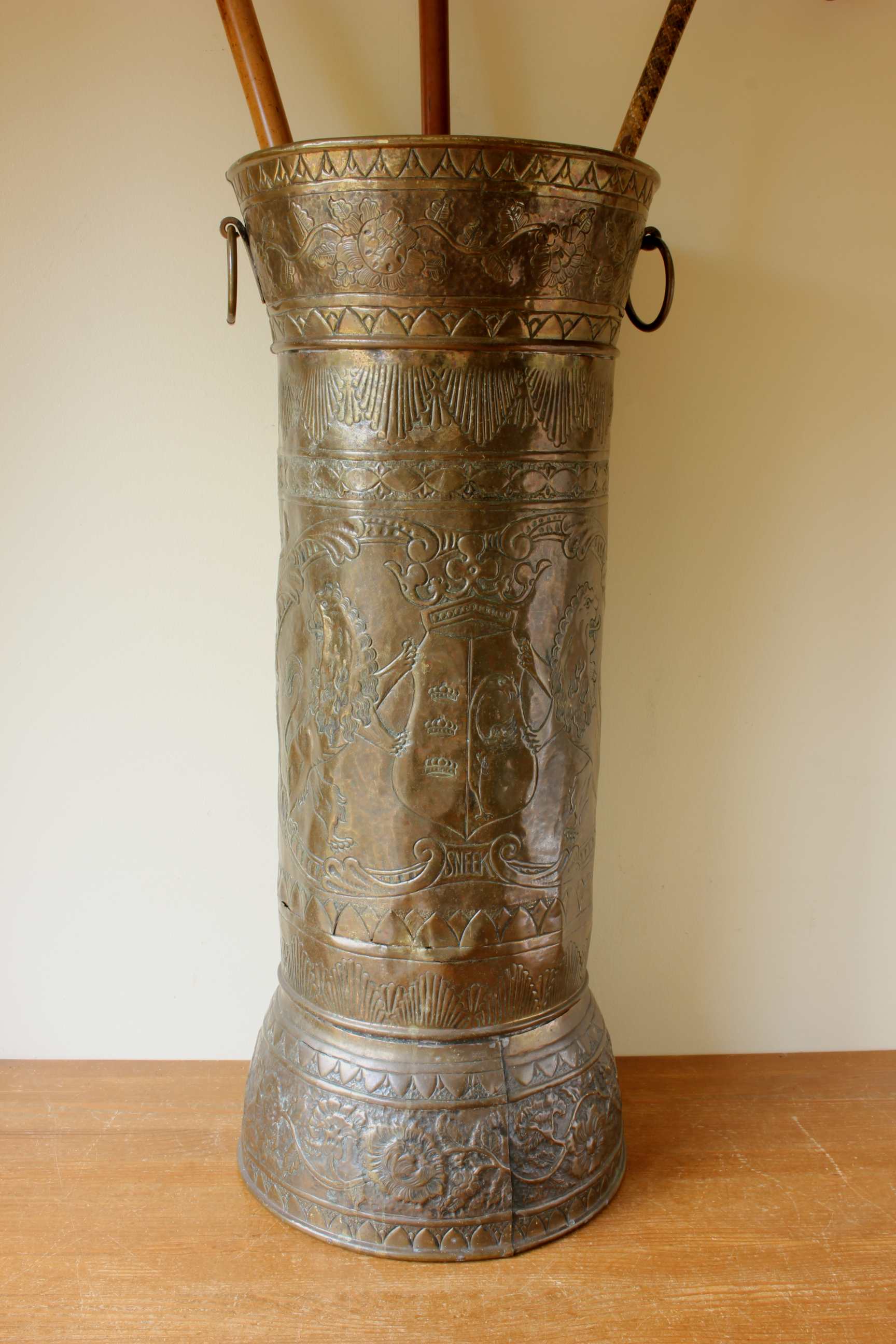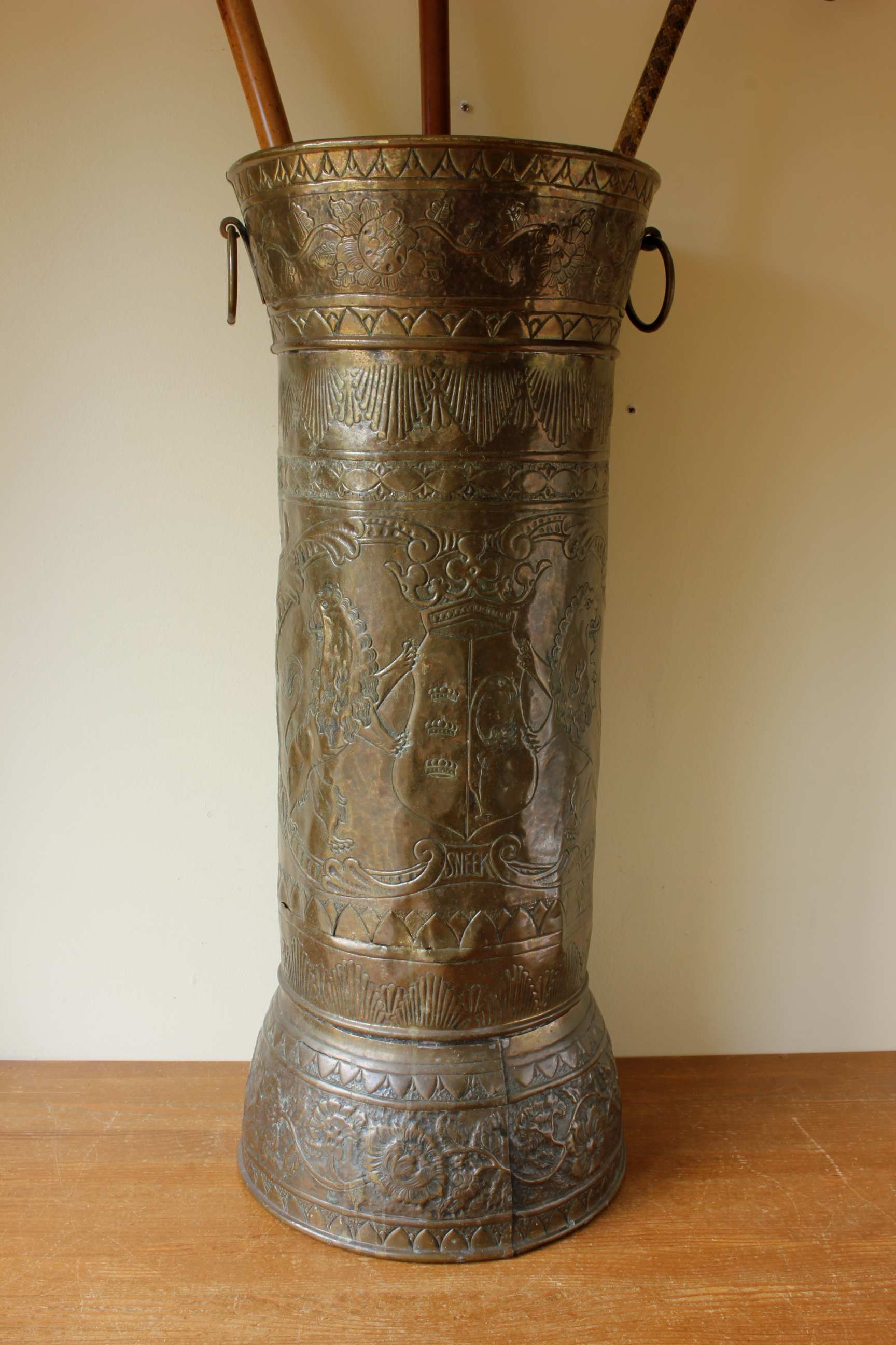 This large handsome antique brass umbrella / stick stand which was made in Netherlands dates from the beginning of the 20th century.