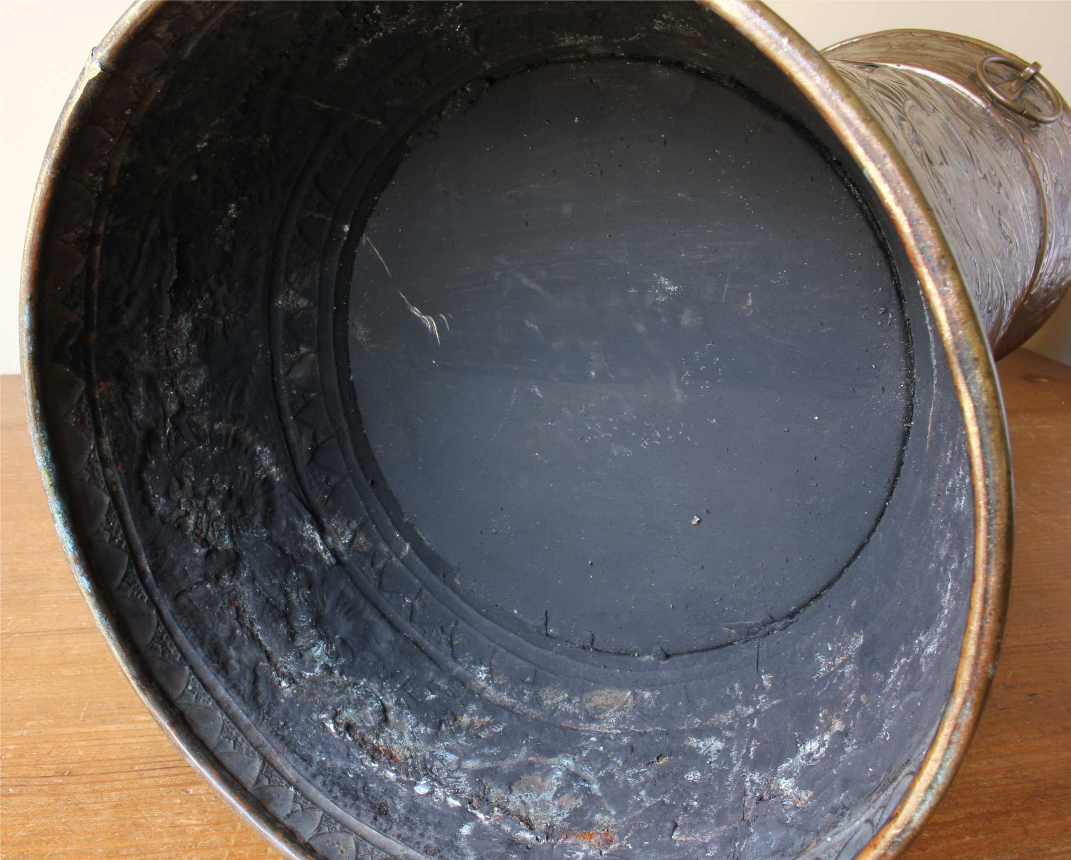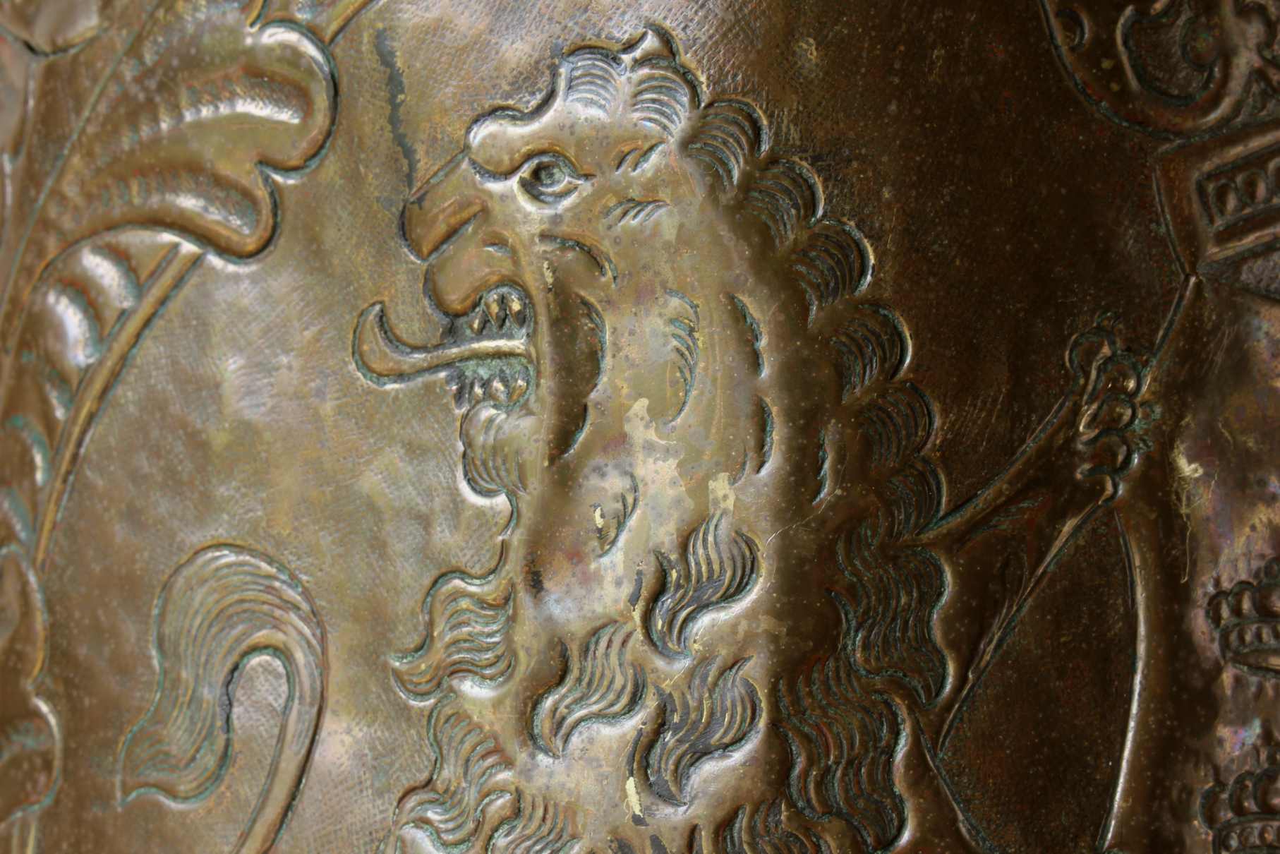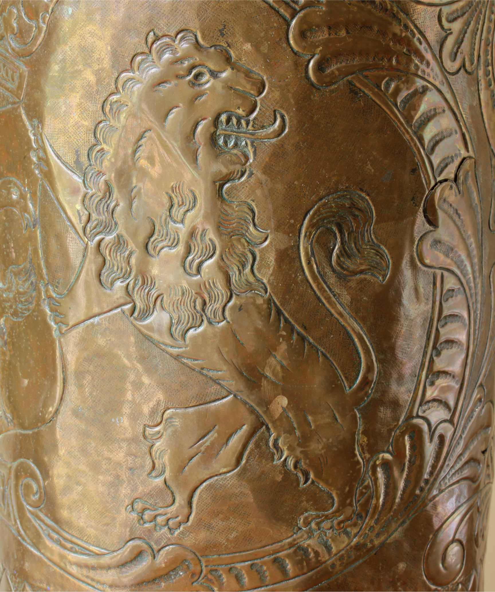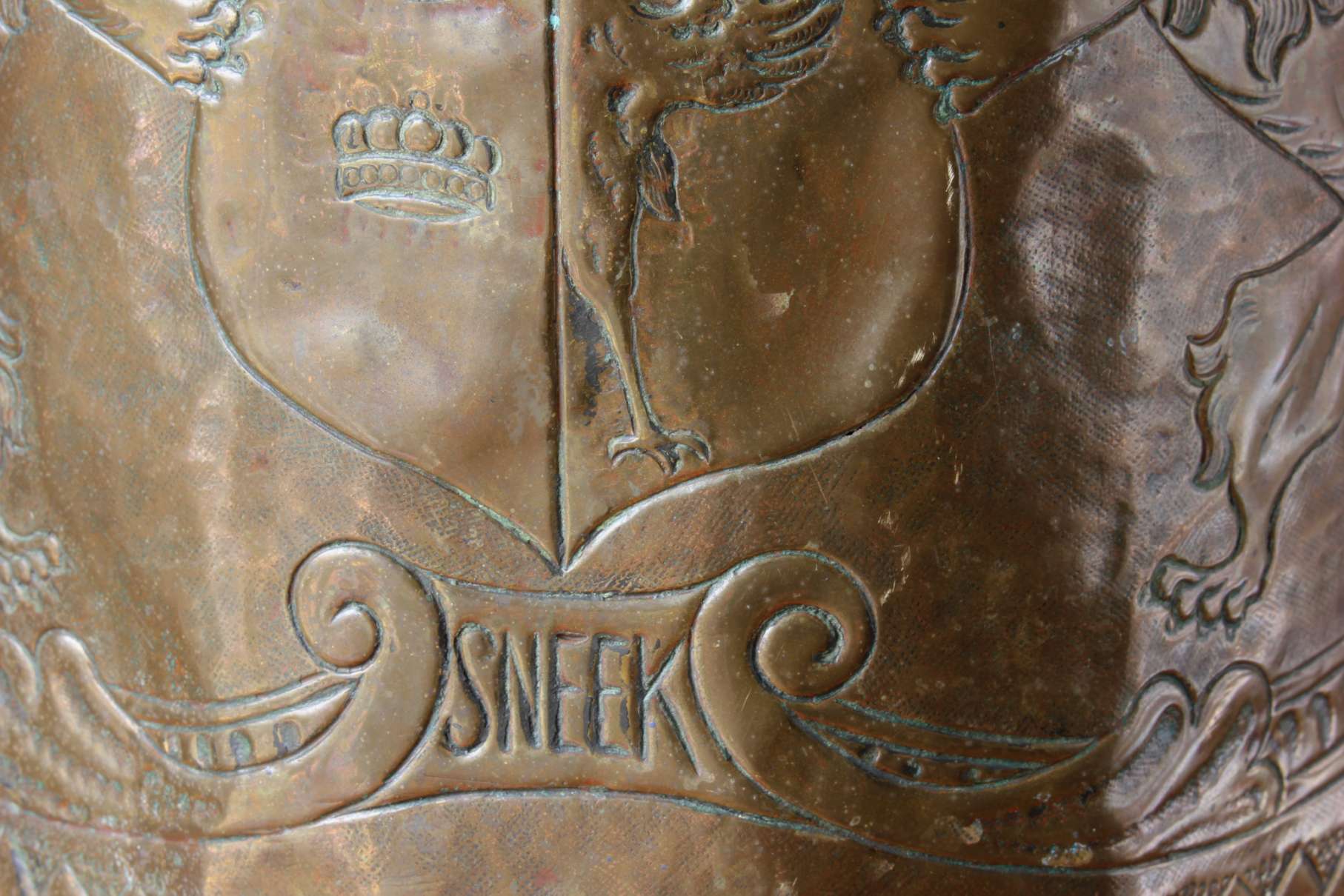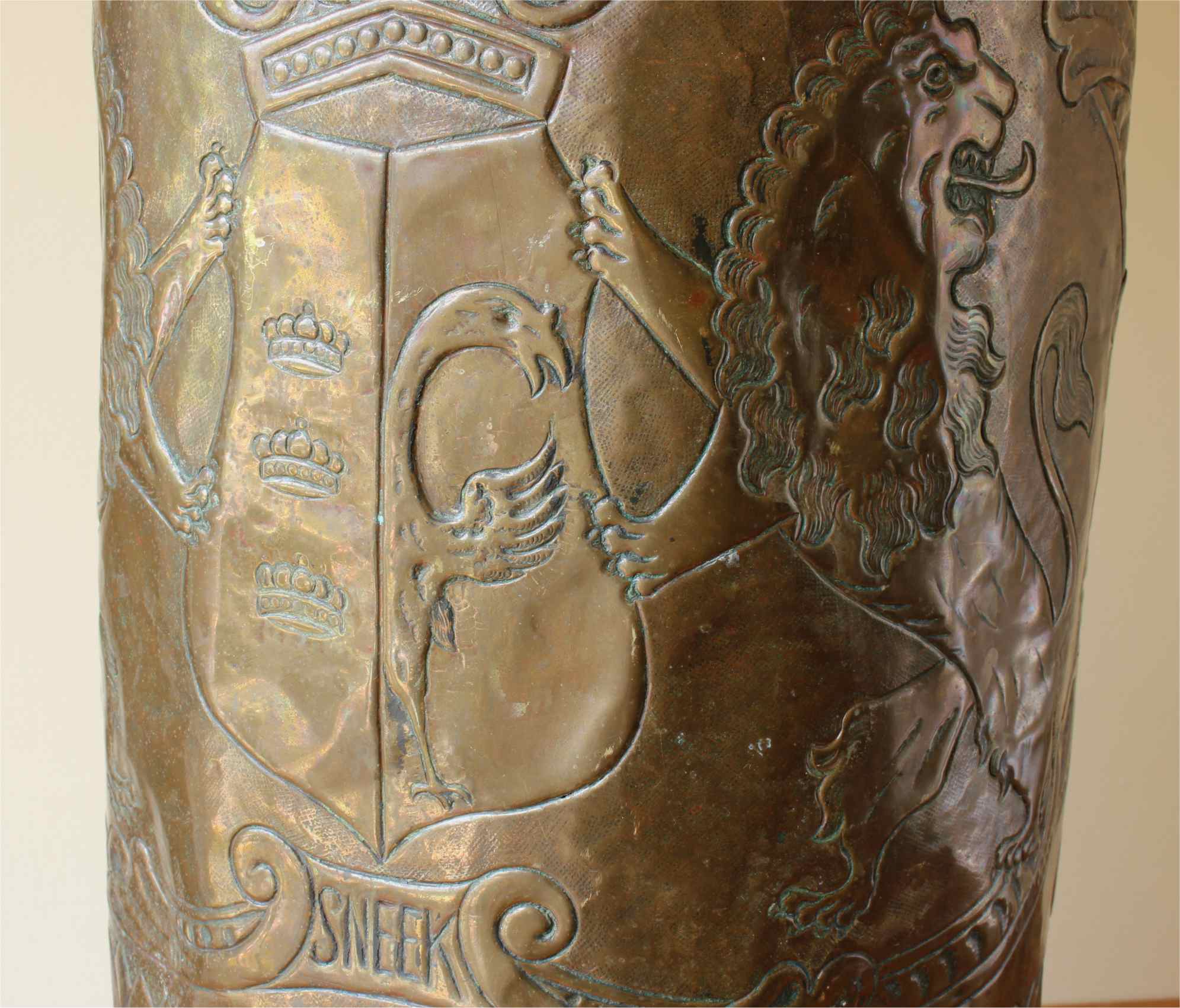 This unusual stand has two ring side handles, seamed edging and has lots of wonderful hand embossed floral decoration. The front has a Dutch Crest that has two lions on either side of a shield and the wording Sneek which is in the Netherlands.