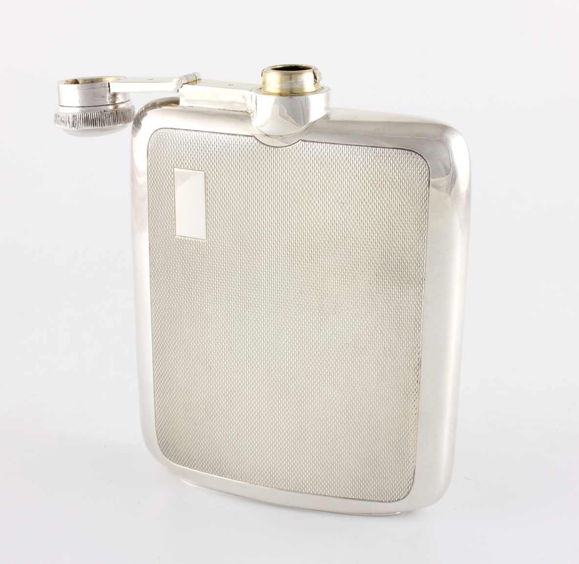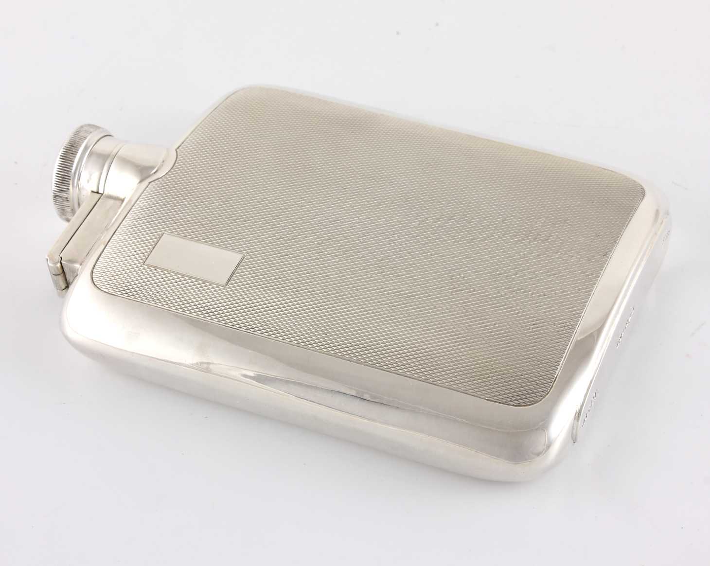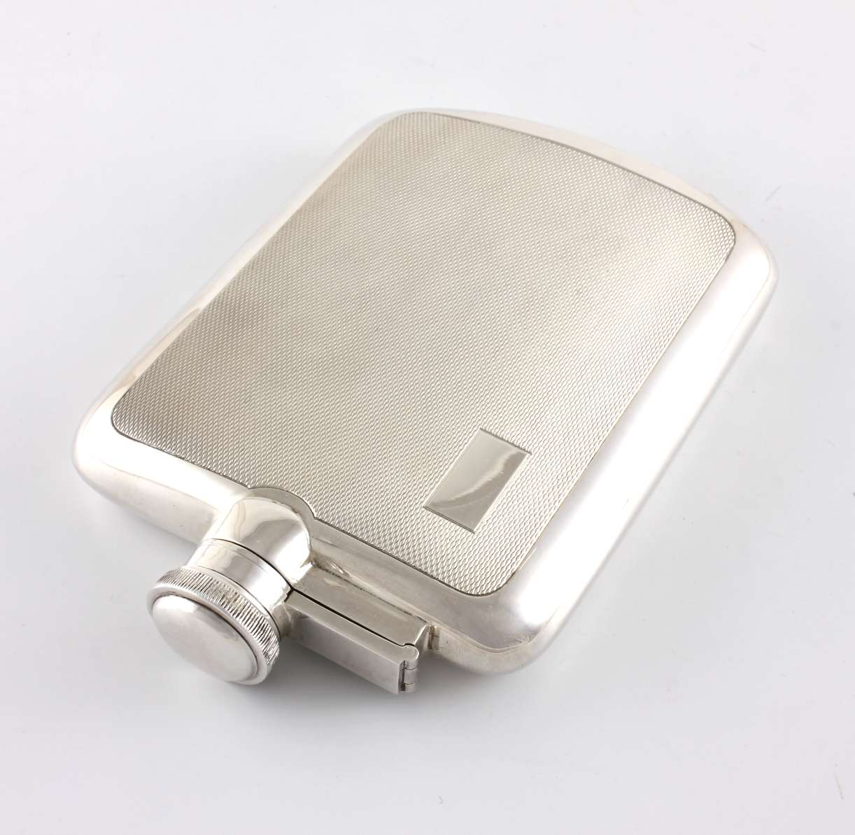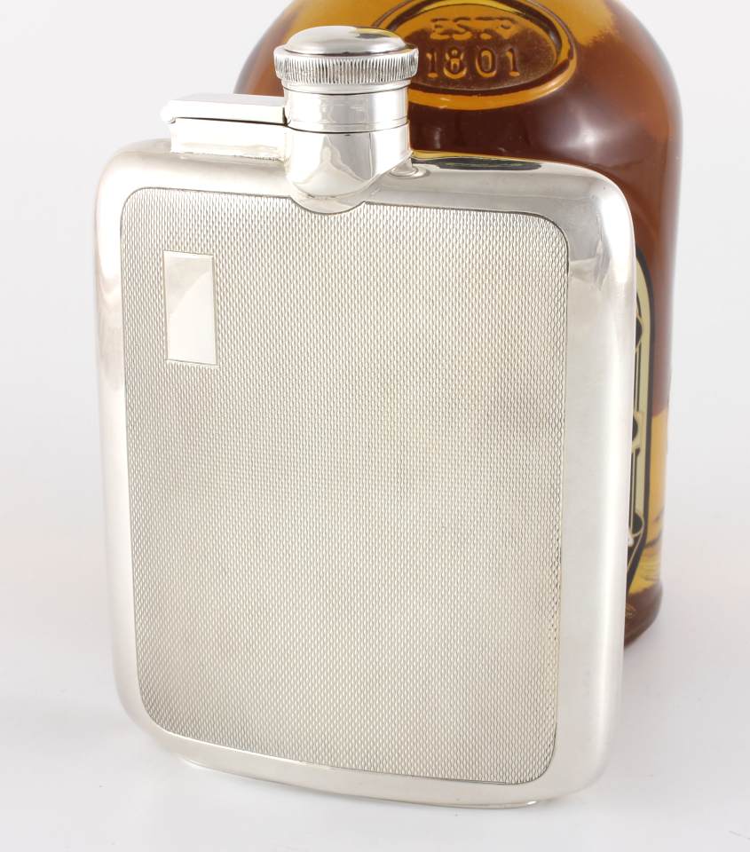 This flask is a good size, has a hinged flip / bayonet top, a wonderful engine turned design to the body and the top left corner has a blank cartouche so could be engraved if you so wished.