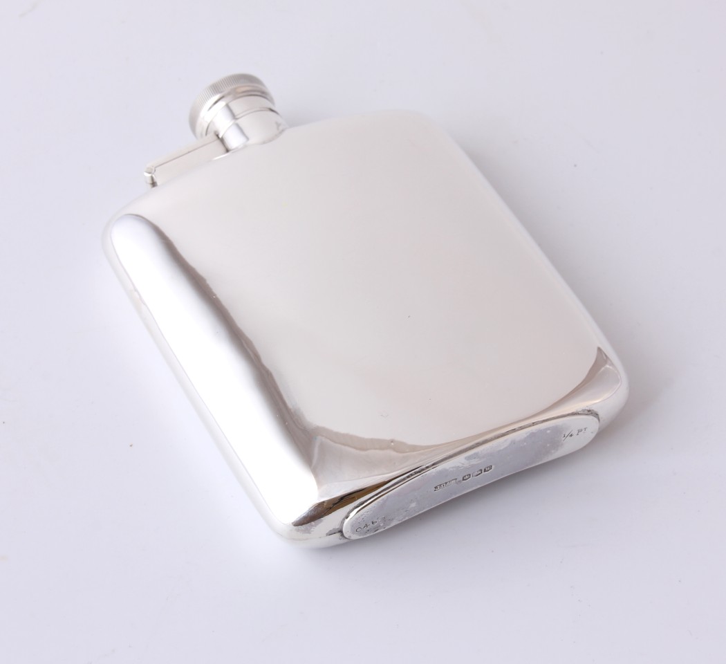 The body of the flask is curved so it sits nicely in a pocket and the body, top and hinge are nicely hallmarked. The whole piece is in fabulous condition with the top sealing well and does not leak. The flask is marked to the bottom with 1/4 pt so holds 1/4 pint (4 3/4 fl oz. 140 ml).
