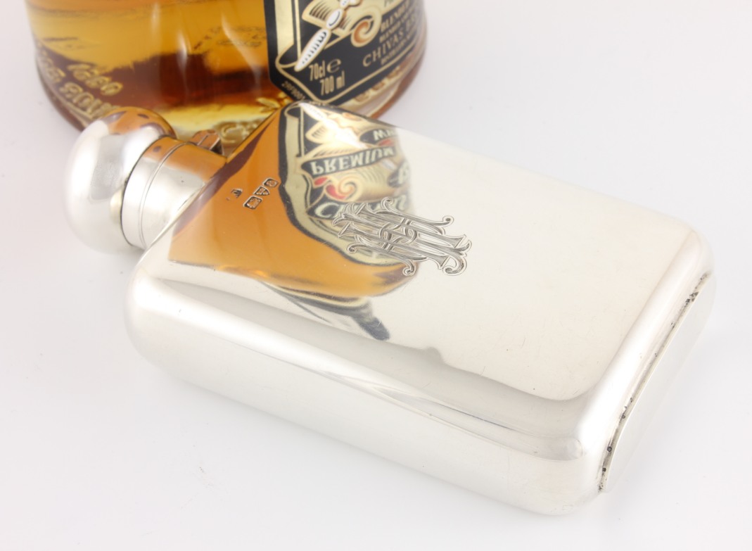 This tactile Edwardian spirit hip flask which is made of silver is fully hallmarked for Chester 1905, has a hinged flip / bayonet top and is made by Colen Hewer Cheshire.