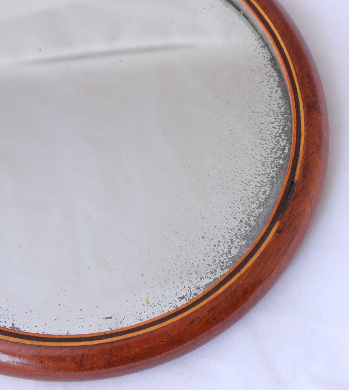 This fantastic antique Sorcerer's mirror has a round mahogany frame and is very unusual as it has a blue glass plate with nine small convex mirror lenses to one side and an original plain mirror to the other side. The mirror glass in the plain side is slightly distressed and foxed which gives an attractive look. The mahogany frame has boxwood inlay on both sides.