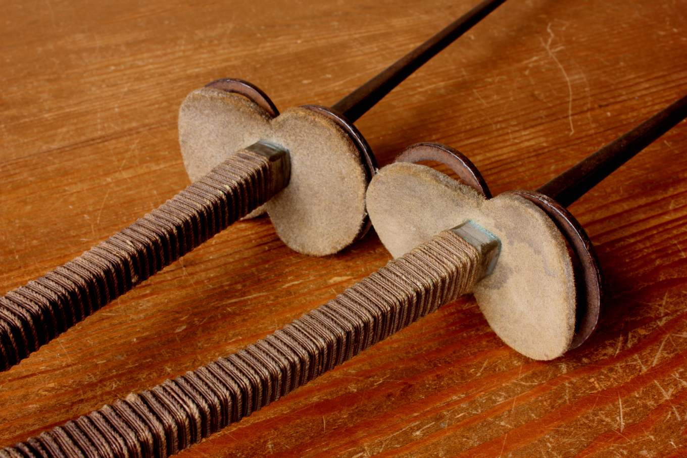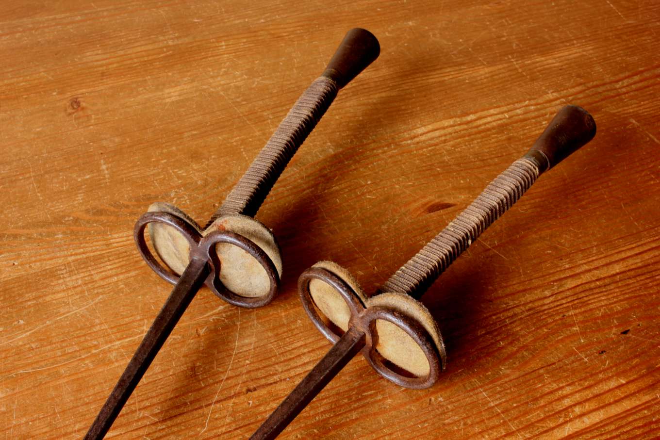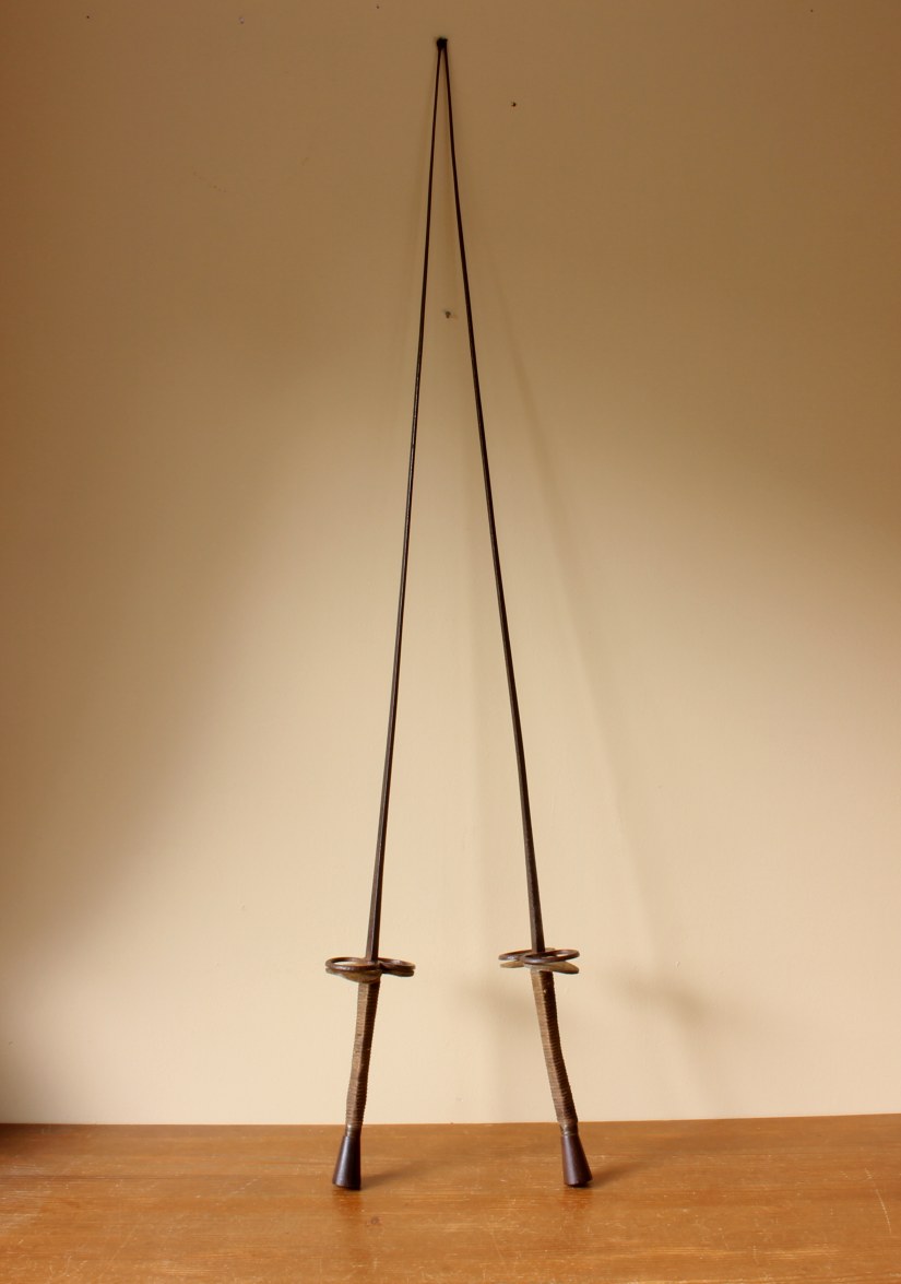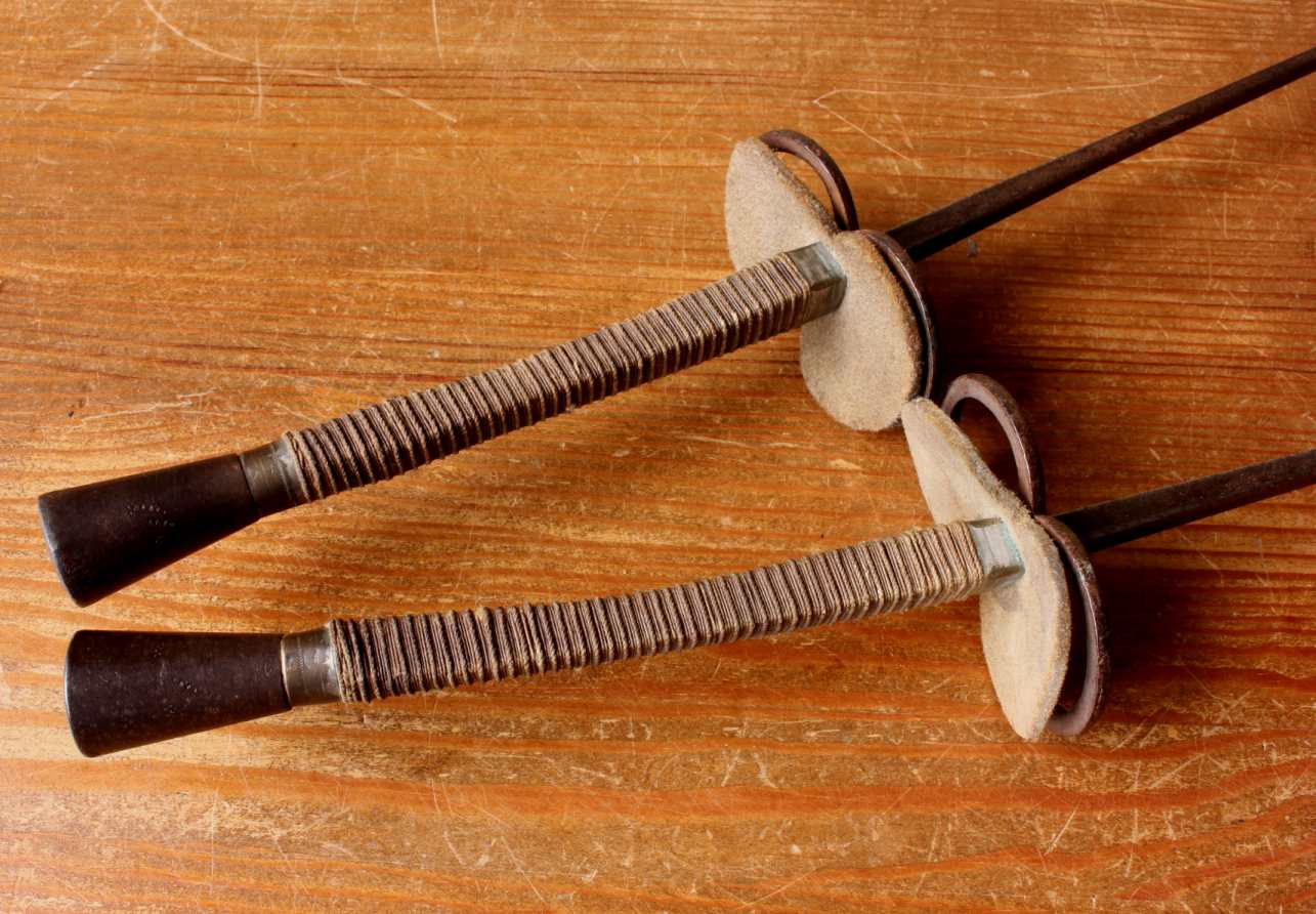 This interesting antique pair of French fencing foils / epees which have steel blades, brass and leather guards, brass pommels and bound grips on rectangular wooden handles are marked Souzy Aine Paris to one of the blades.