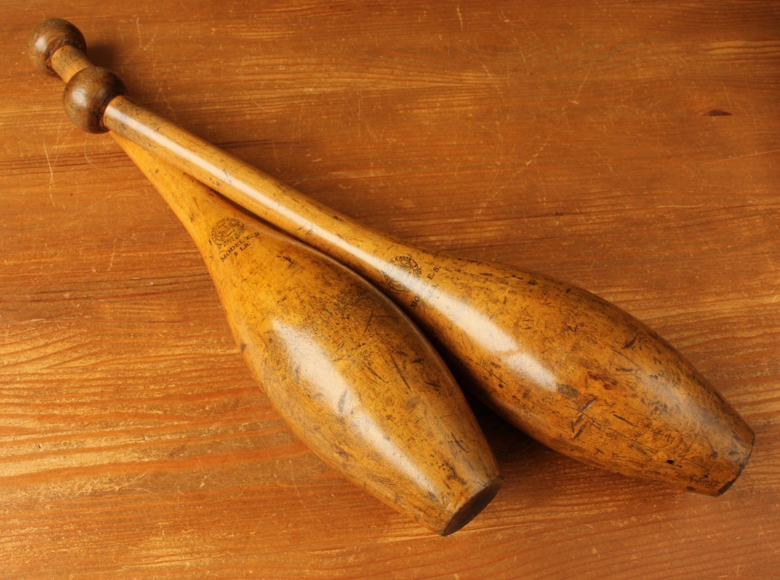 Indian clubs are a type of exercise equipment used for developing strength. They were swung in certain patterns as part of an exercise program and were popular in the late 1900s and early 20th century.