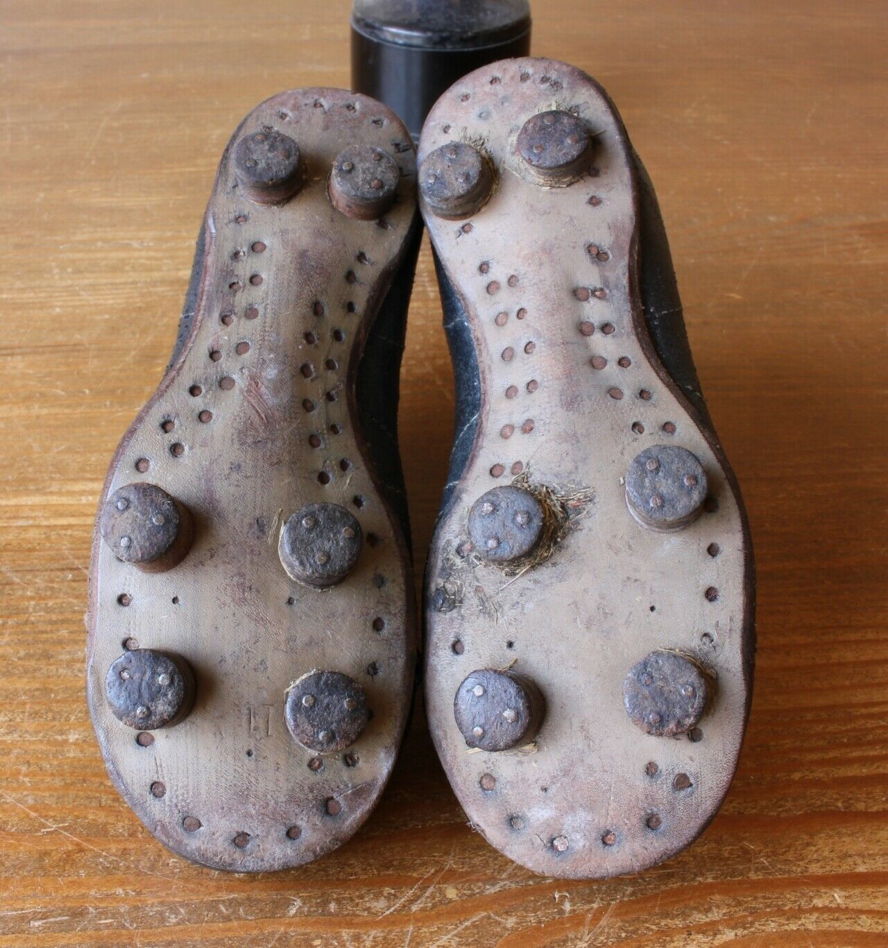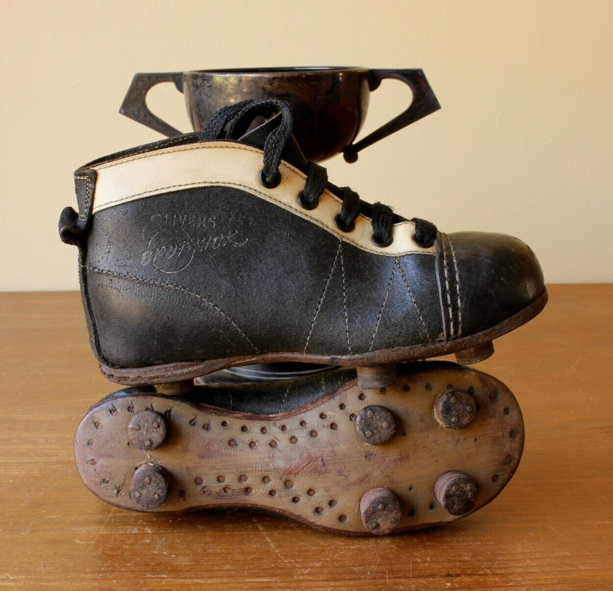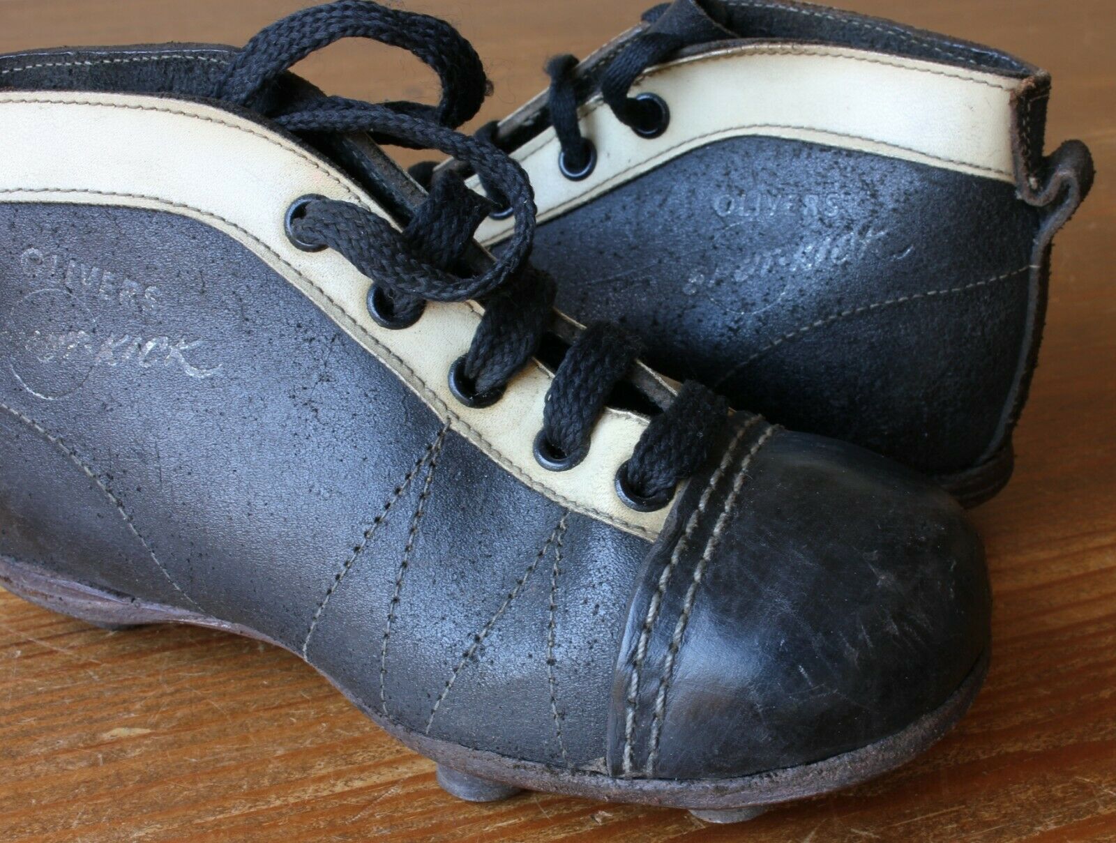 This pair of Olivers Spot-Kick football boots which date from c1950 are made of black leather with white edging, have leather soles and nailed on studs.