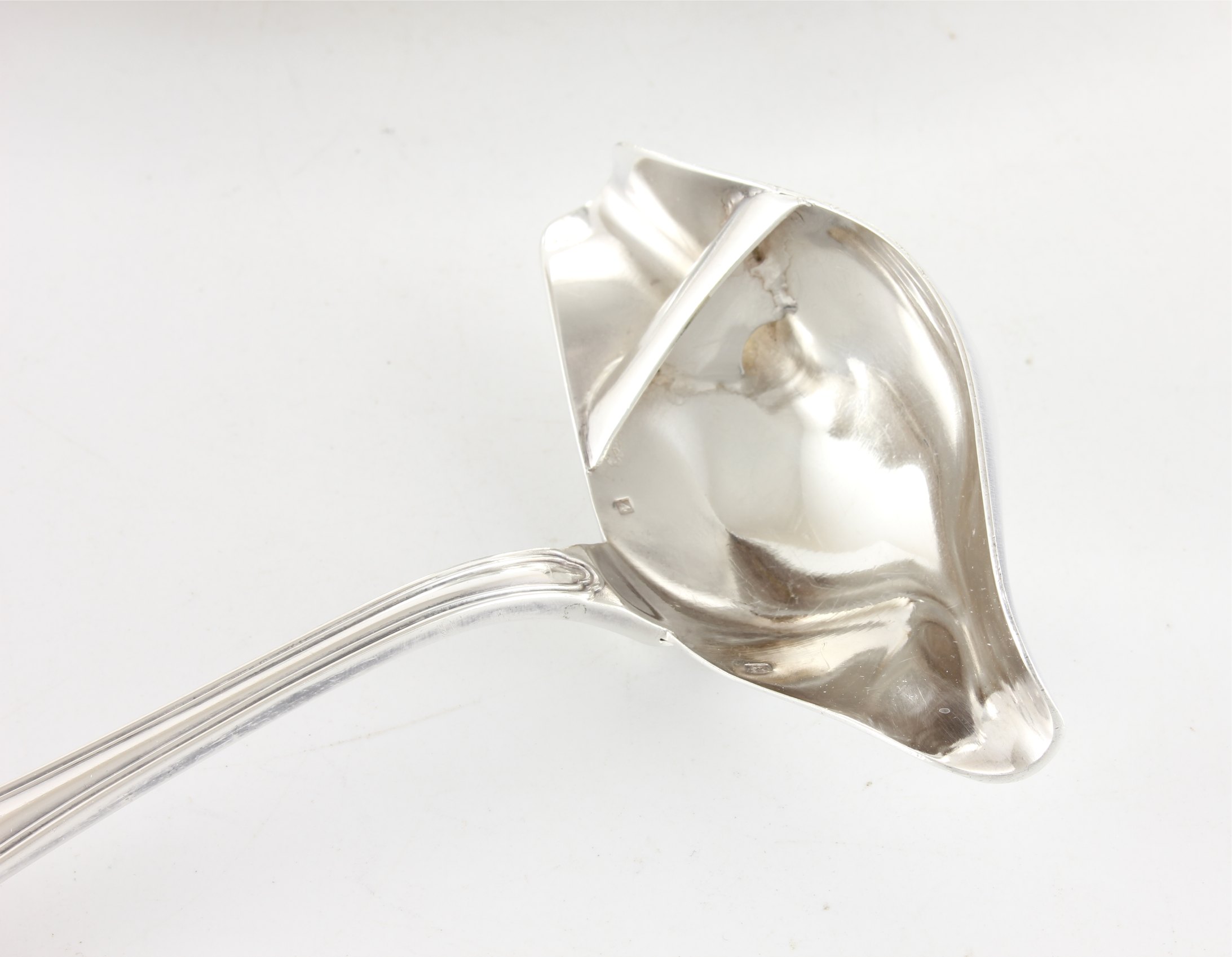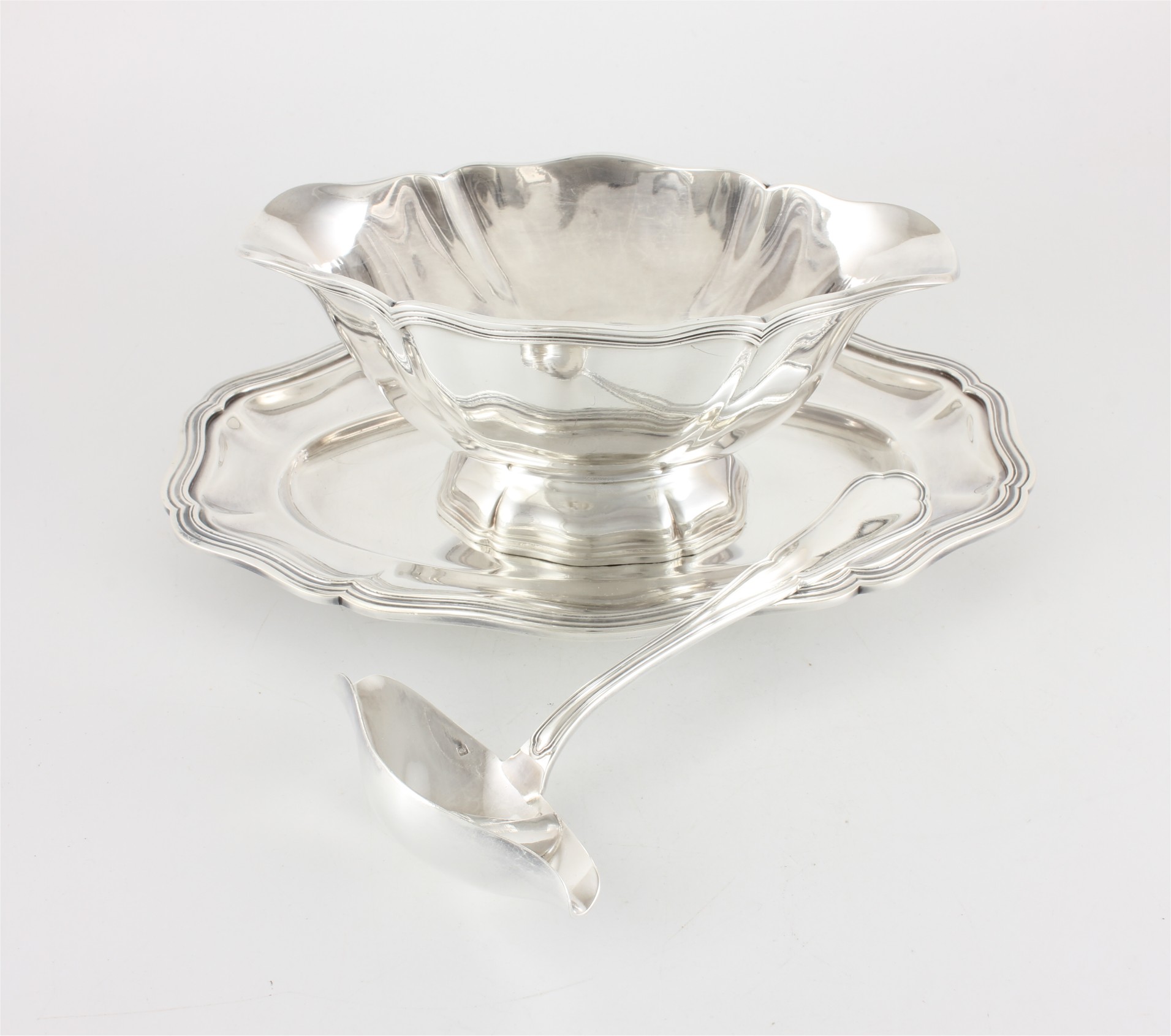 This sauciere has a wonderful wavy design and sits on it's attached underplate that is marked to the underside with the French maker's marks. This sauce bowl comes with it's St Medard silver plated sauce ladle.