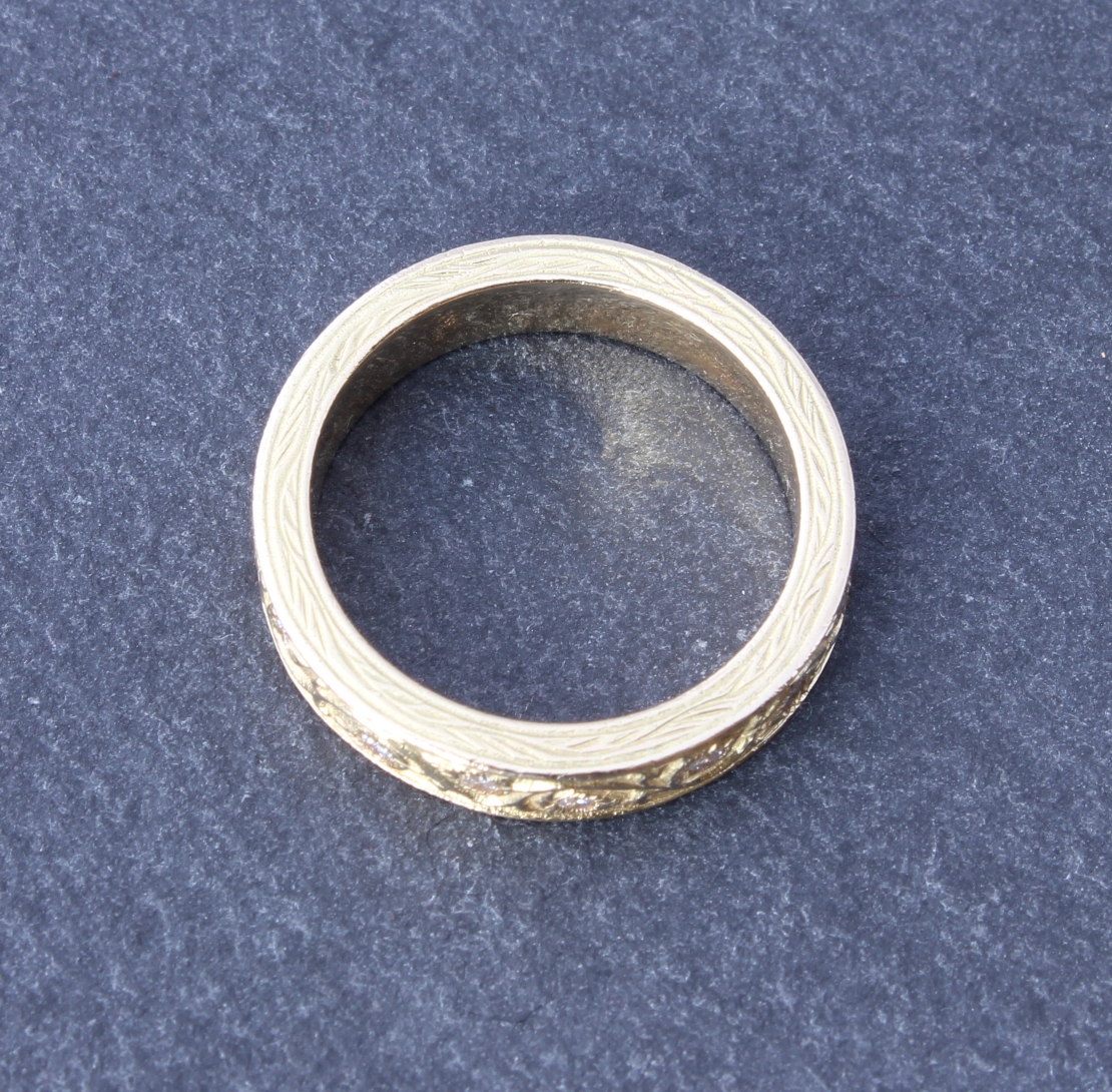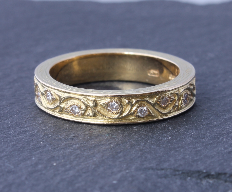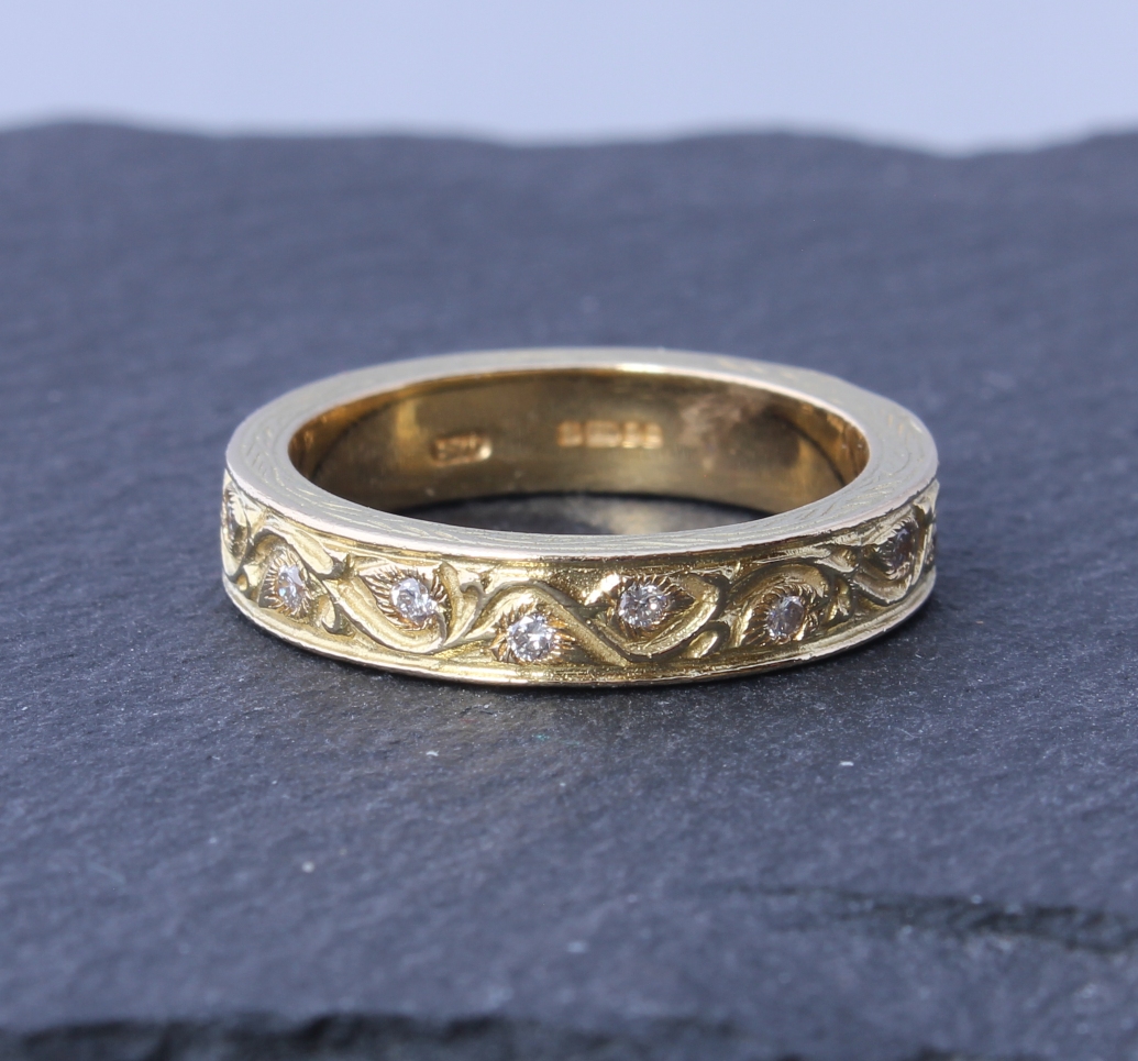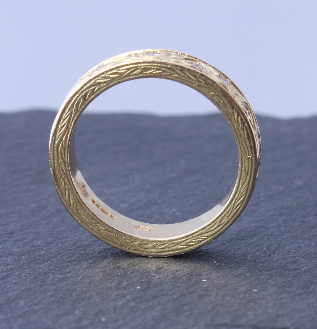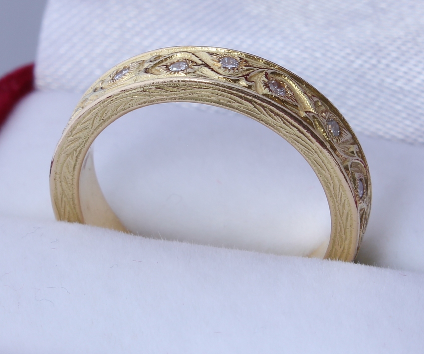 This fabulous diamond ring is crafted by the renowned jewellery designer Stephen Webster in 18ct yellow gold. This beautiful ring features hand engraving like filigree detailing and 16 natural diamonds totalling approx 0.25ct. A really wonderful and stylish eternity or wedding ring from a top designer.