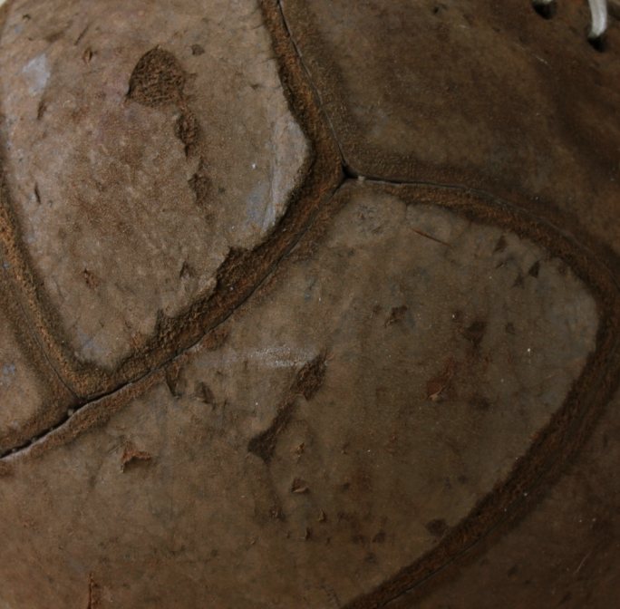 This ball is made of brown suede leather, is fitted with a new bladder so is inflated and holds it's shape well for display.