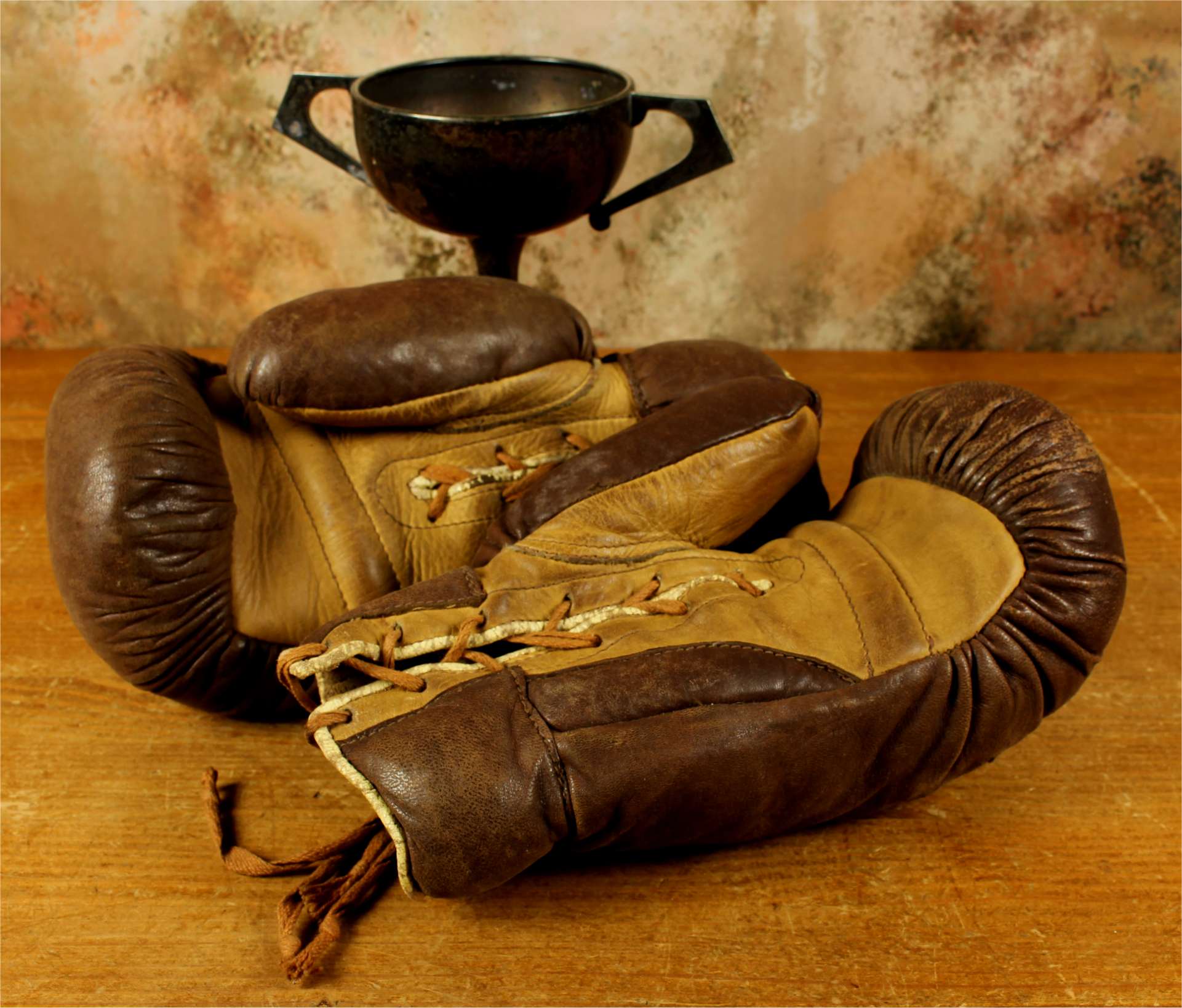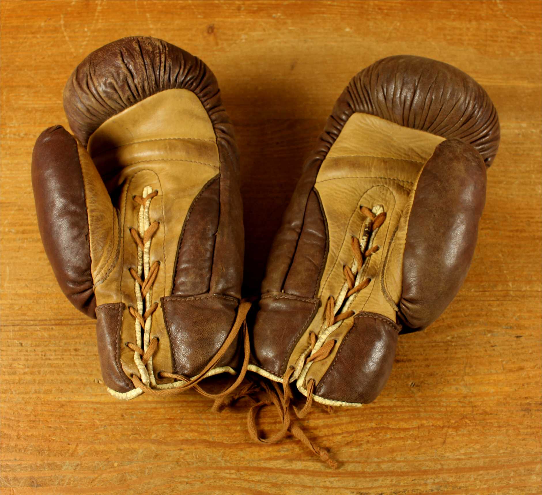 This handsome pair of true vintage brown and tan leather lace up boxing gloves which are made by Sykes date from c1930, are straw filled and feature the Sykes, Horbury, England brand label.