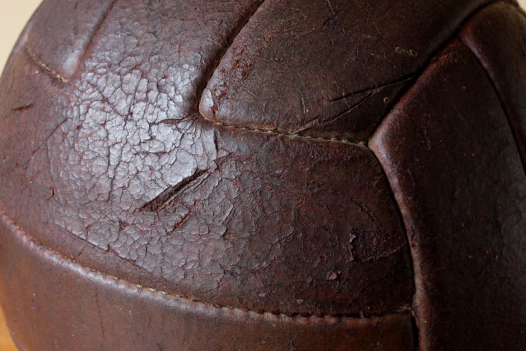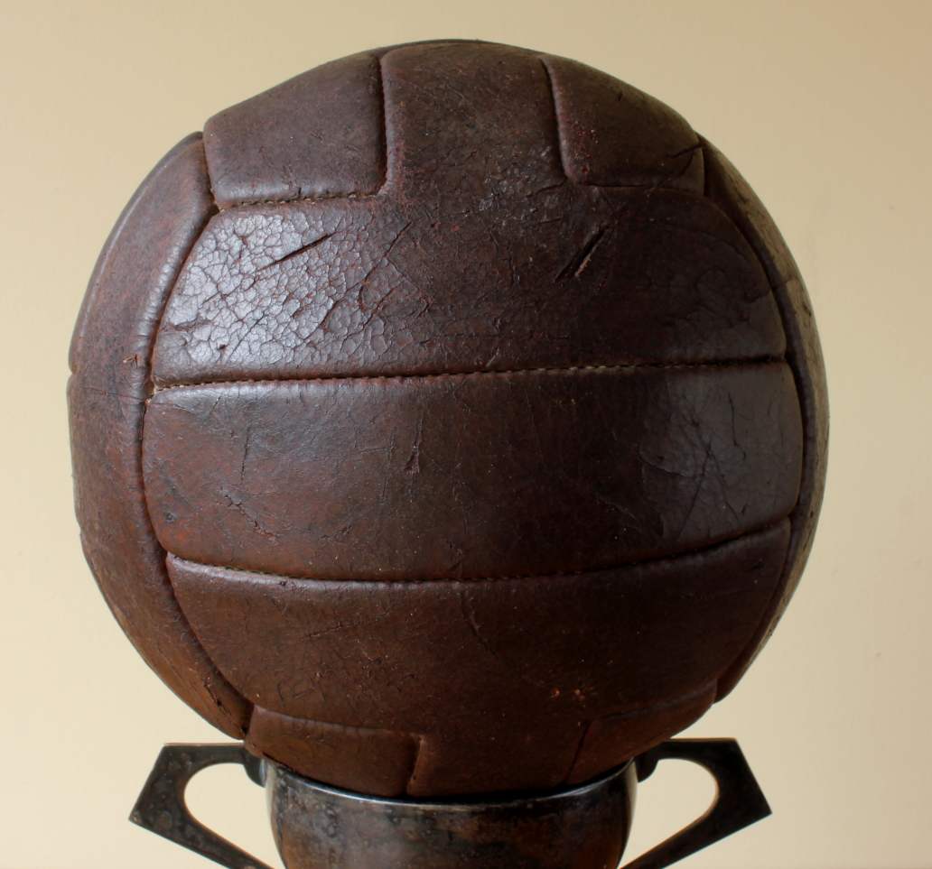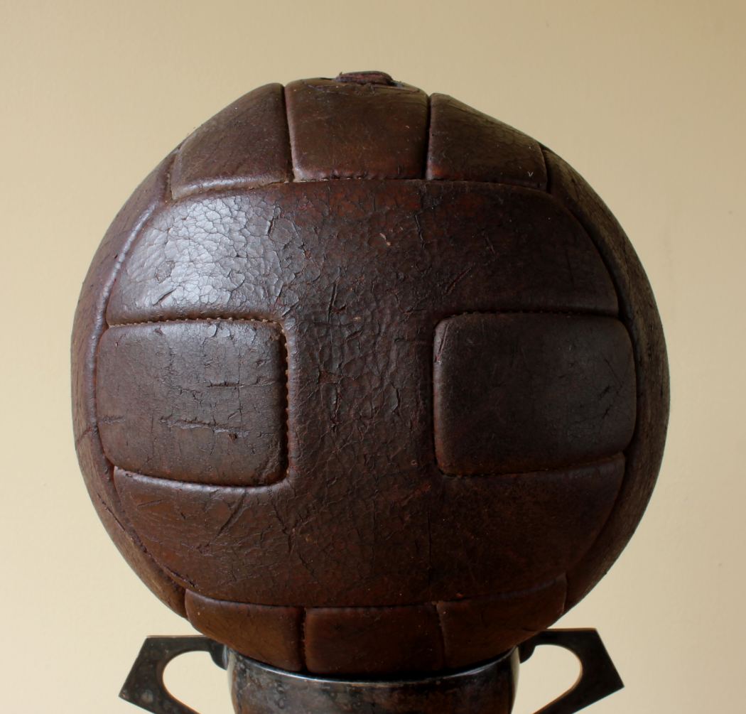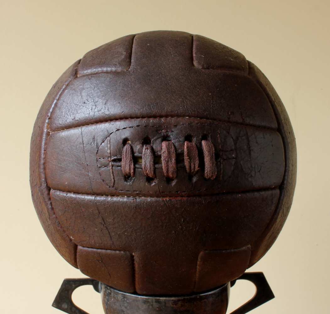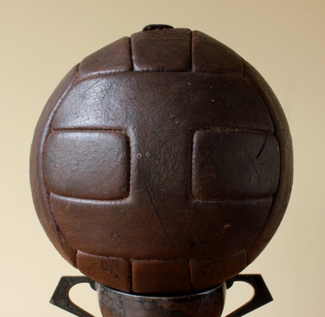 This original leather football which dates from the 1930's is a T panel design ball that is well made with excellent quality stitching, thick brown leather and 5 pairs of lace holes. A bladder is fitted inside which is inflated.