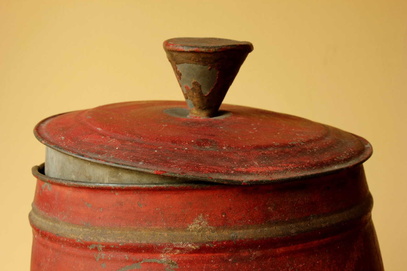 This red jar has a wonderful shape with faded gold detailing and a nice patina giving it just the right look. There is an original shop label to the inside lid with Samois handwritten.