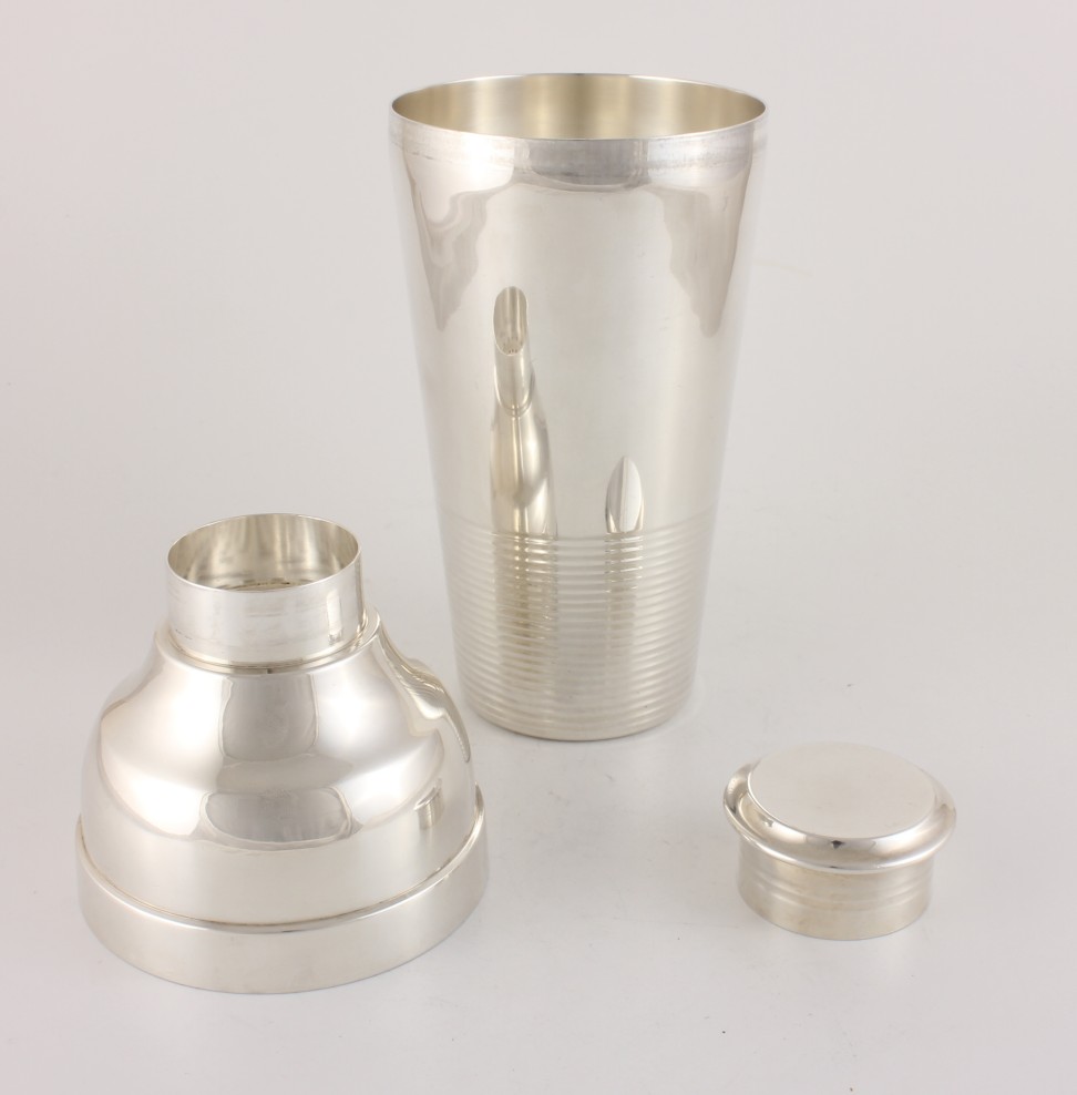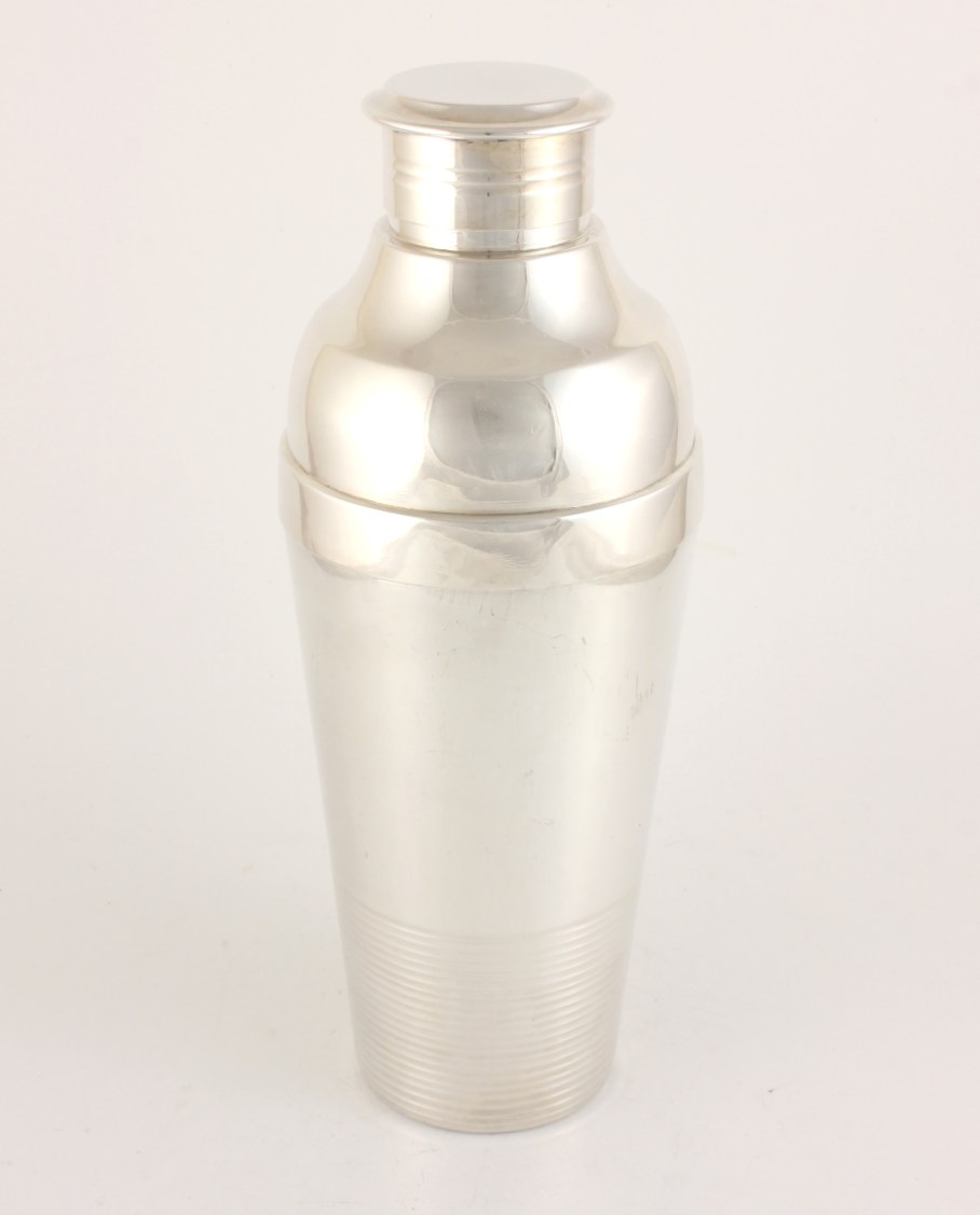This large and impressive French cocktail shaker which is a 3 piece design is made of silver plate by top silversmith Christofle and dates from c1940.