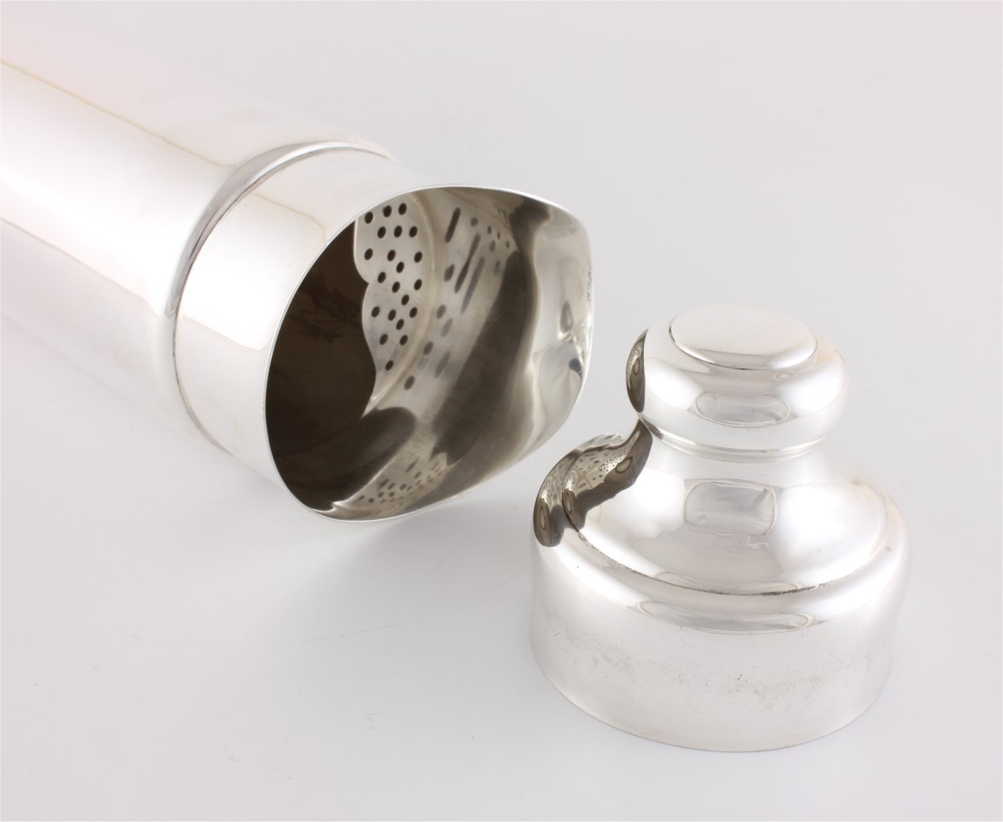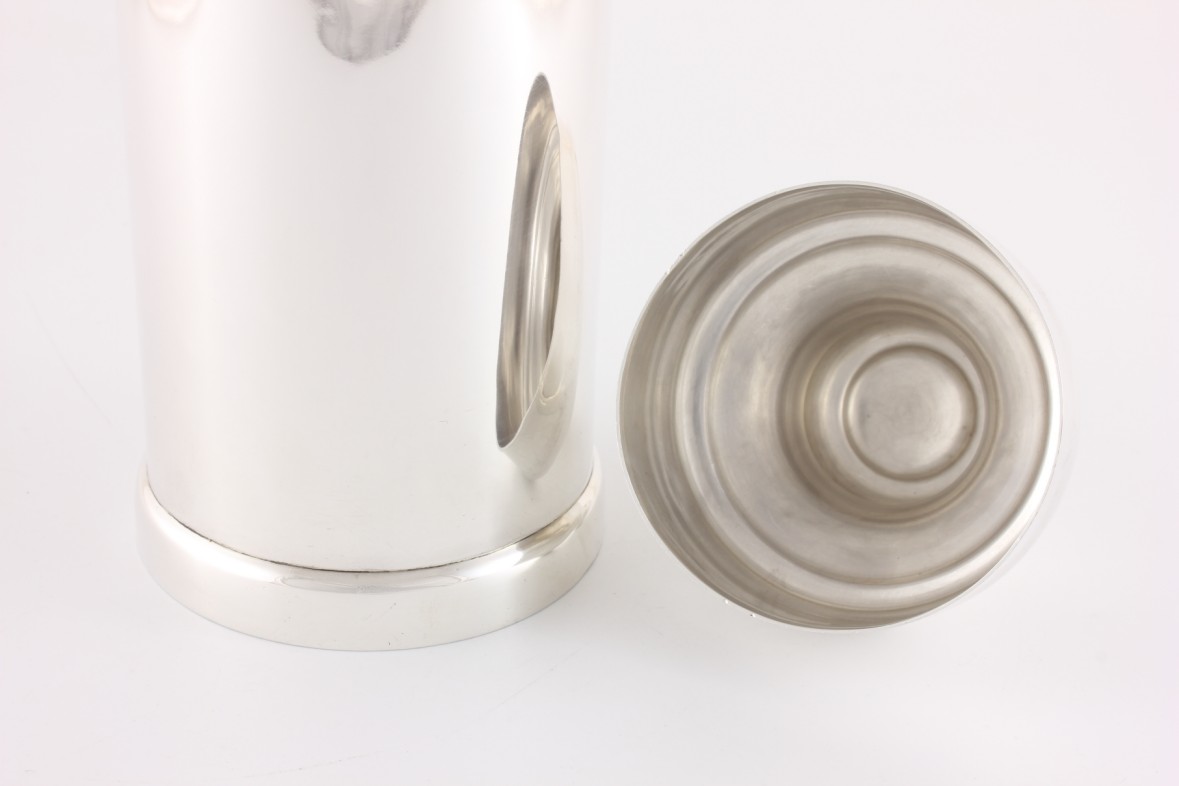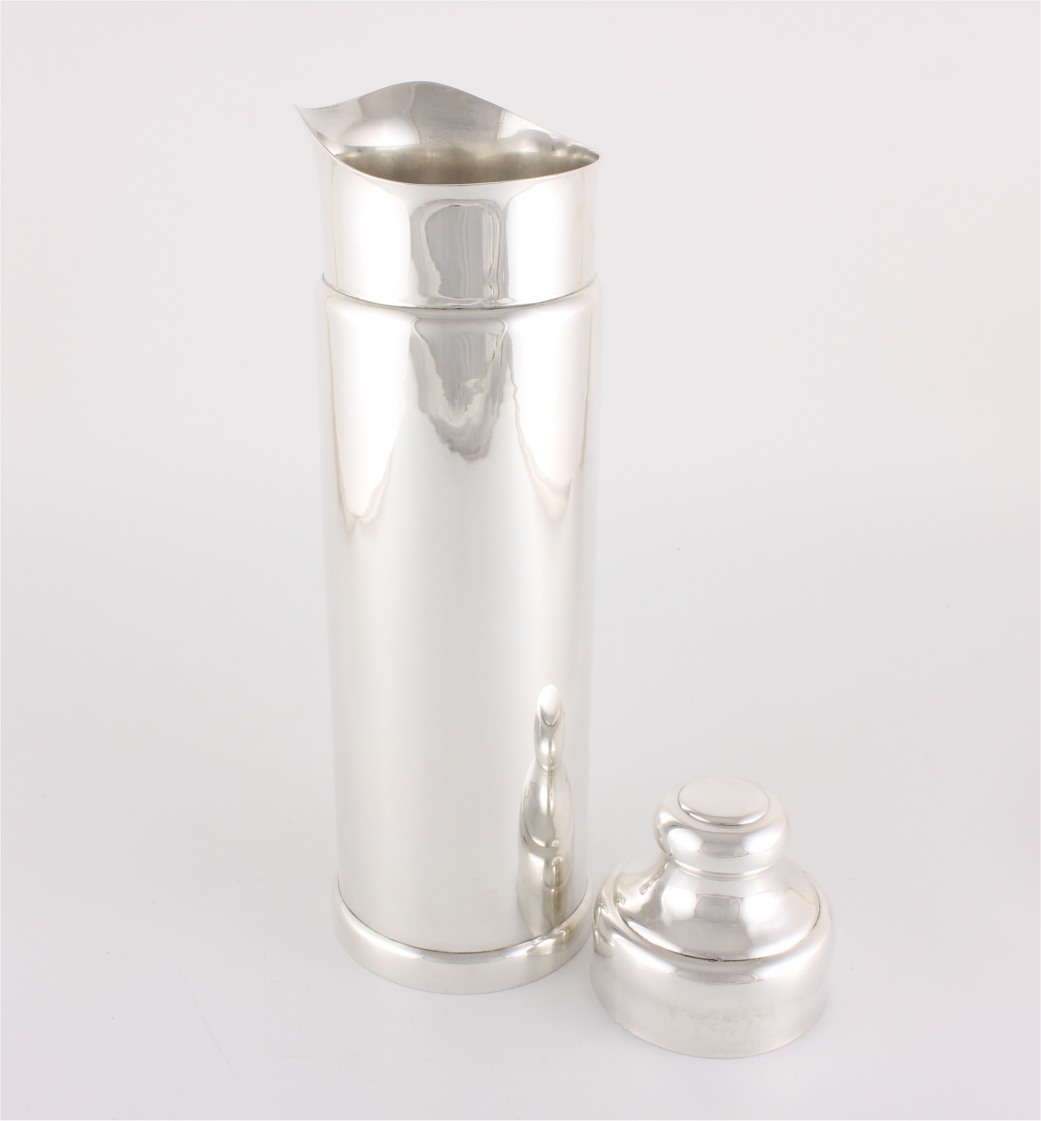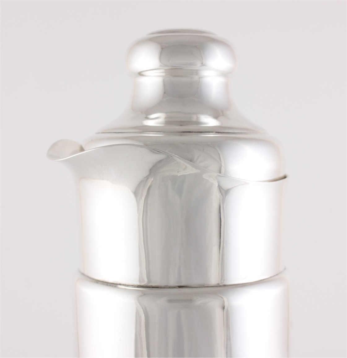 This quality two piece shaker has an usual tall design with a built in strainer and pouring spout. The removable lid has a clever design as it is flexible so seals into the shaker and the underside is marked Sterling with the maker's mark.