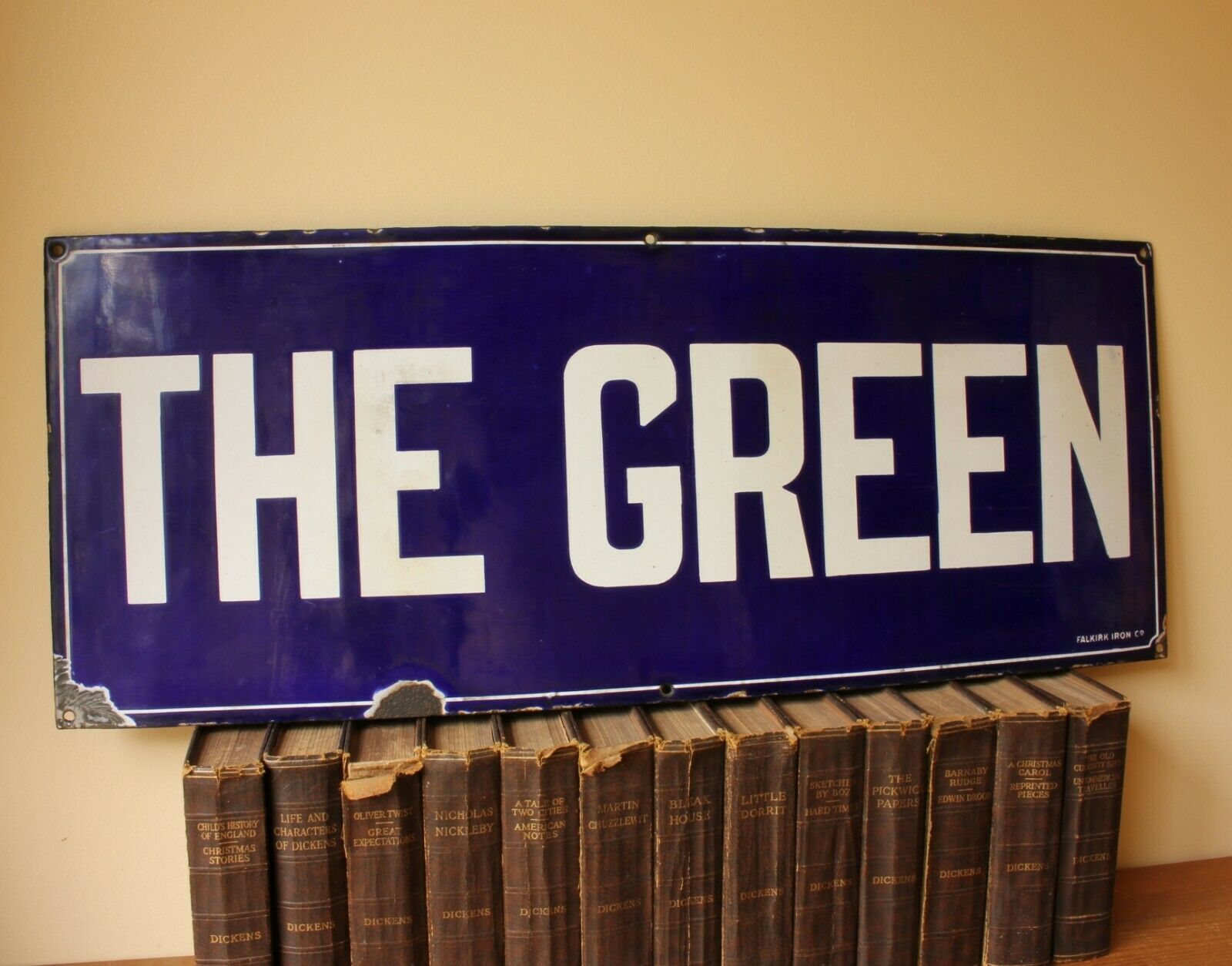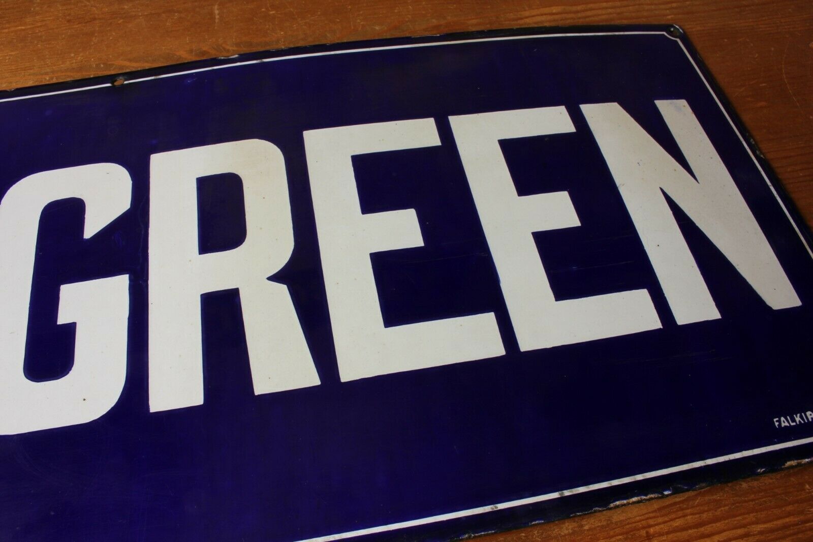This original antique enamel metal sign which is made by Falkirk Iron Co reads 'The Green' in white lettering on a deep blue background and dates from the early 20th century.