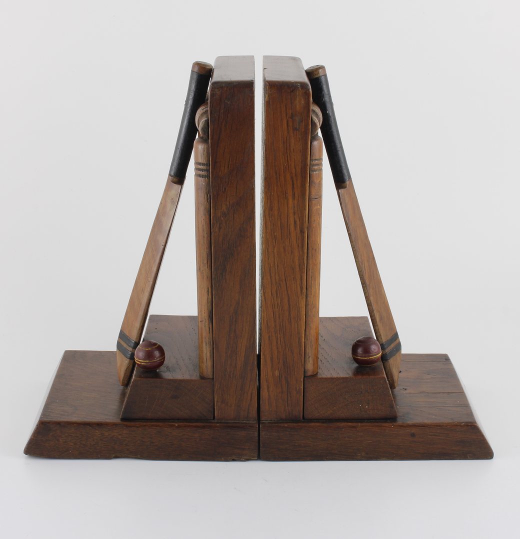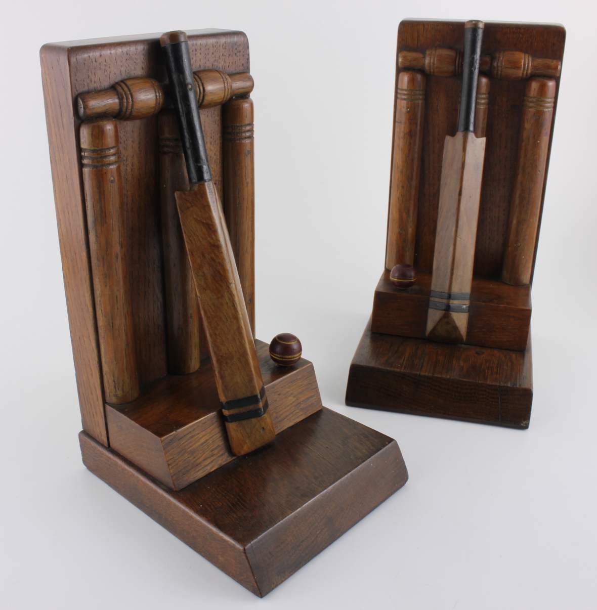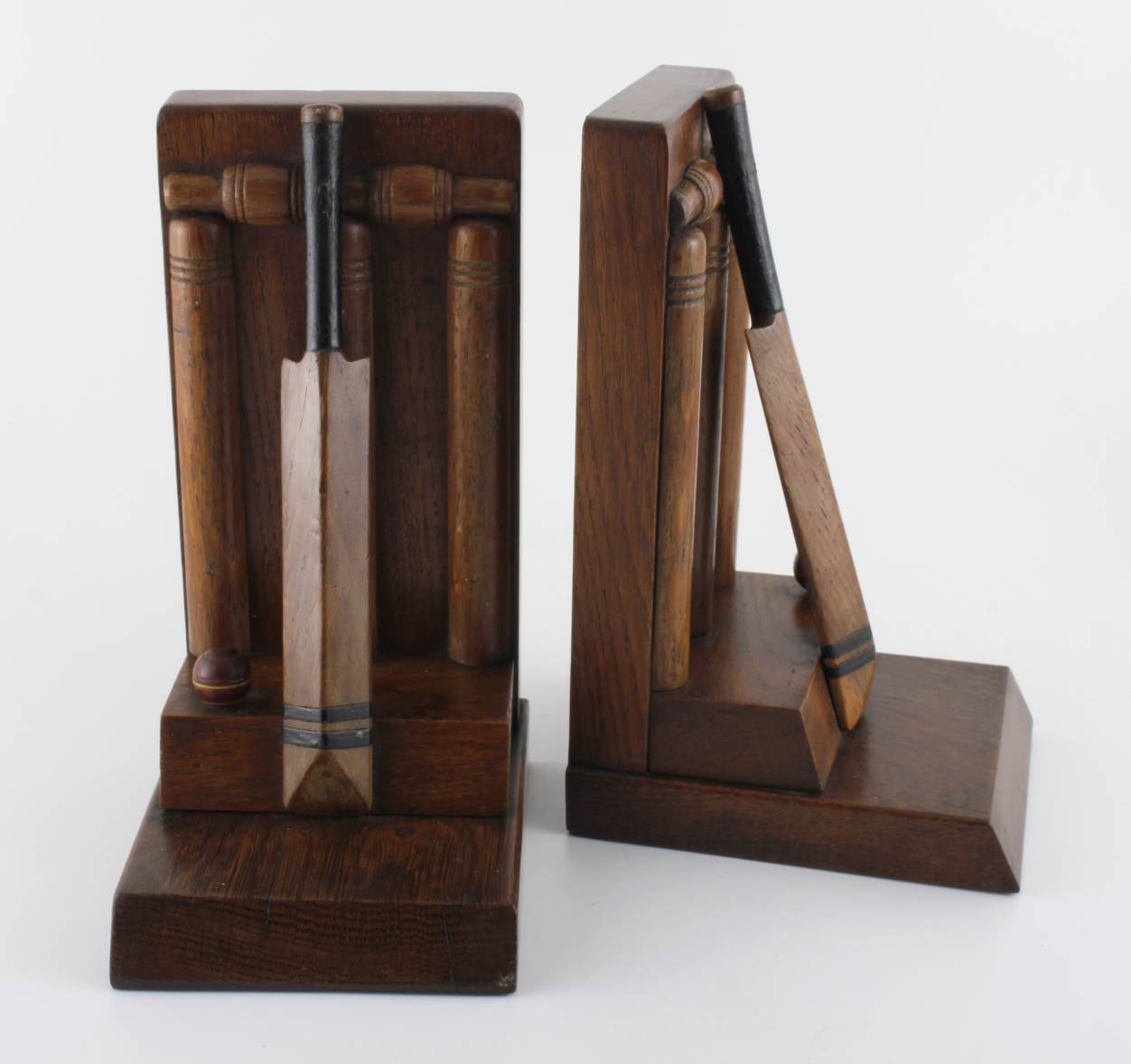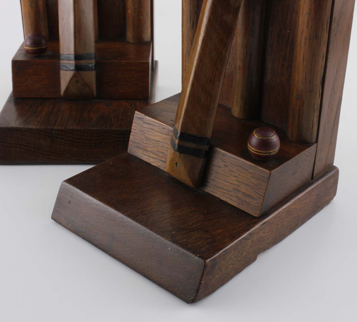 This handsome pair of Art Deco bookends which were handmade by the Thornton-Smith Company in the 1930's are made of oak, have wonderful details and are in the form of cricket stumps with miniature bats and red cricket balls.