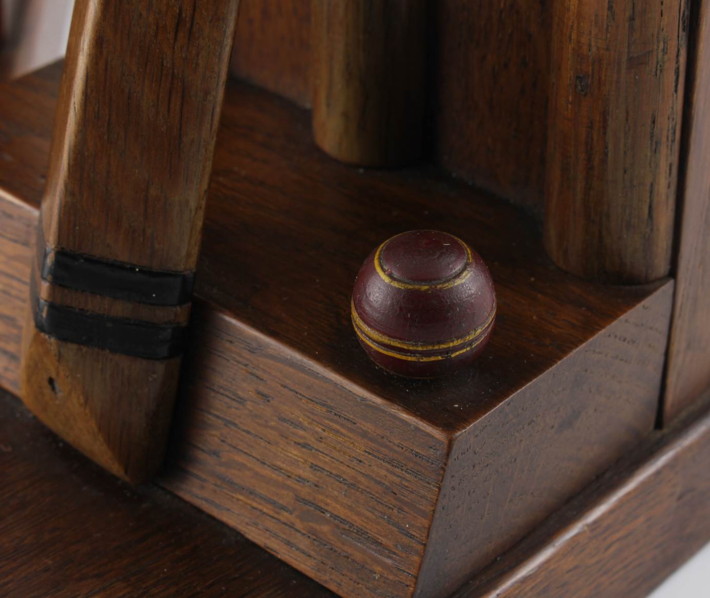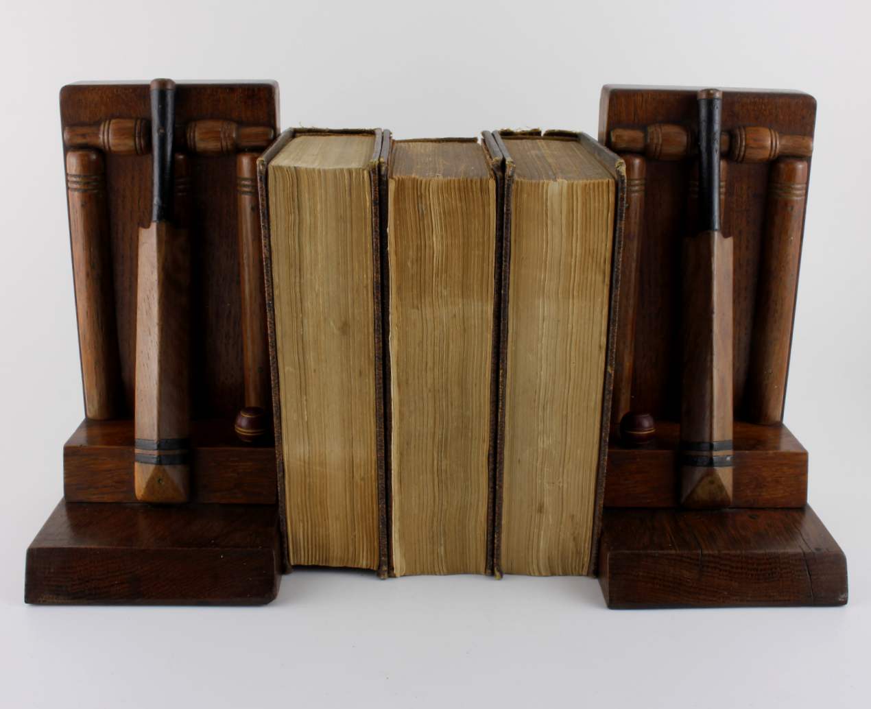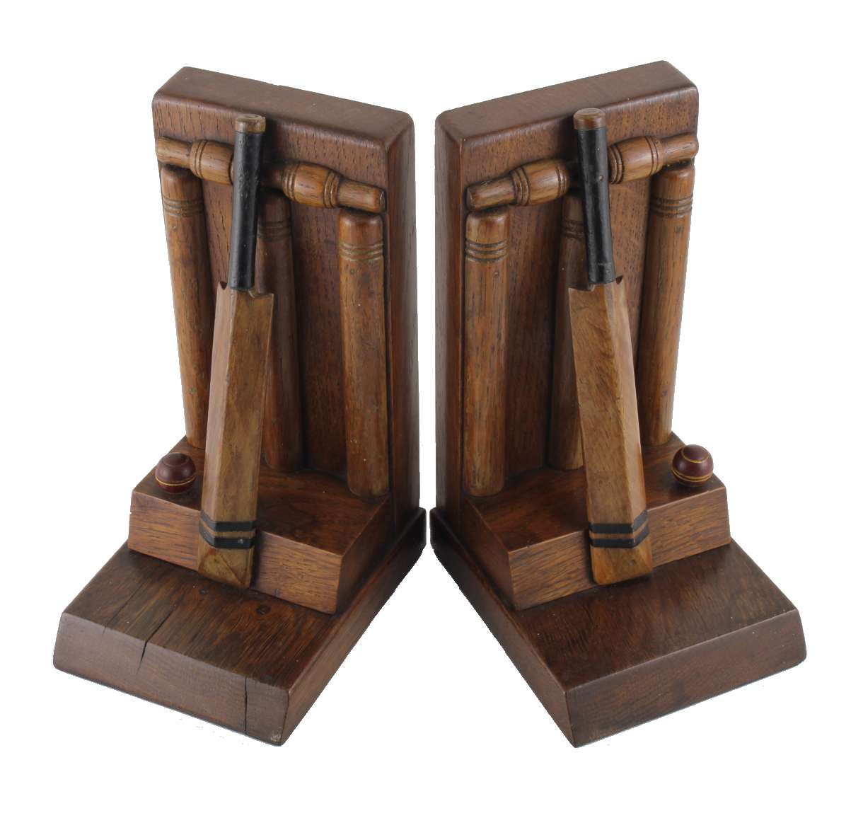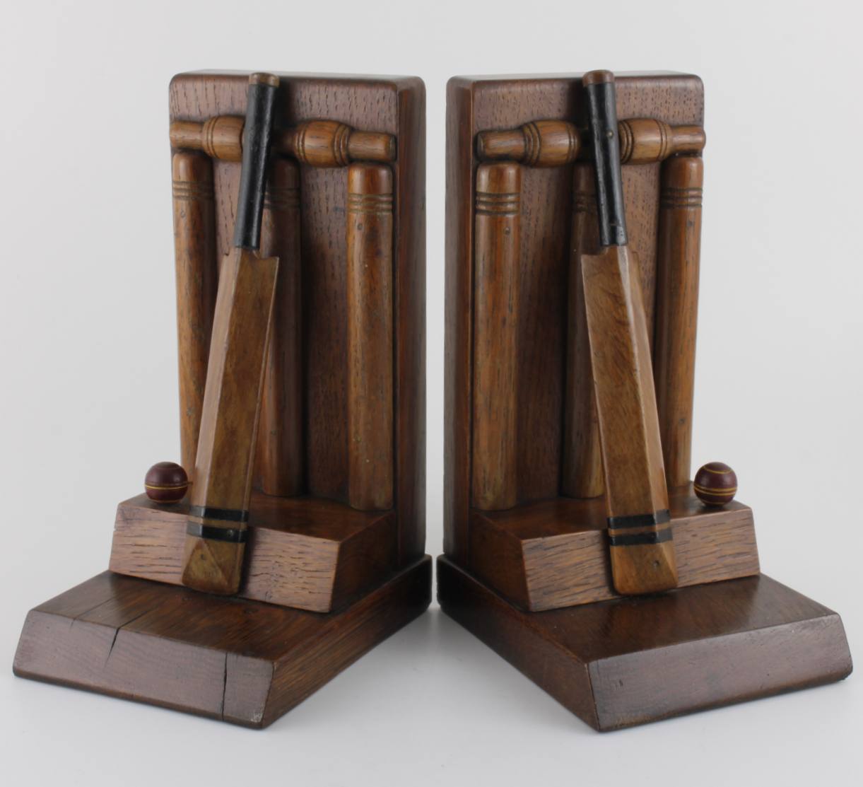 This handsome pair of Art Deco bookends which were handmade by the Thornton-Smith Company in the 1930's are made of oak, have wonderful details and are in the form of cricket stumps with miniature bats and red cricket balls.