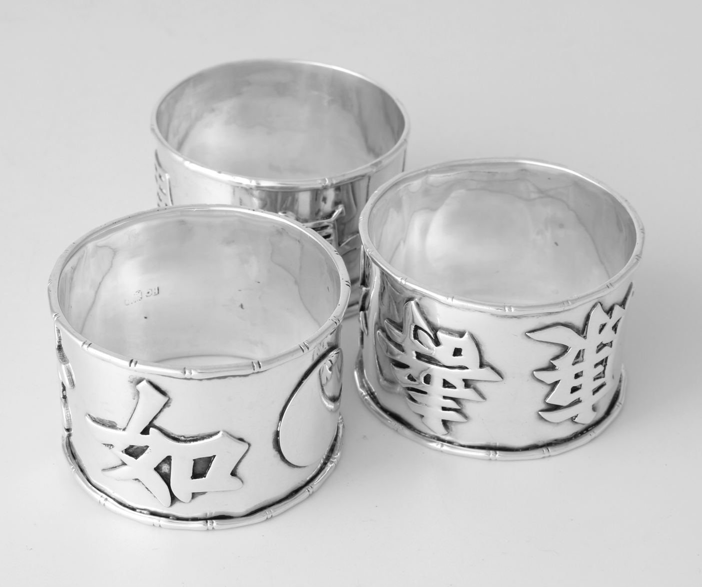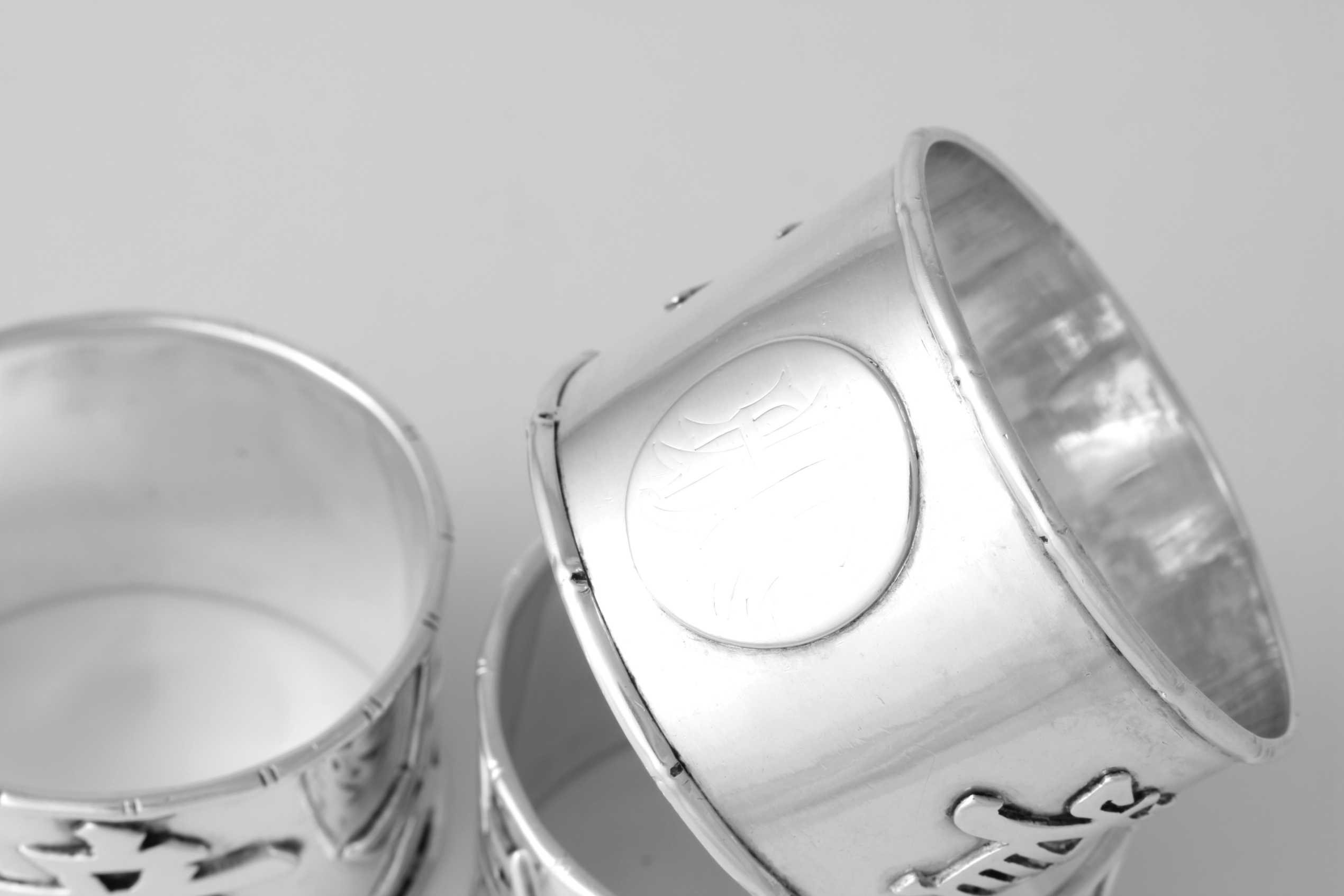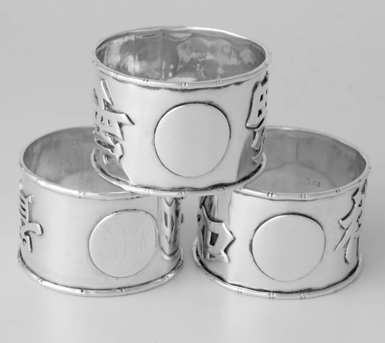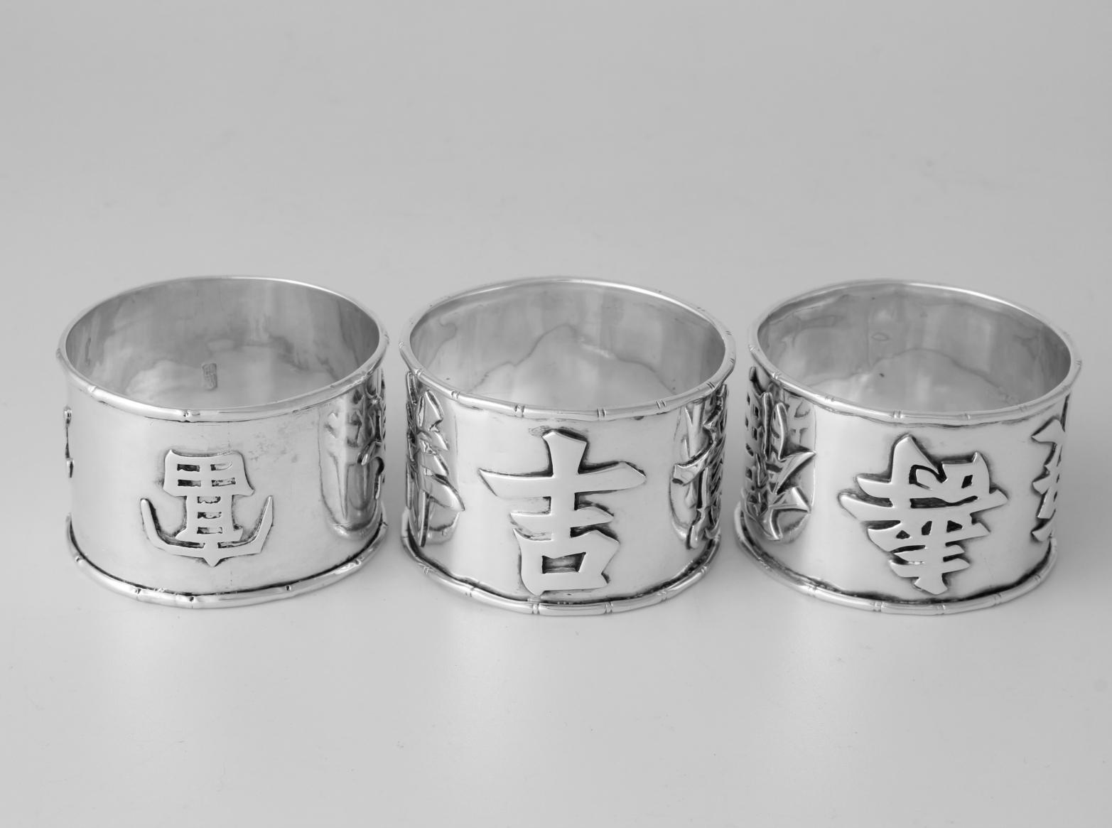 These napkin rings feature Chinese characters around the outside and each one is also marked with a Chinese character hallmark inside with two having HC most likely for Hung Chong.