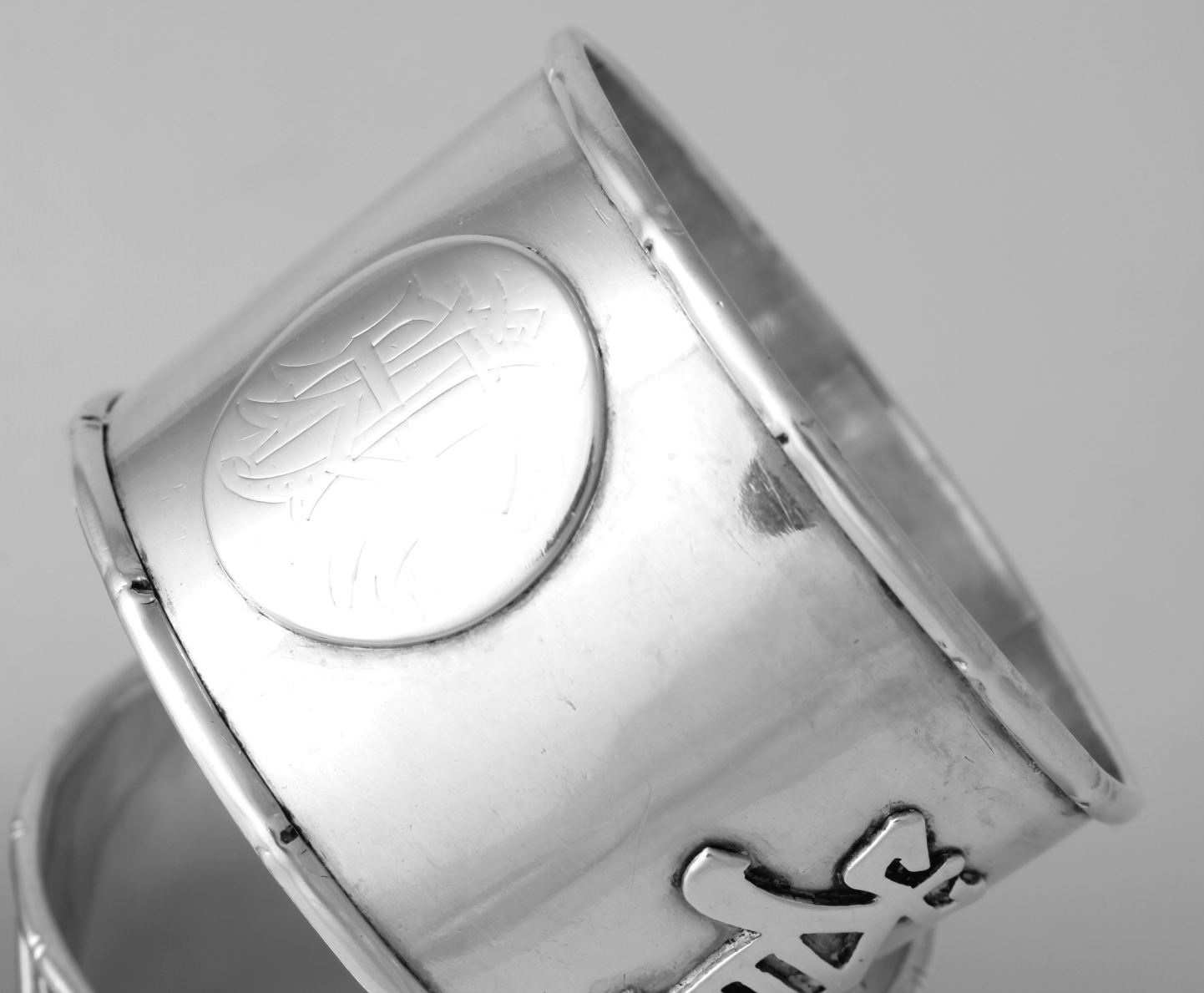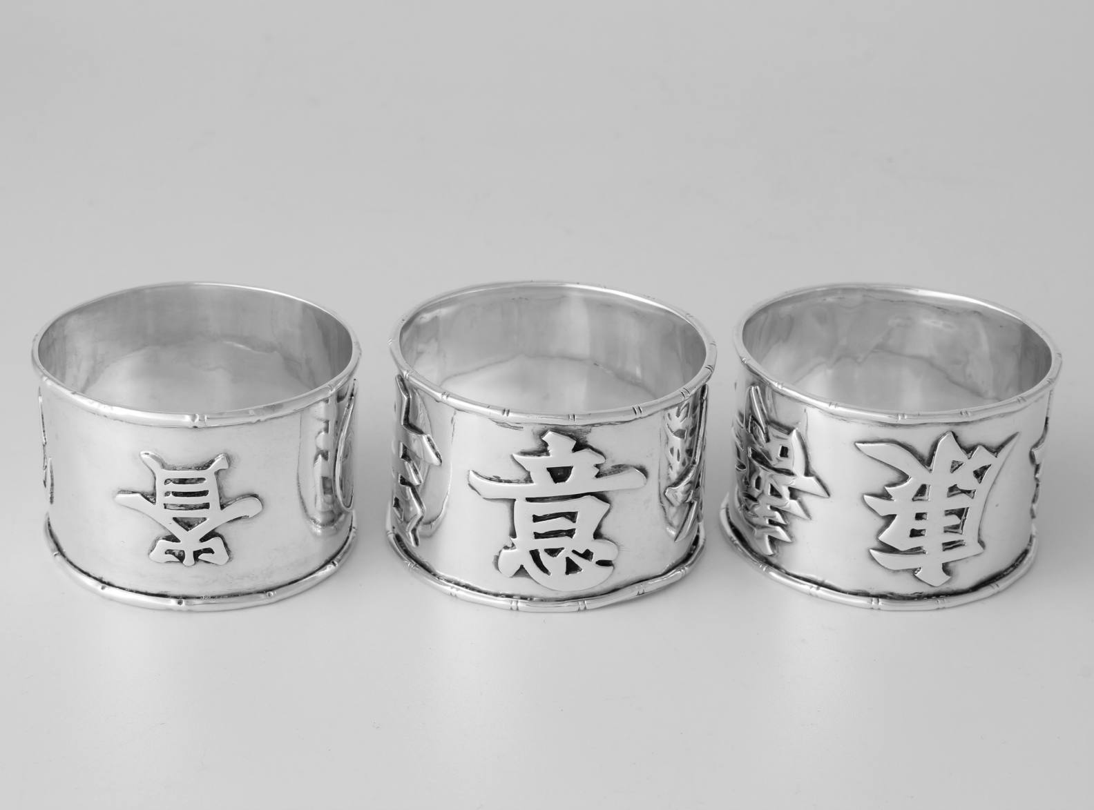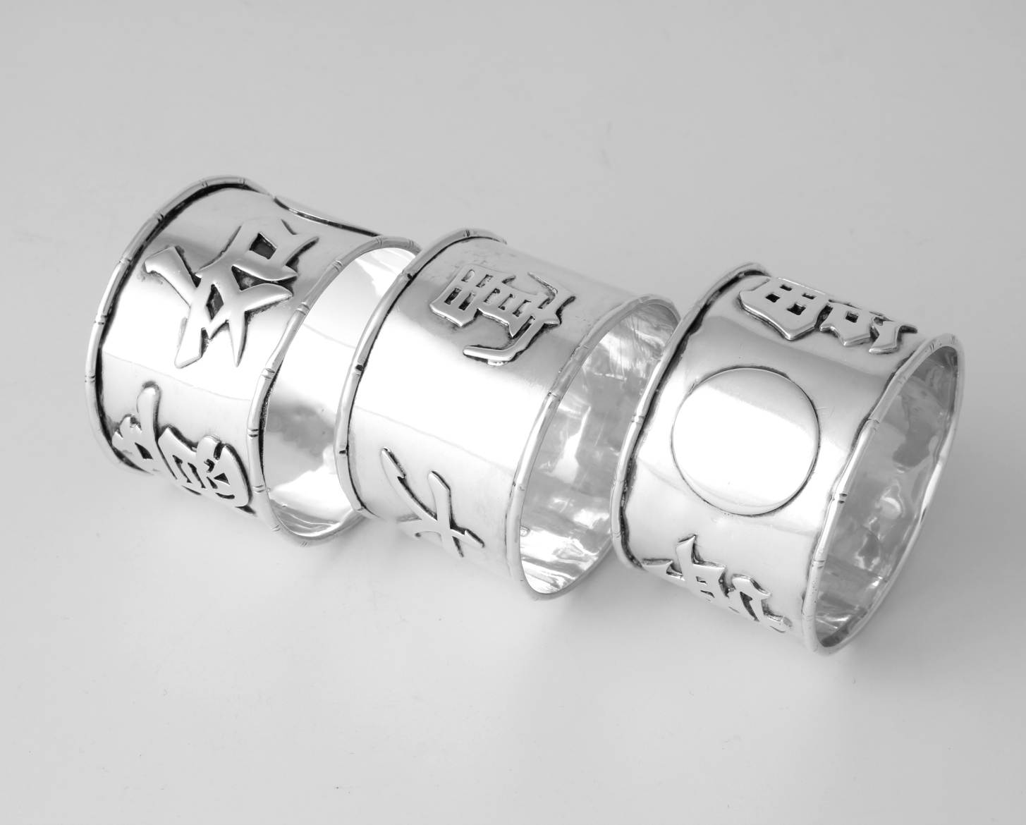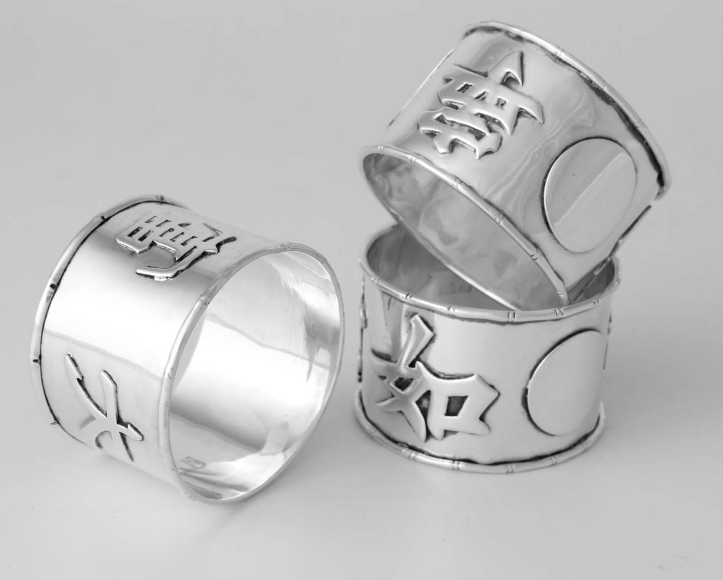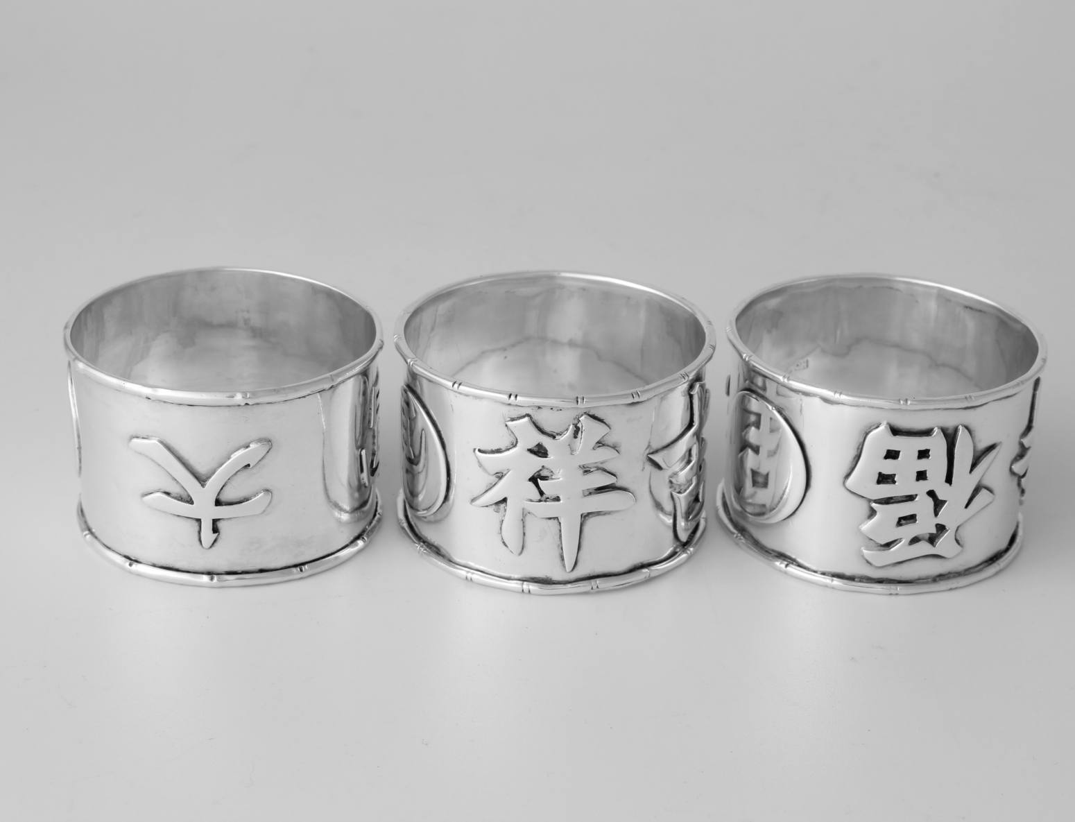 These napkin rings feature Chinese characters around the outside and each one is also marked with a Chinese character hallmark inside with two having HC most likely for Hung Chong.