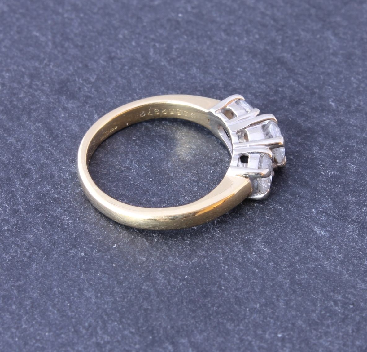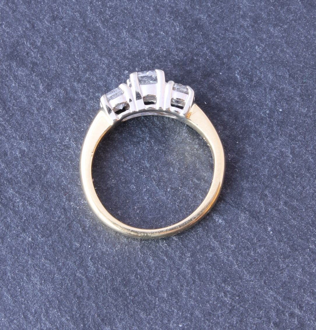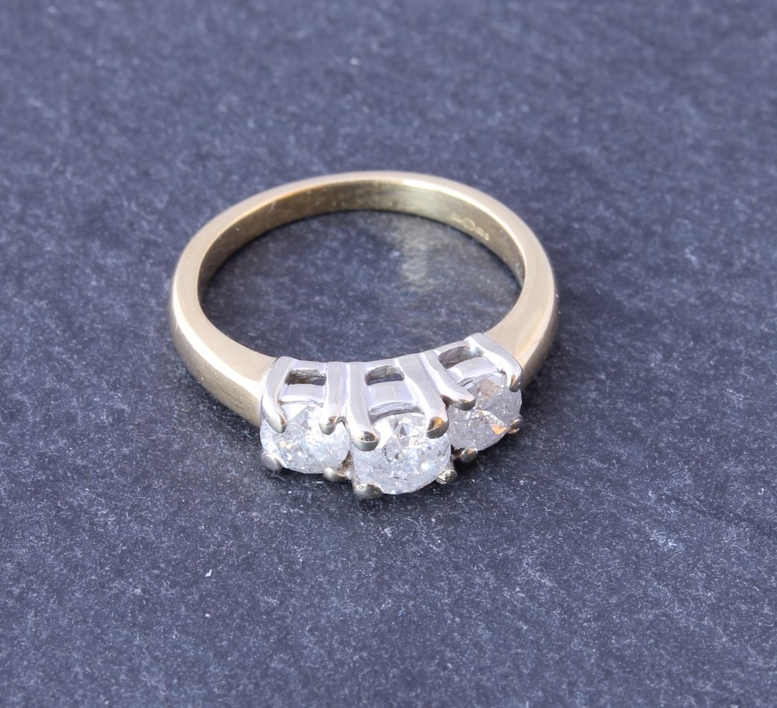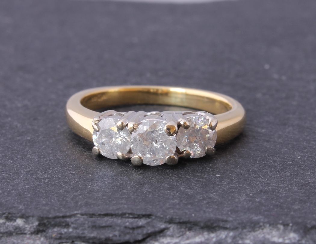 This beautiful 18ct yellow gold three stone ring has 3 graduated brilliant-cut natural diamonds that total est 1.08 carats and are set into a white gold mount.