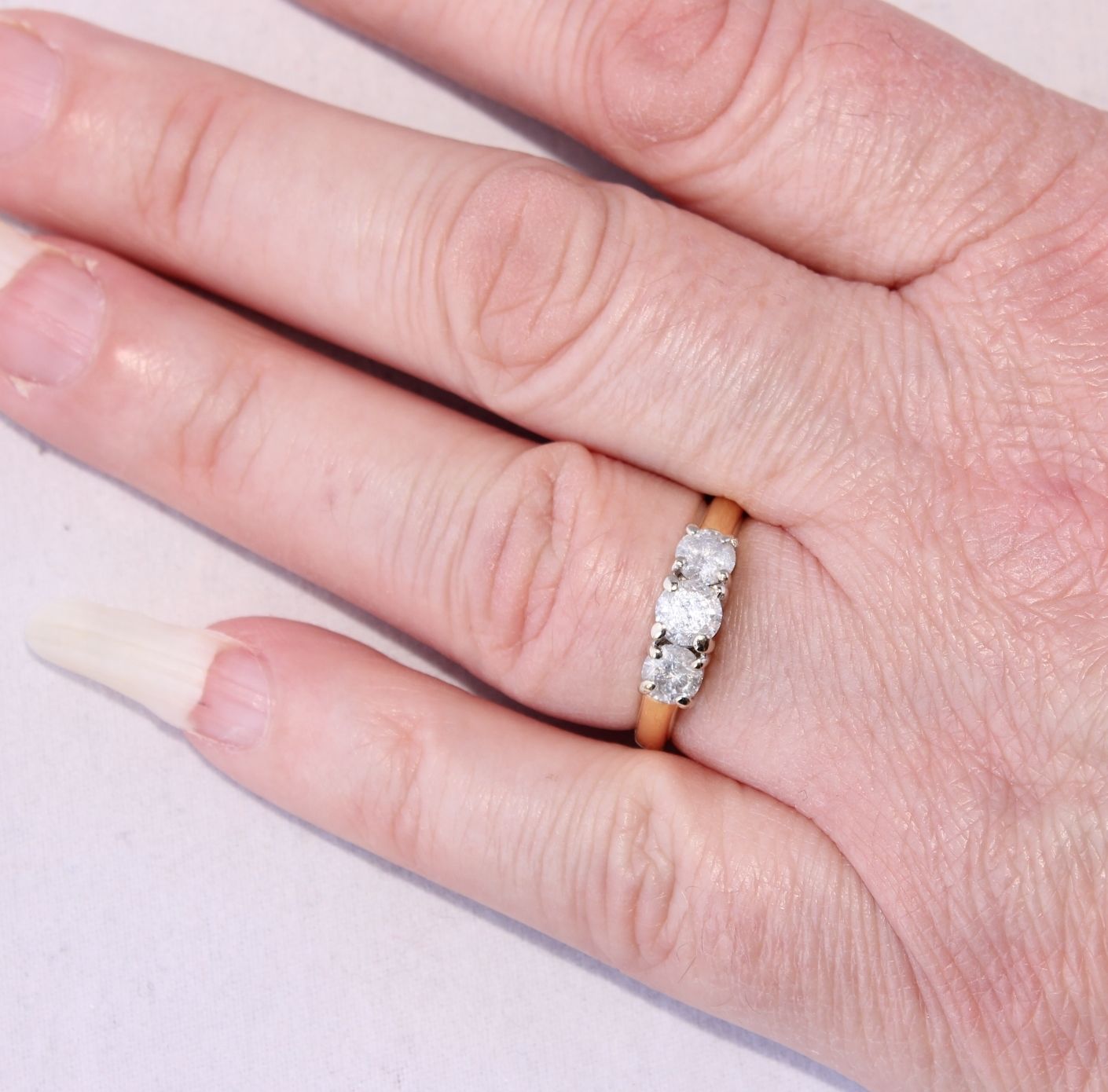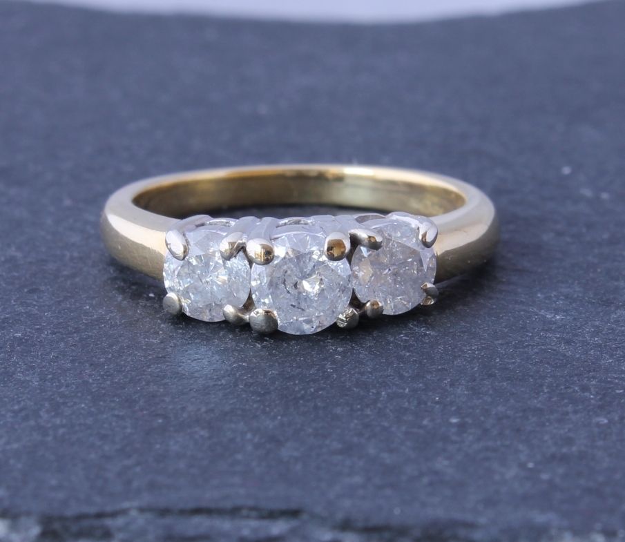 A lovely desirable and heavy three stone ring which has over 1ct of natural diamonds that would make a really great eternity ring, engagement ring or special gift.