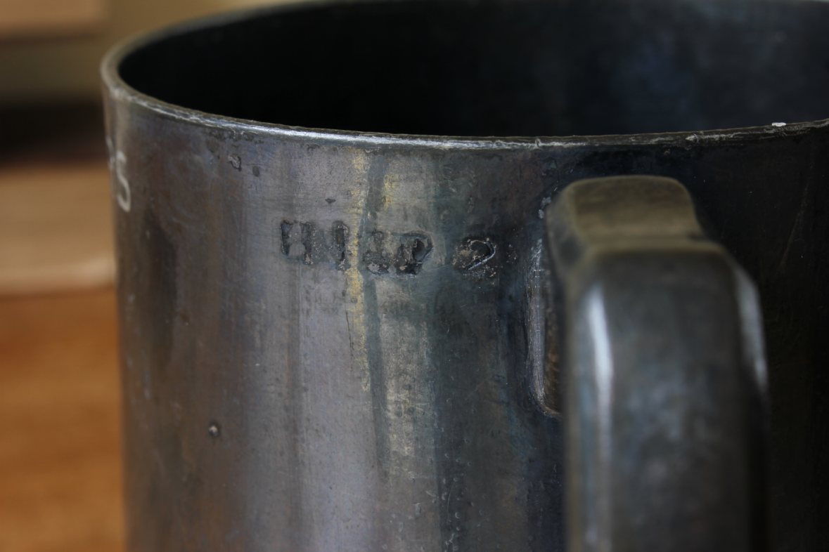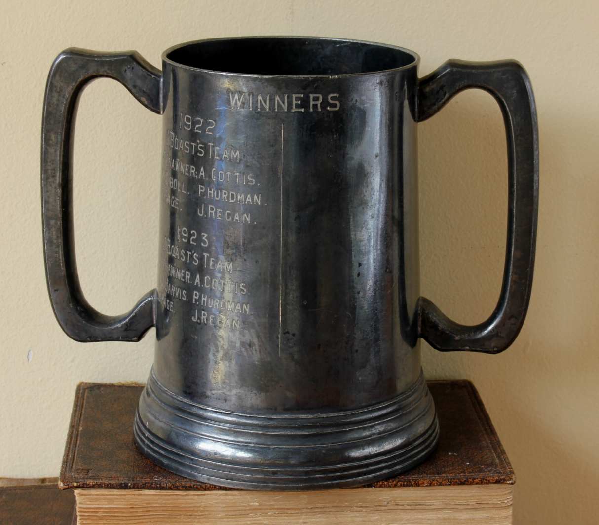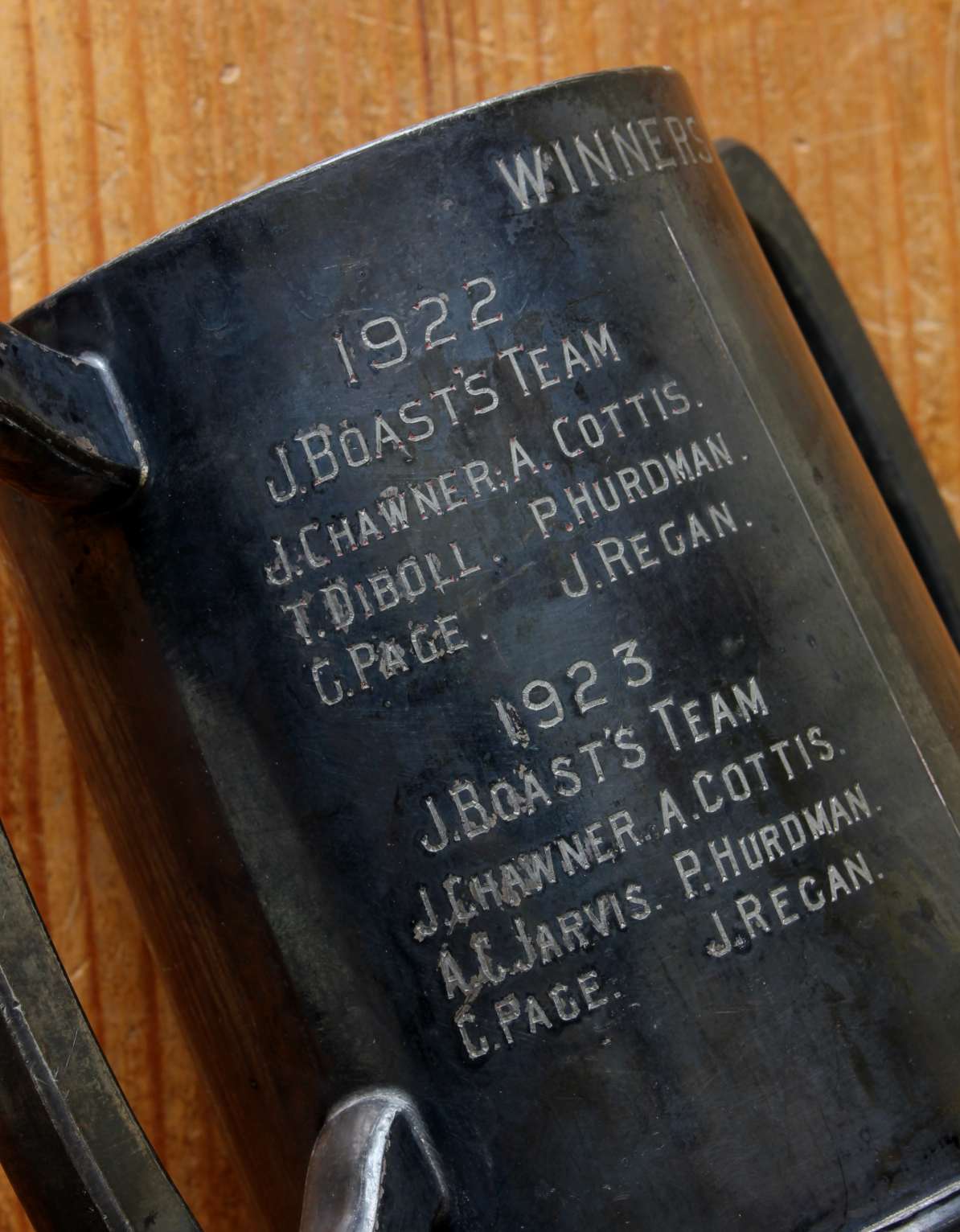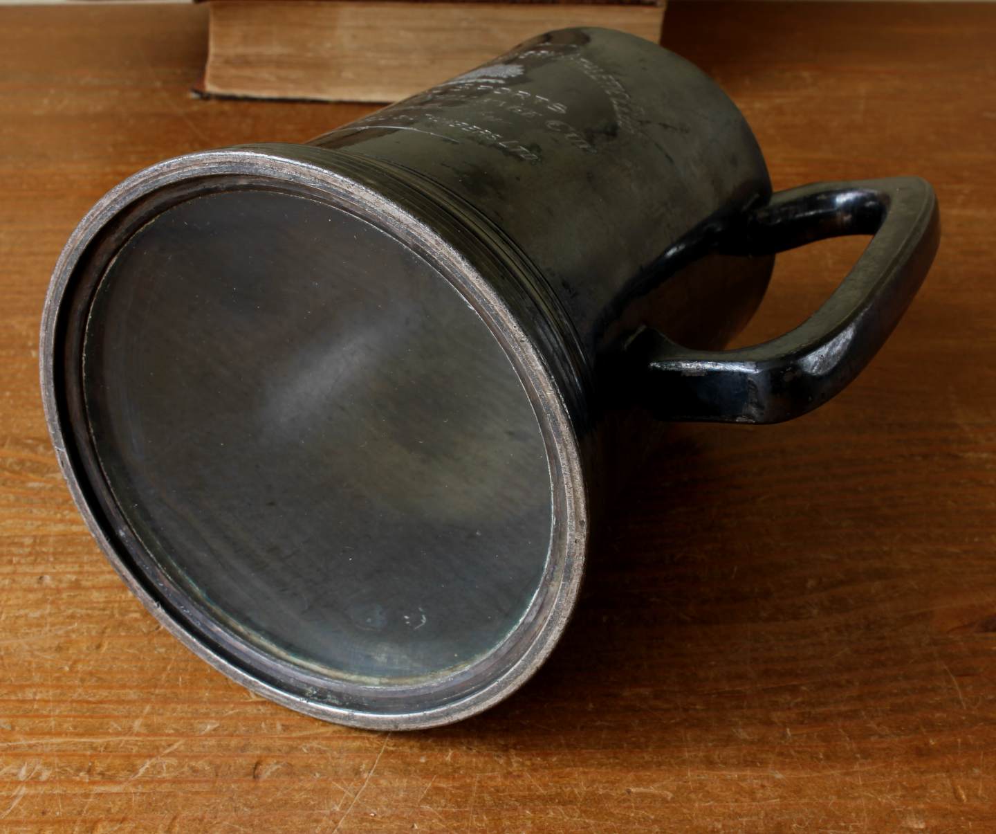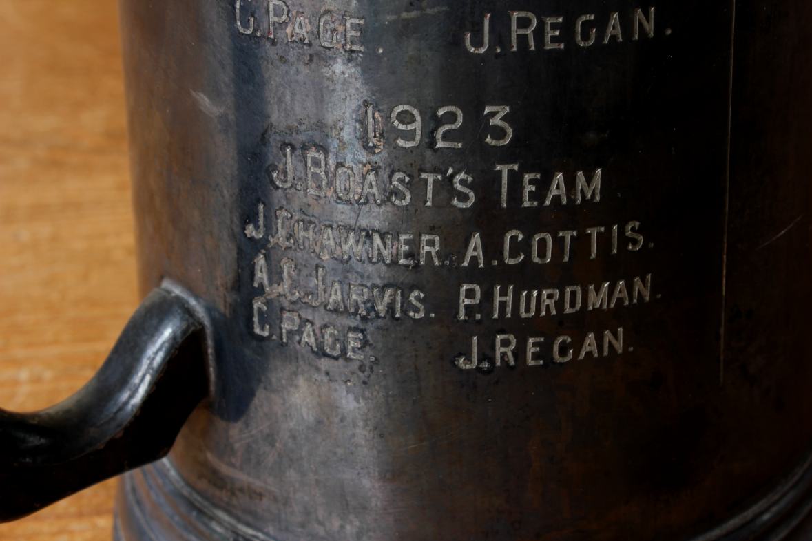 This tankard was presented as a trophy to the winners of Thorrock Brewery Athletic Club's annual tug of war event and the front is engraved with the details which reads: