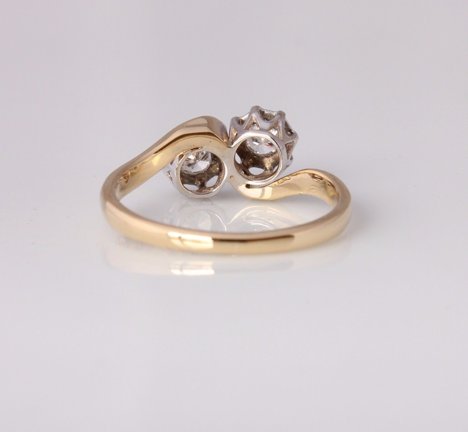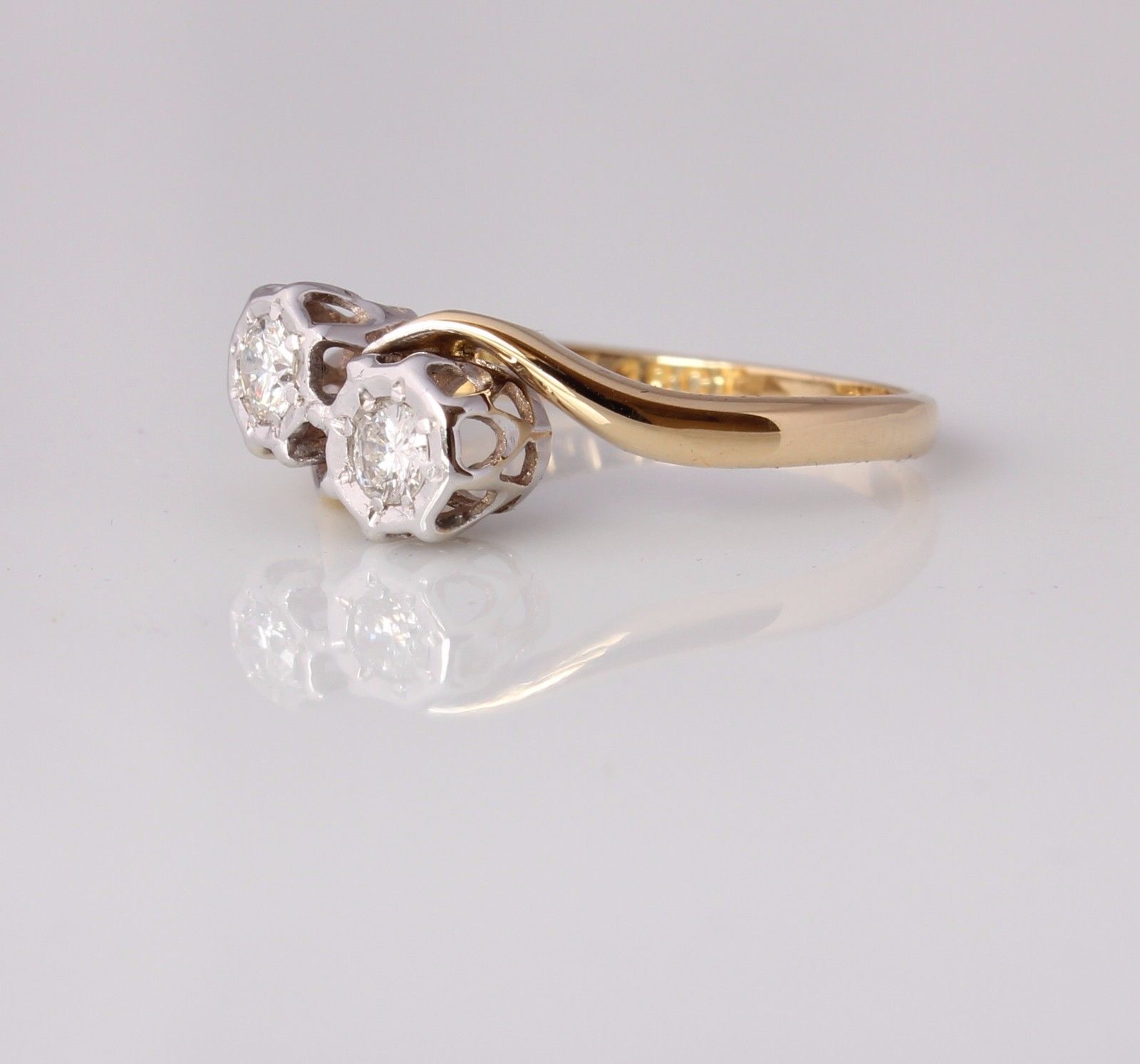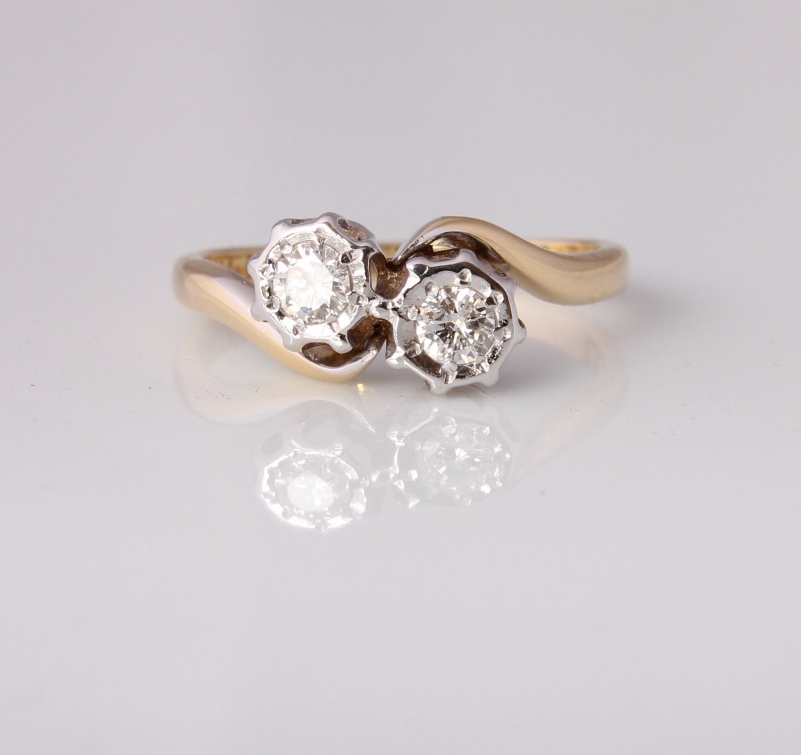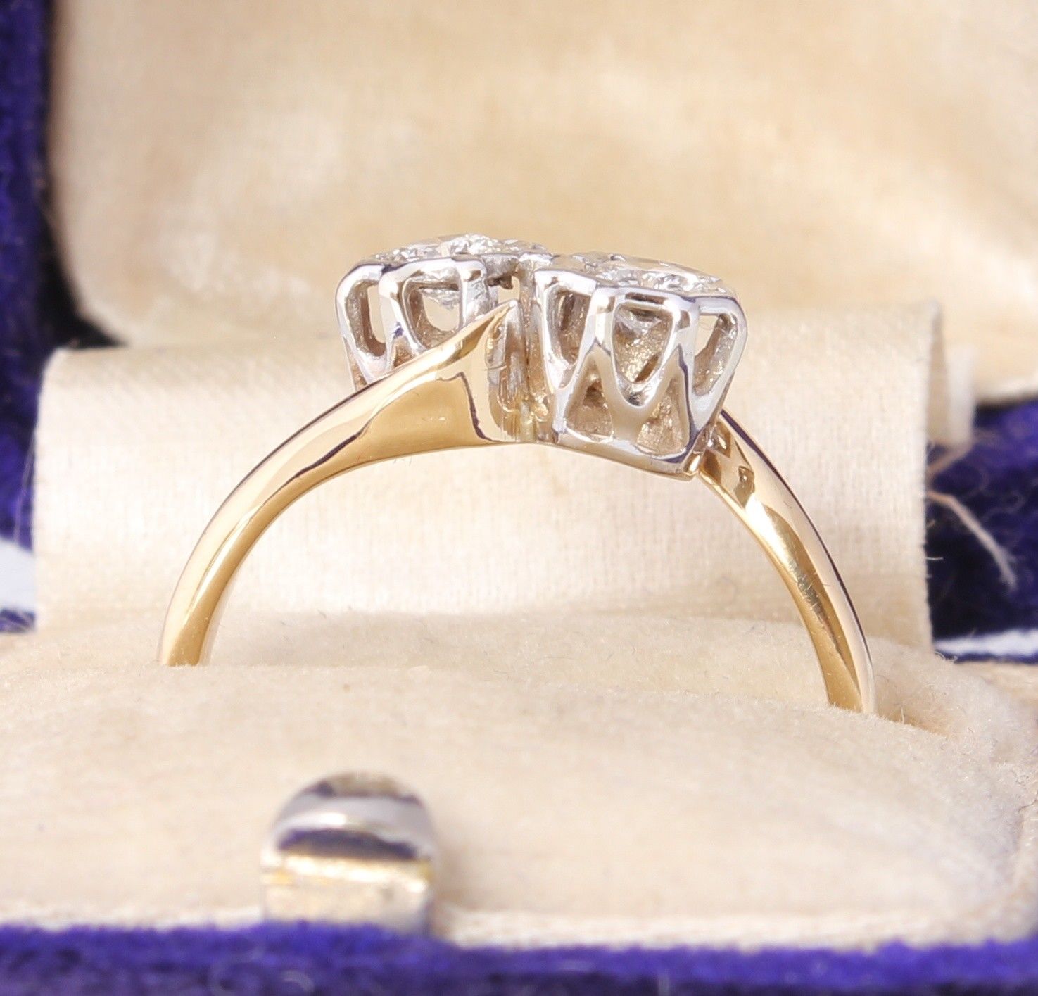 This beautiful 18ct yellow gold two stone crossover ring which dates from the first half of the 20th Century has 2 brilliant cut natural diamonds that total an est 0.25 carats.