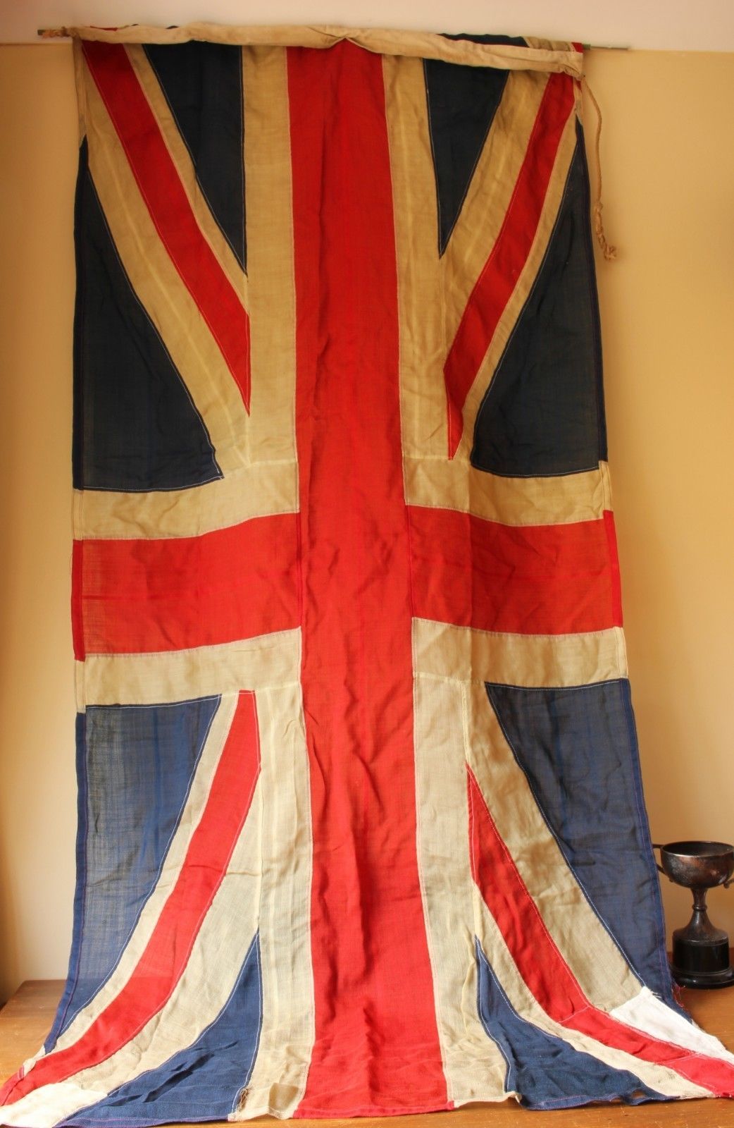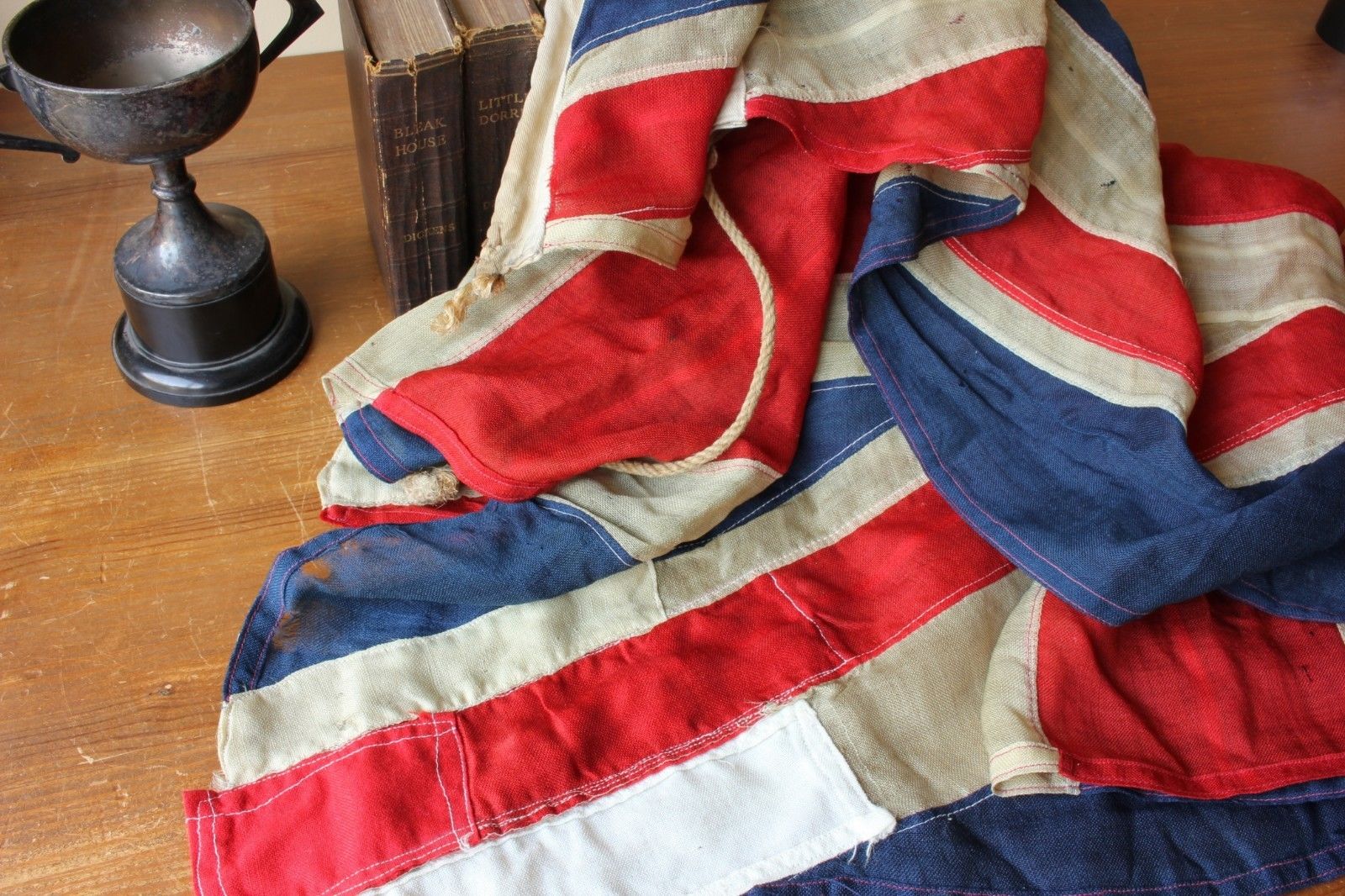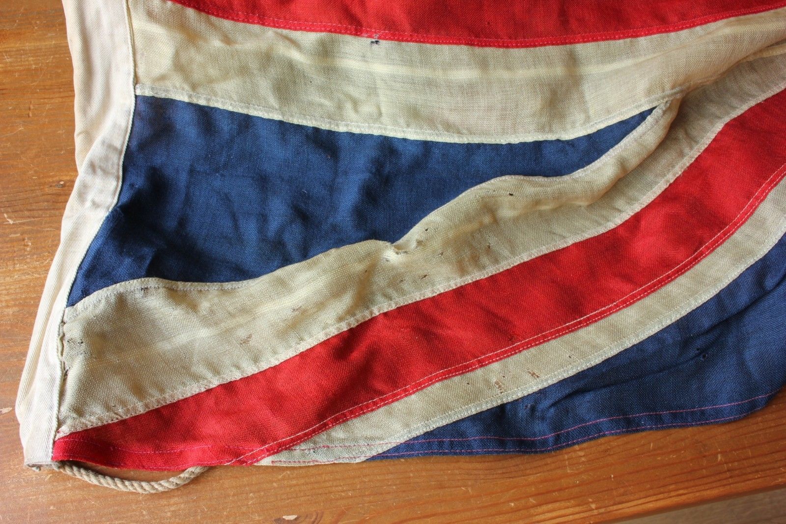This large original vintage Union Jack Flag which has each segment individually sewn and has halyard rope has seen lots of action with many old scars and a few old repairs giving it a wonderful look.