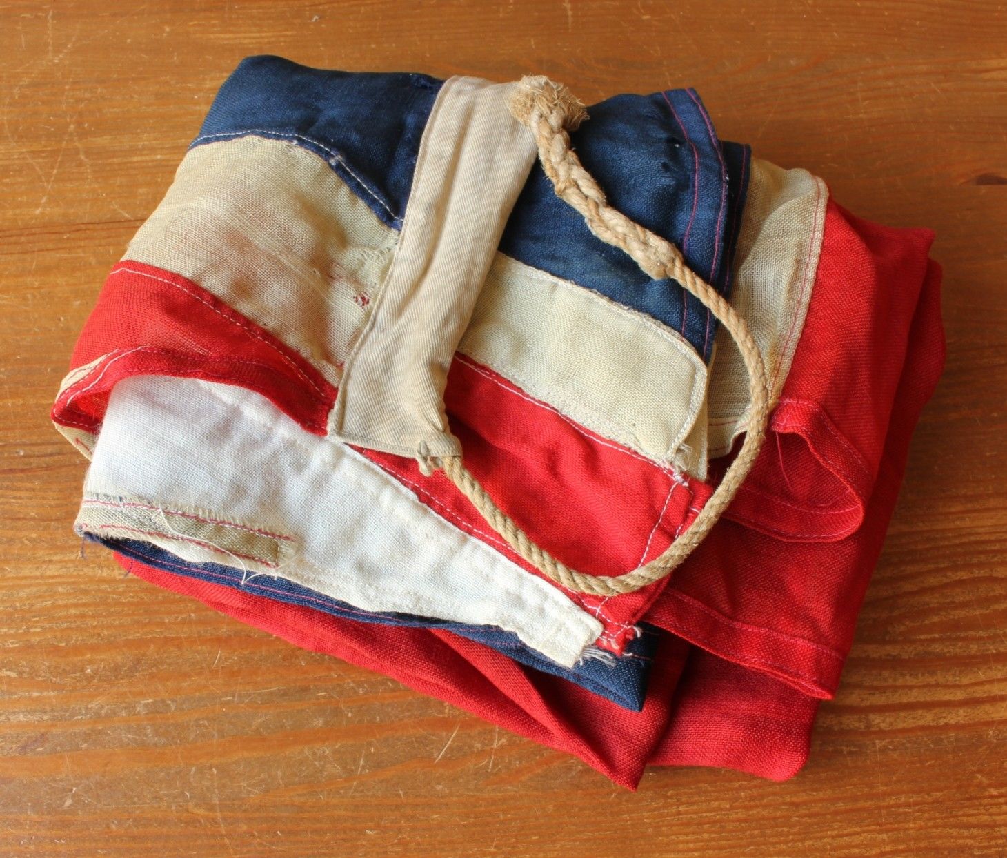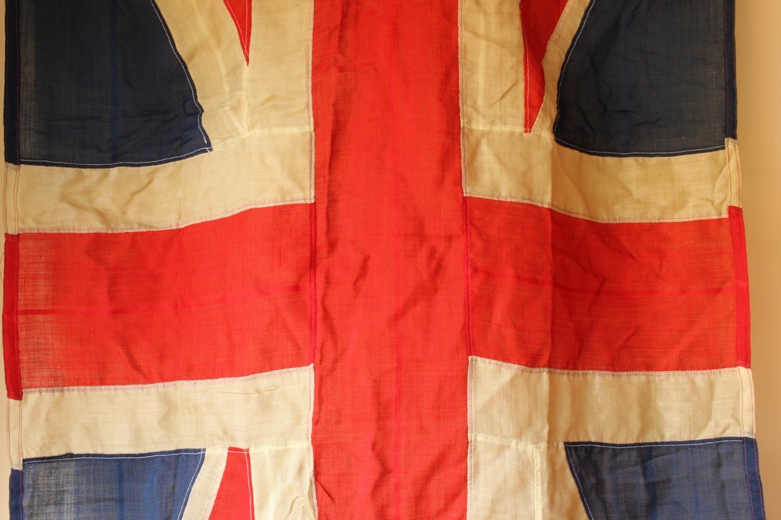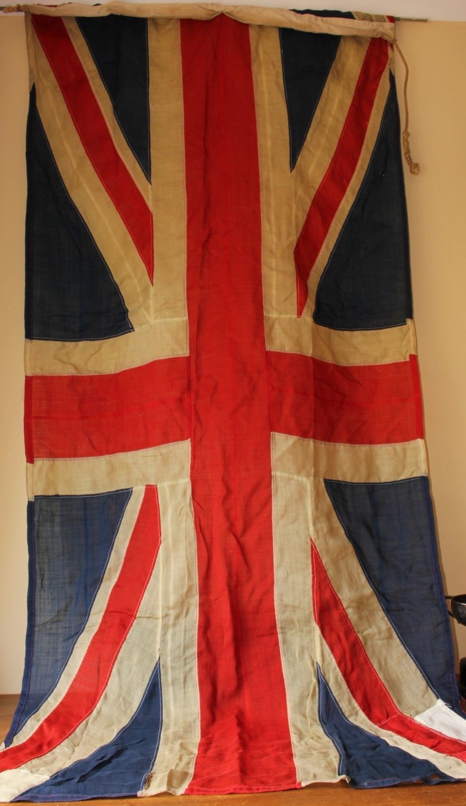 This large original vintage Union Jack Flag which has each segment individually sewn and has halyard rope has seen lots of action with many old scars and a few old repairs giving it a wonderful look.