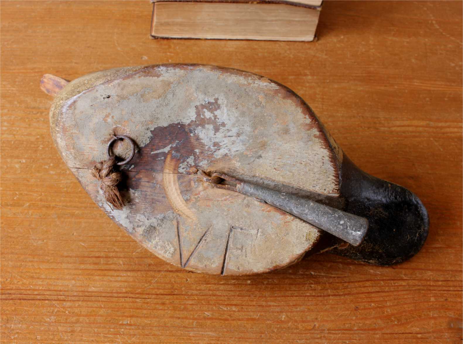 This painted duck is nicely carved and is fitted with a weight to the underside which sits nicely into a groove in it's base. The underside is also marked with VF and has a metal ring attachment.