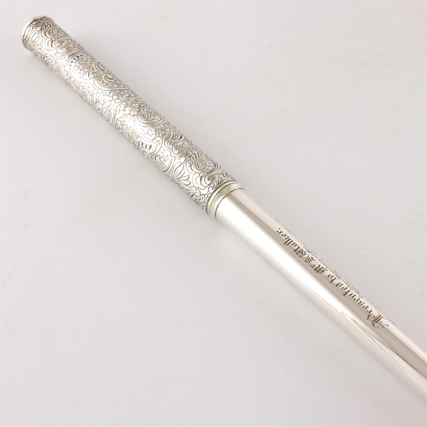 This unusual antique one piece conductor's baton which is made of silver plate has a beautiful aesthetically decorated handle and tip, dates from 1877 and is a very nice quality item in great condition.