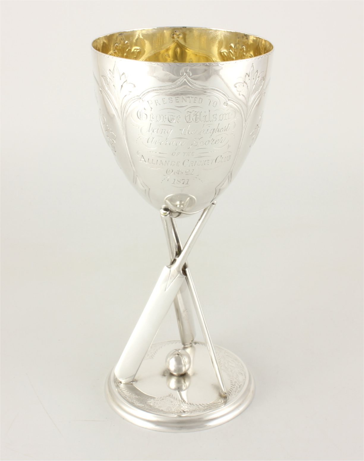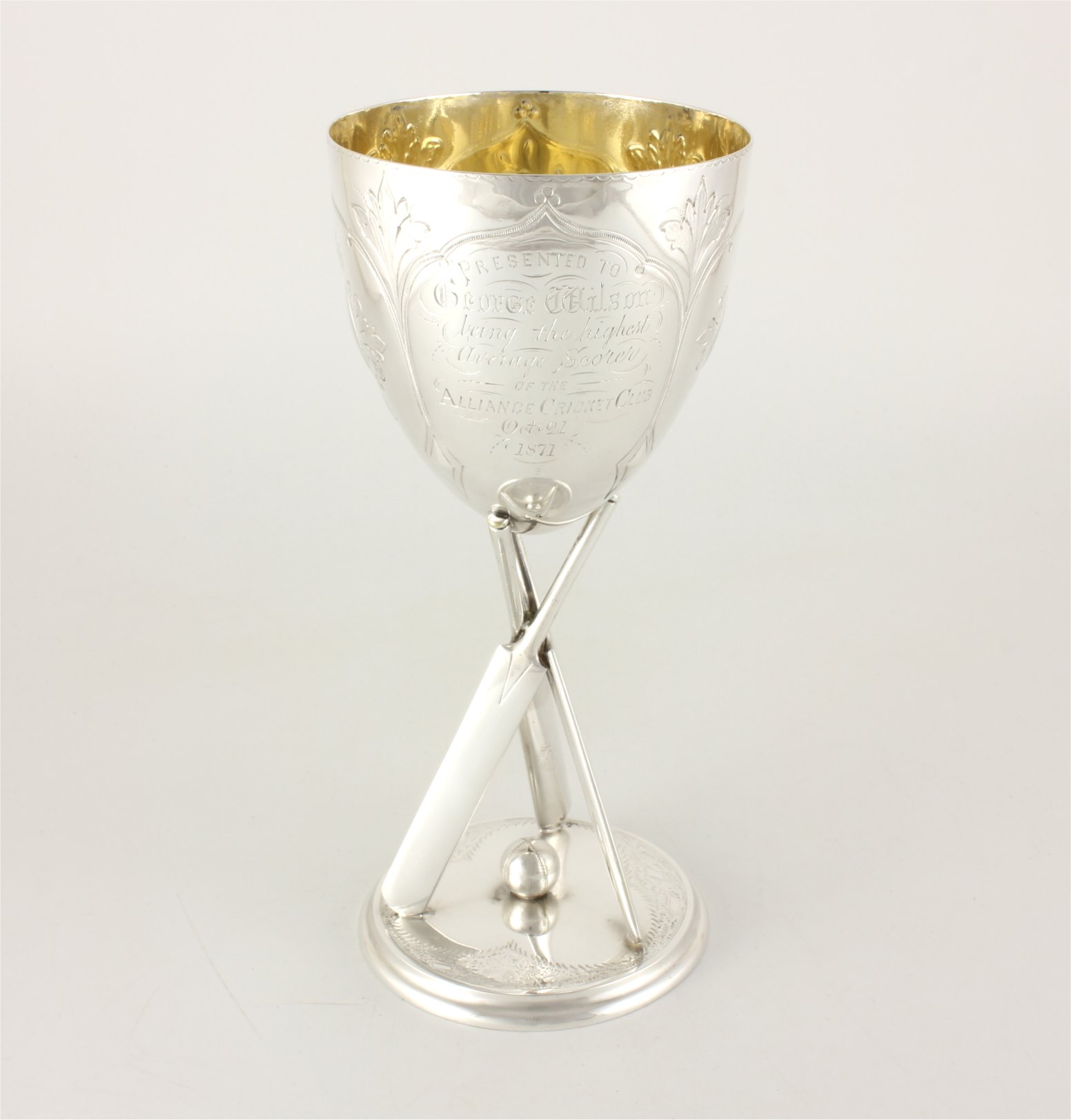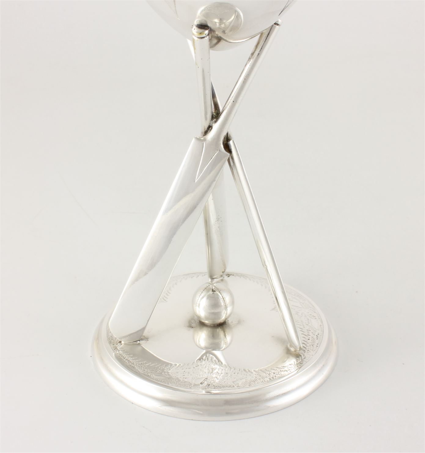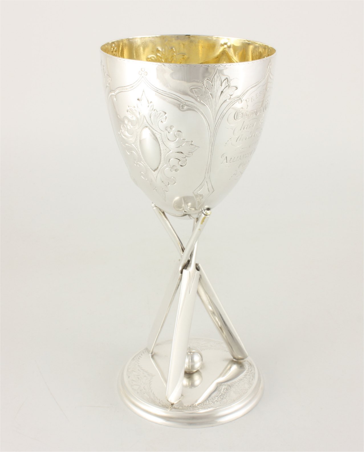 This fantastic quality silver plated cricket trophy cup which features three crossed cricket bats surrounding a cricket ball has engraved decoration to the top and base, dates from 1871 and is nicely gilded to the inside.