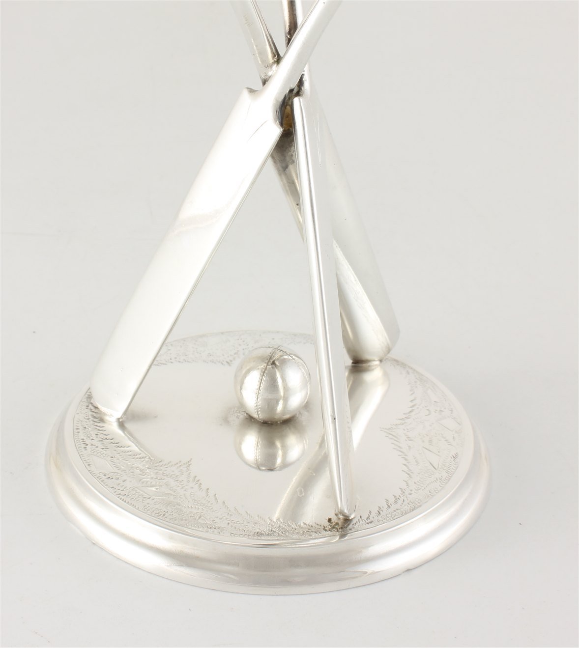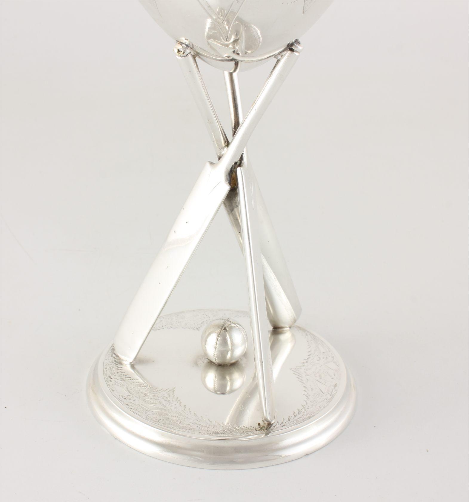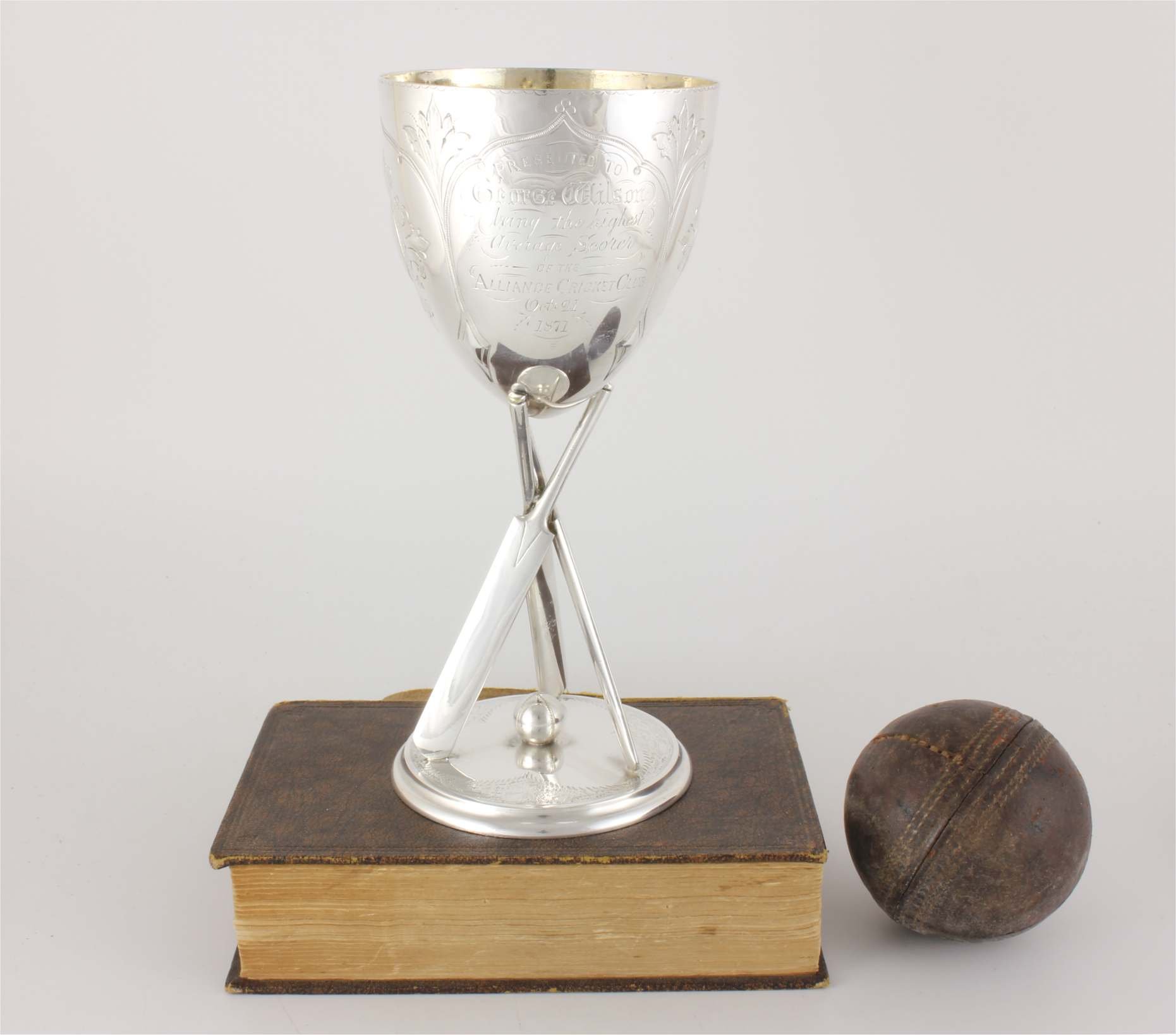 This fantastic quality silver plated cricket trophy cup which features three crossed cricket bats surrounding a cricket ball has engraved decoration to the top and base, dates from 1871 and is nicely gilded to the inside.