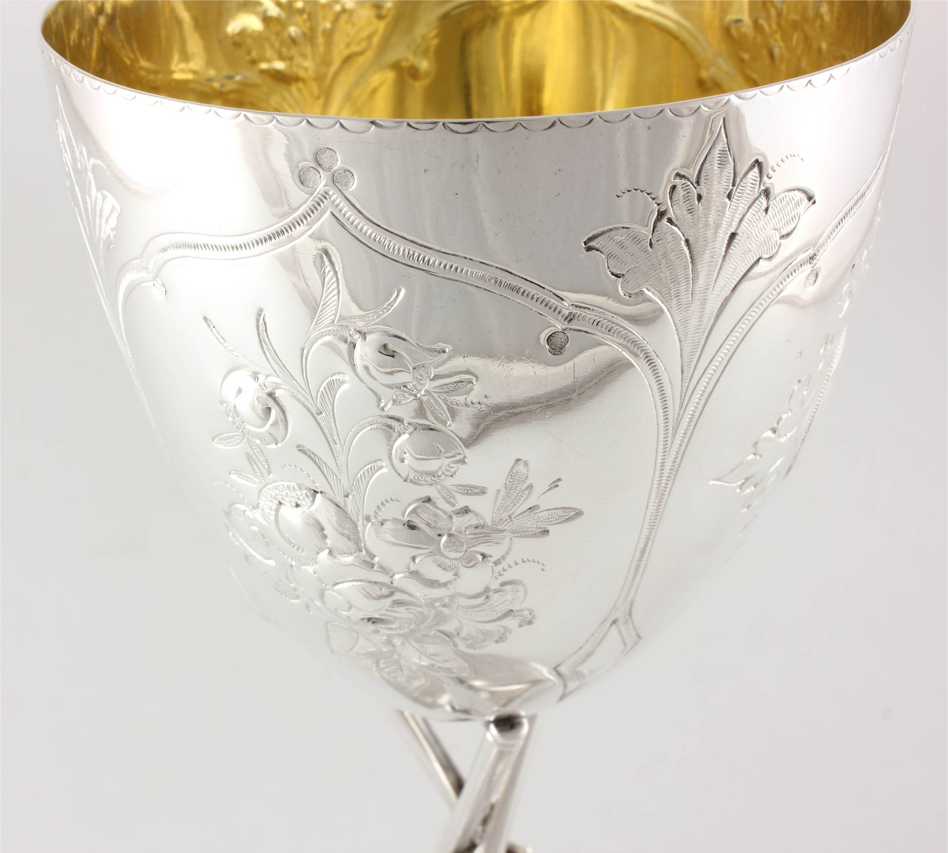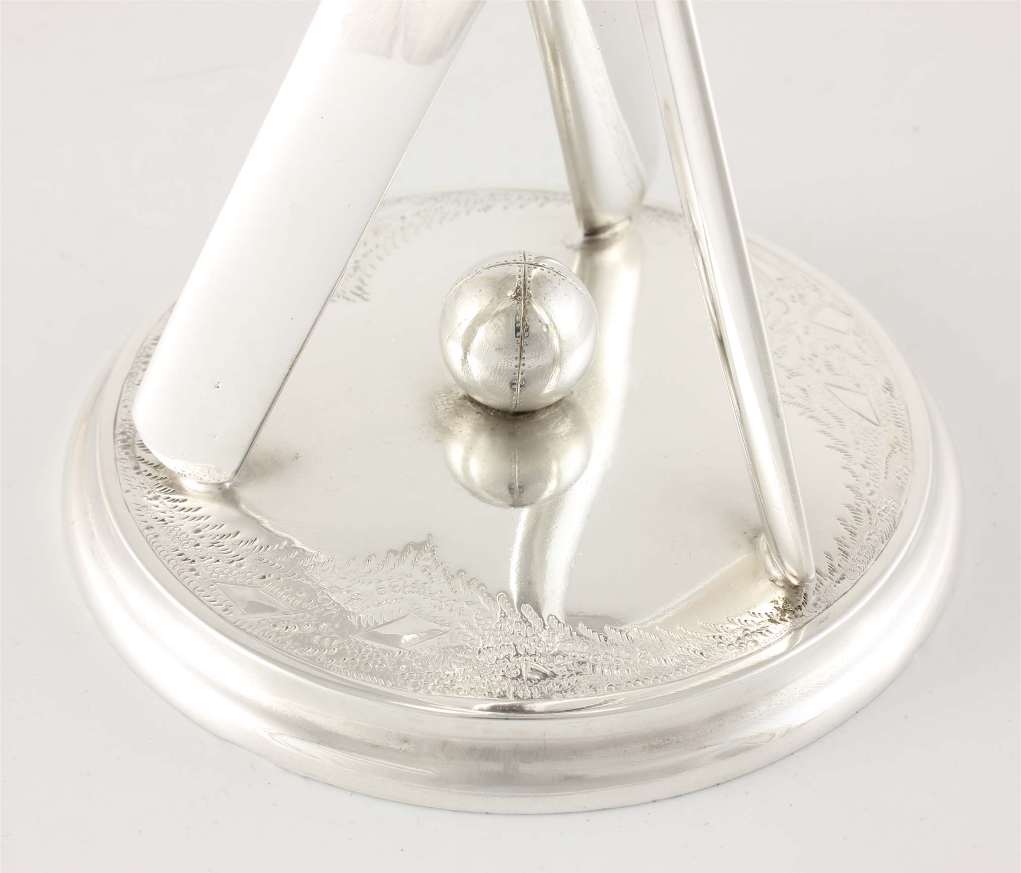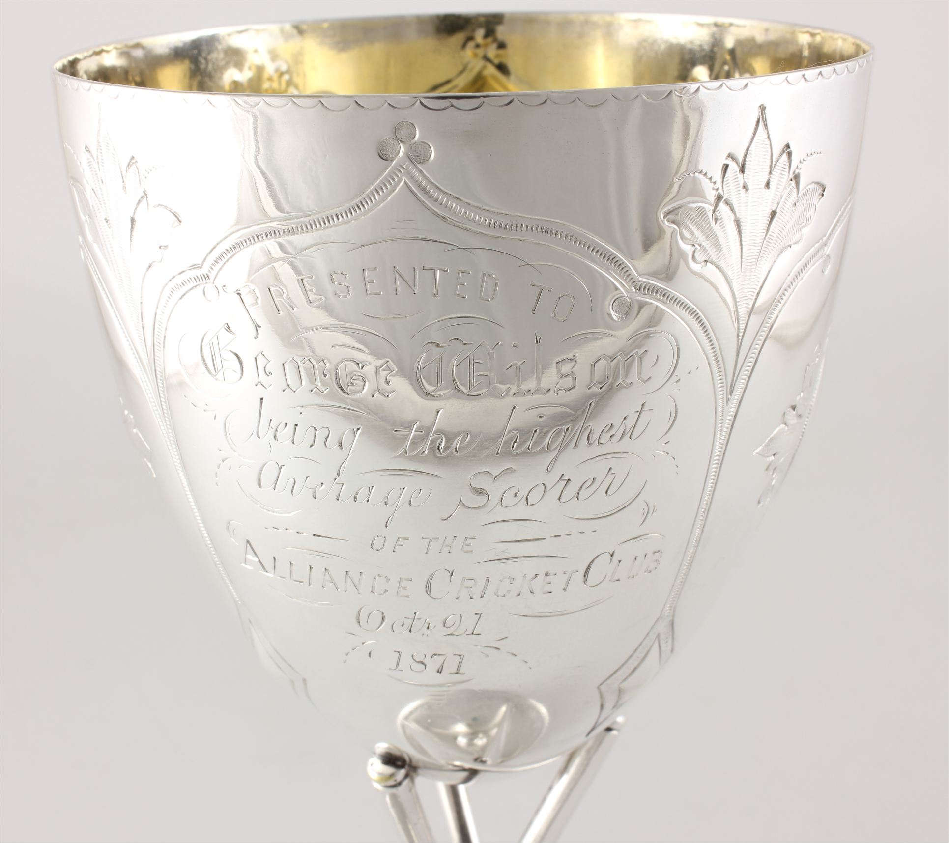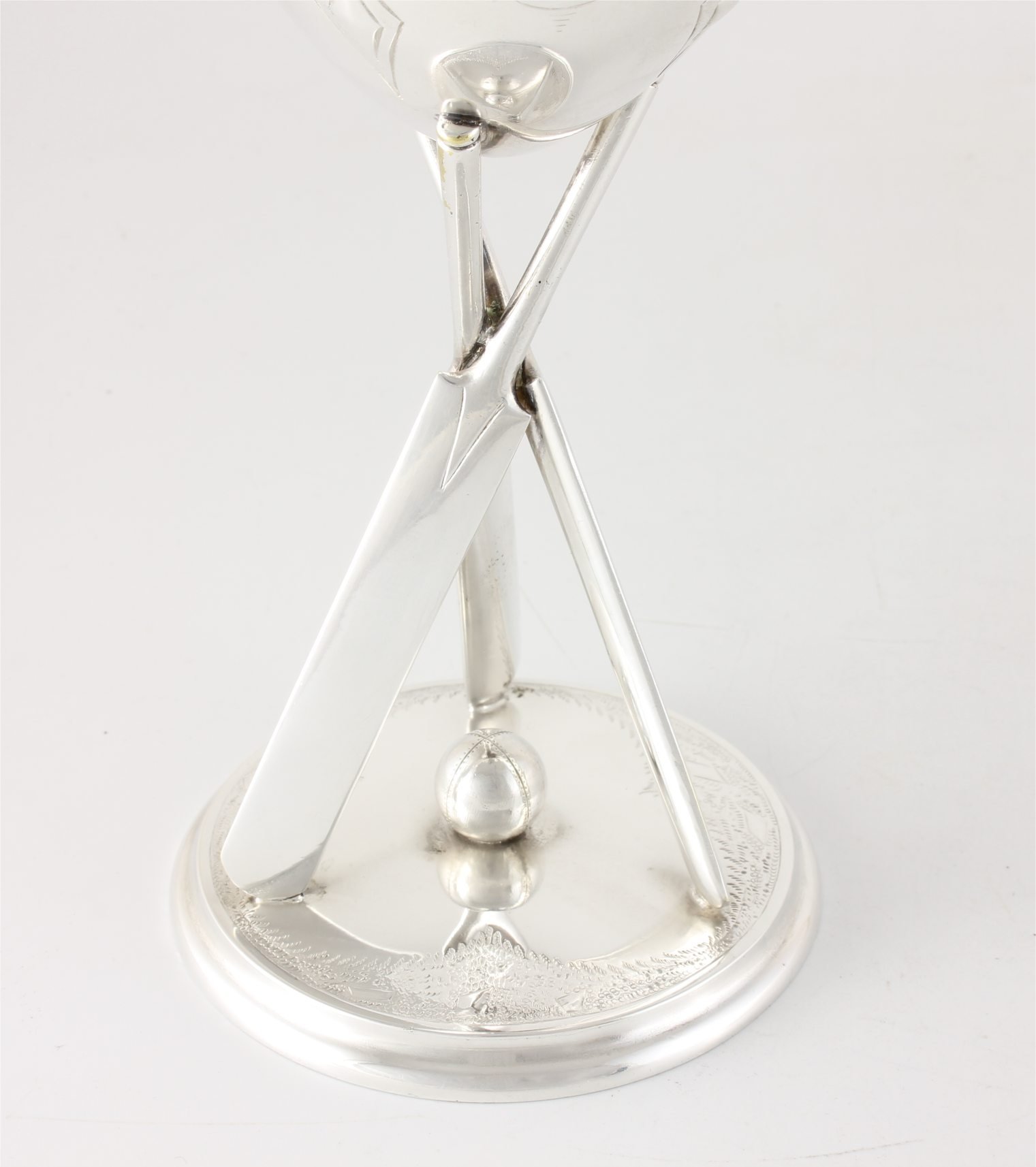 This fantastic quality silver plated cricket trophy cup which features three crossed cricket bats surrounding a cricket ball has engraved decoration to the top and base, dates from 1871 and is nicely gilded to the inside.