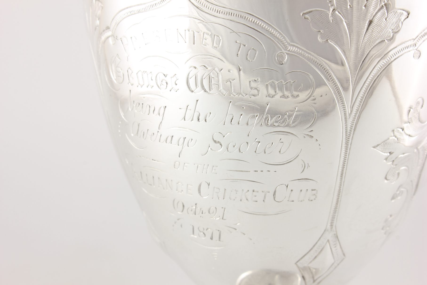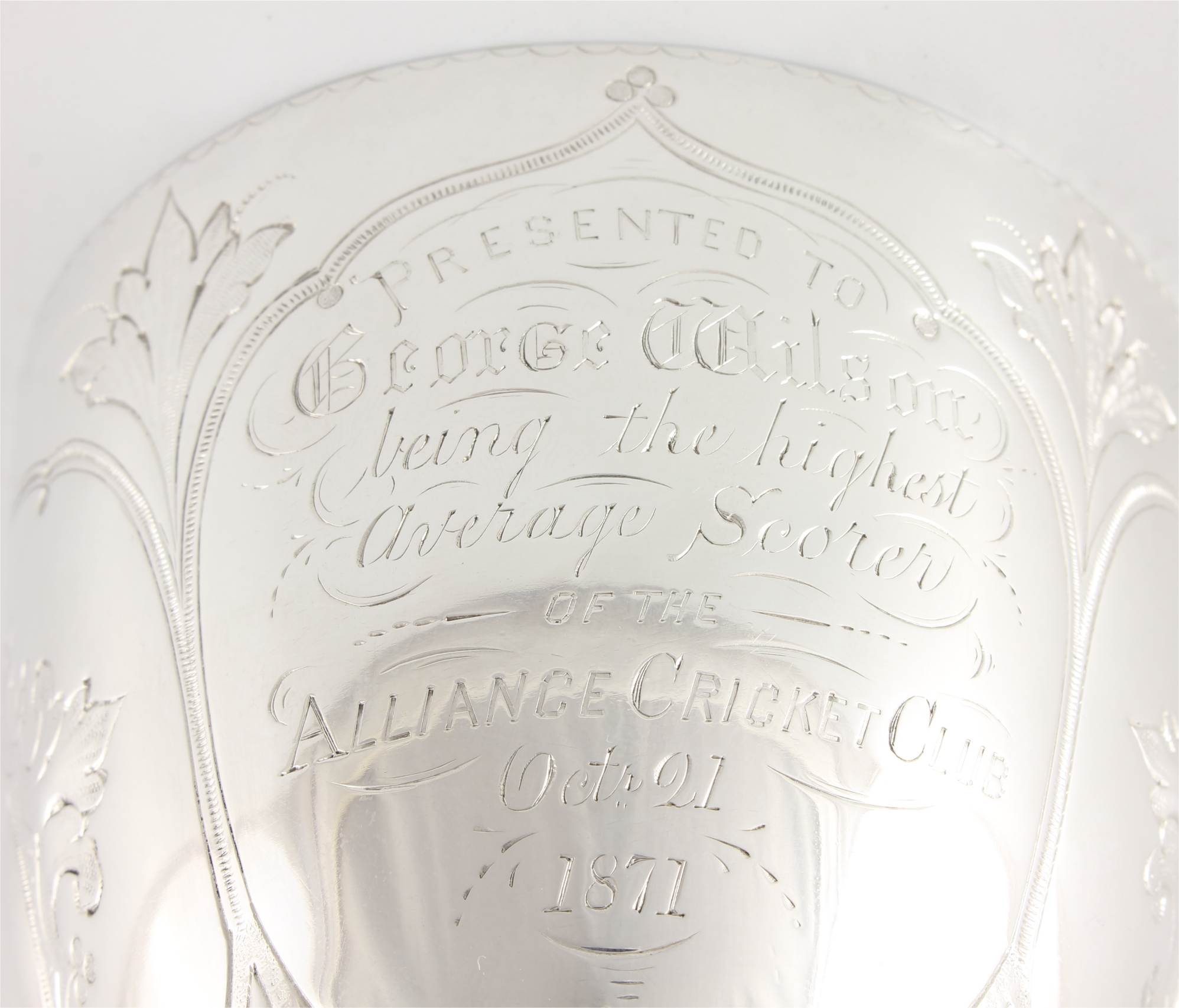 Presented to George Wilson Being The Highest Average Scorer of the Alliance Cricket Club. October 21st 1871.