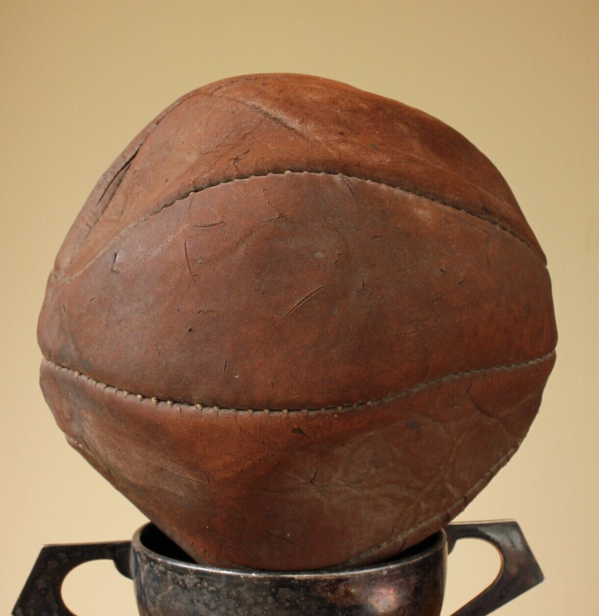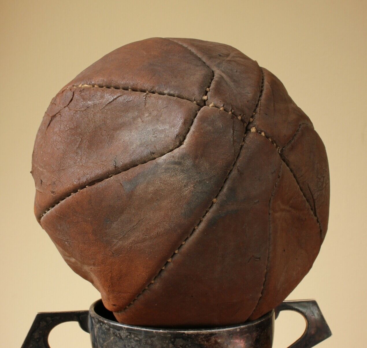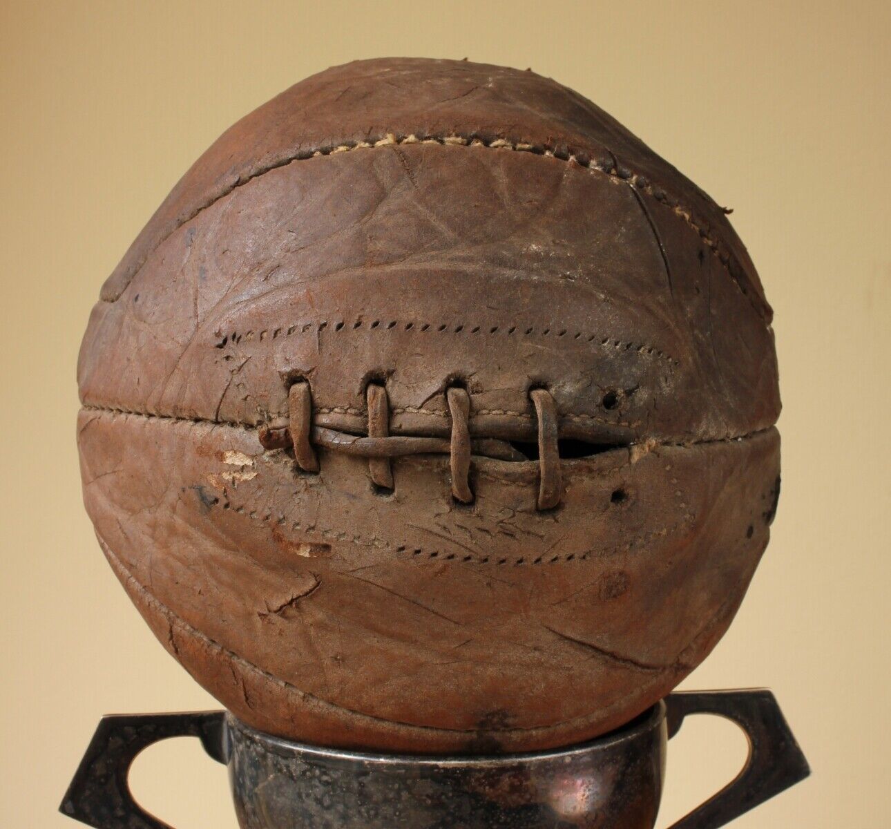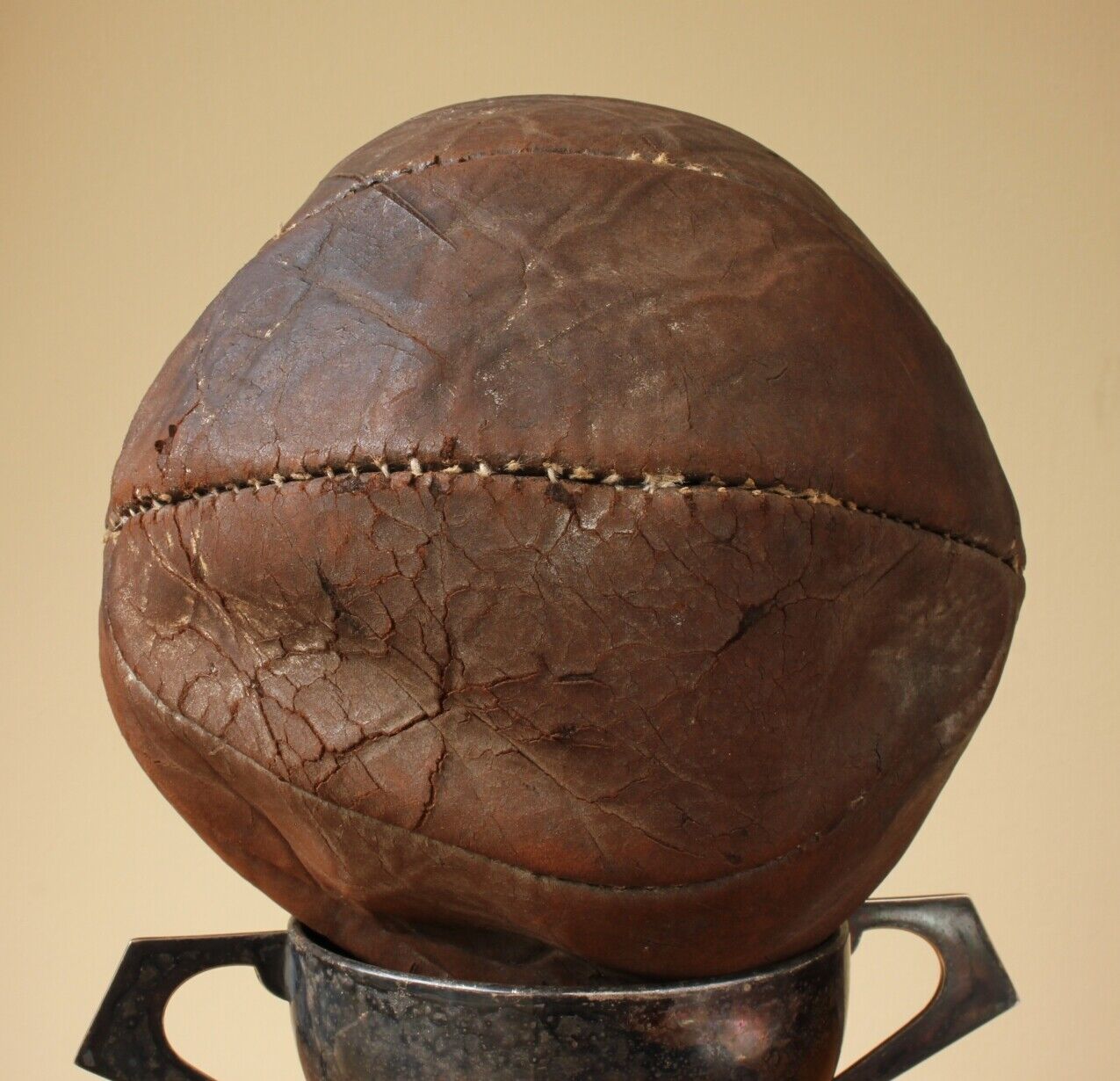 Condition: Well used condition with lots of age related wear, scuffs, scrapes, staining and marks. Leather has dried out and some of the stitching has pulled/torn. There is no bladder as it has rotted but the ball holds shape OK for display. Please see pictures.