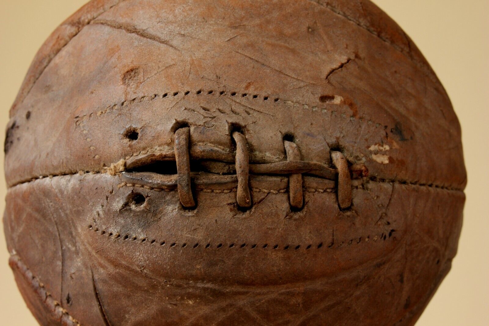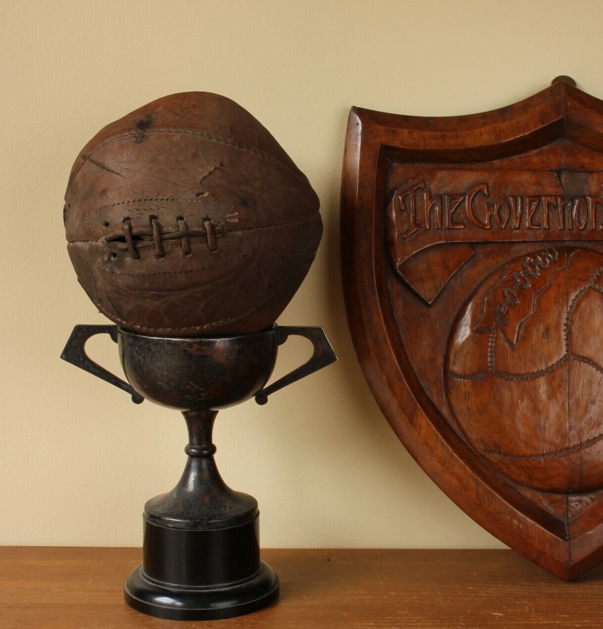 The football is a youth league size ball and is in original well used condition so showing lots of age related wear. There is no bladder as it has rotted but the ball holds shape OK for display.