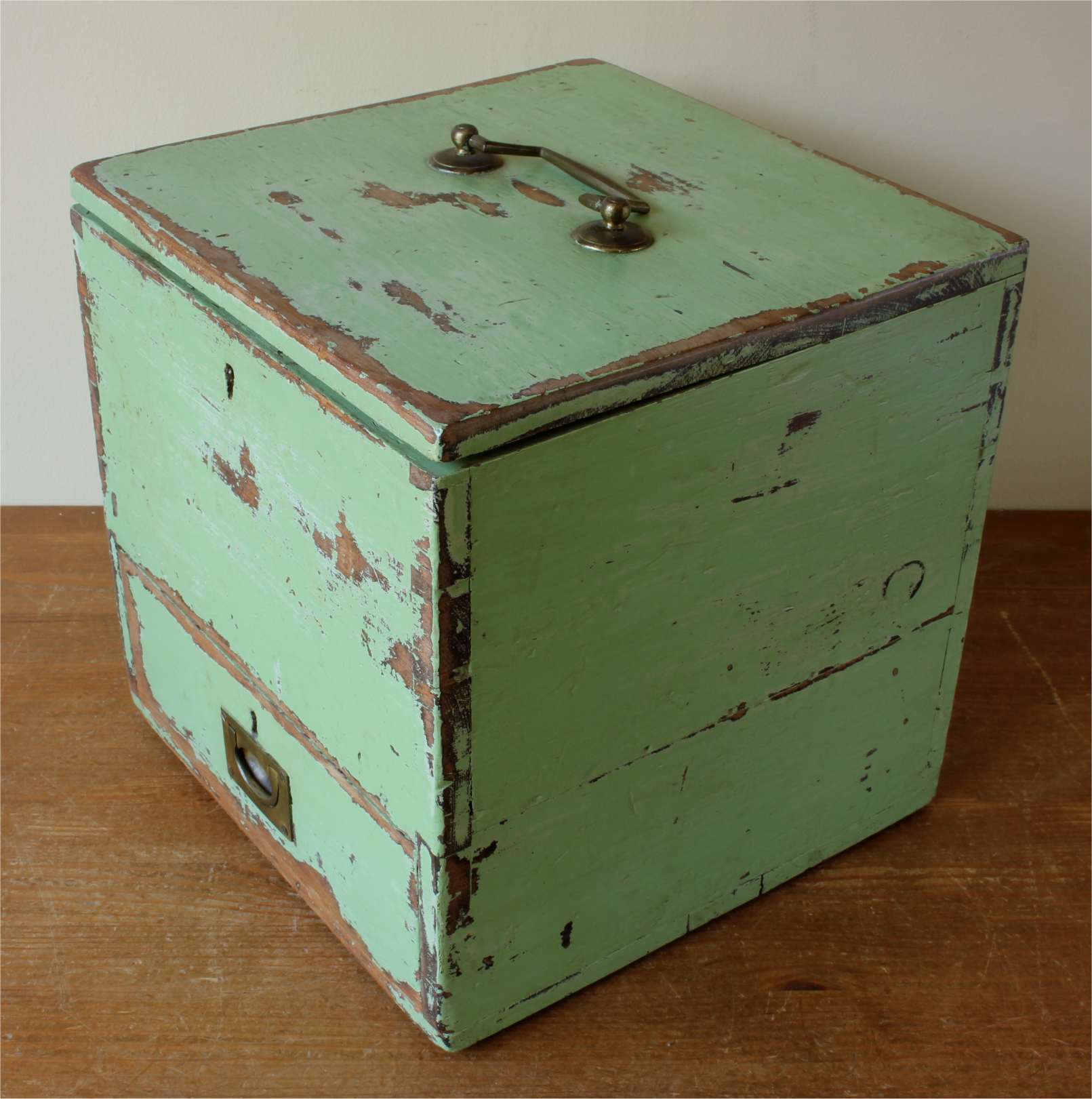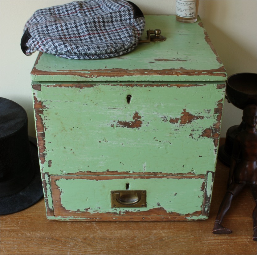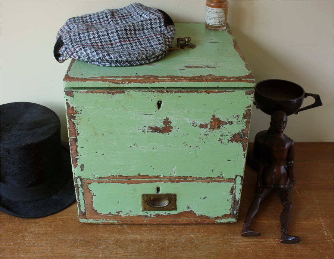 This Victorian cabinet is nicely made with a hinged lift up lid which is fitted with metal hinges and brass handle, lower drawer has a brass folding handle and the drawer sliding in and out well. The box sits on four metal stud feet and two brass locks are fitted to the box but we do not have the keys.