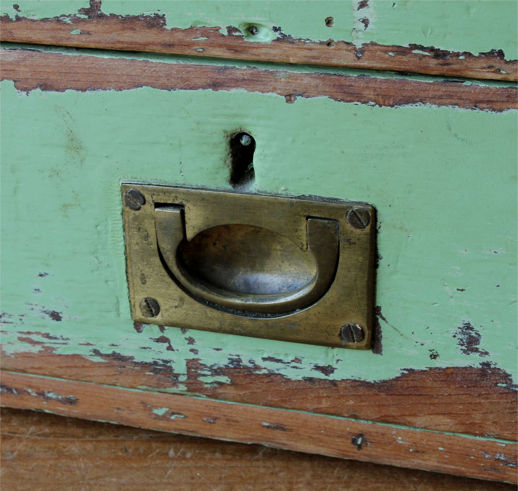 Condition: Very good solid antique condition with signs of use in keeping with age including scuffs, scratches, marks and chips leaving a wonderful patina. There is a slight gap at the front of the lid. No key for the locks. Please see pictures.