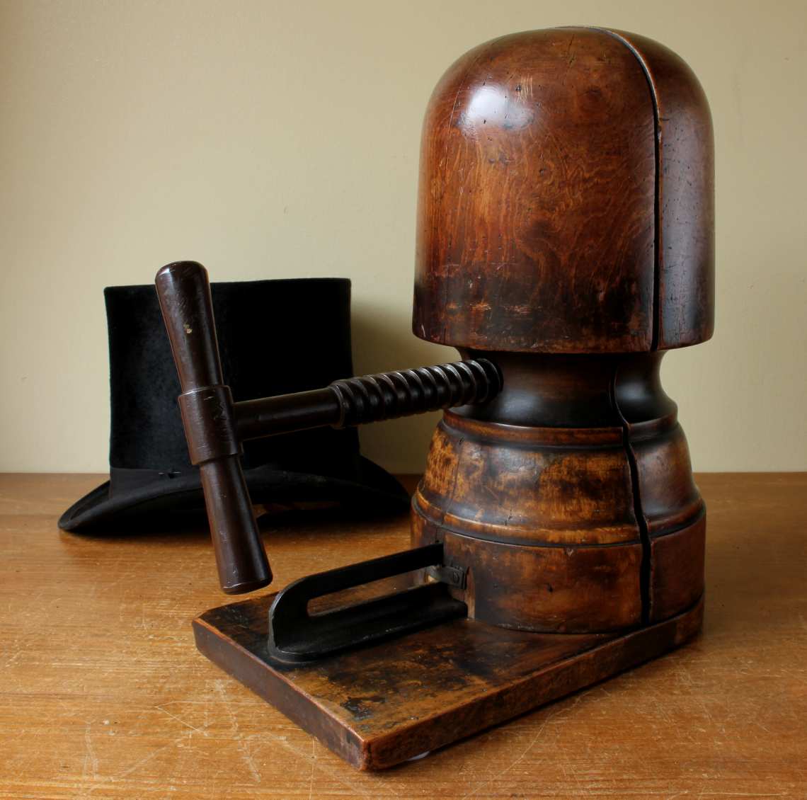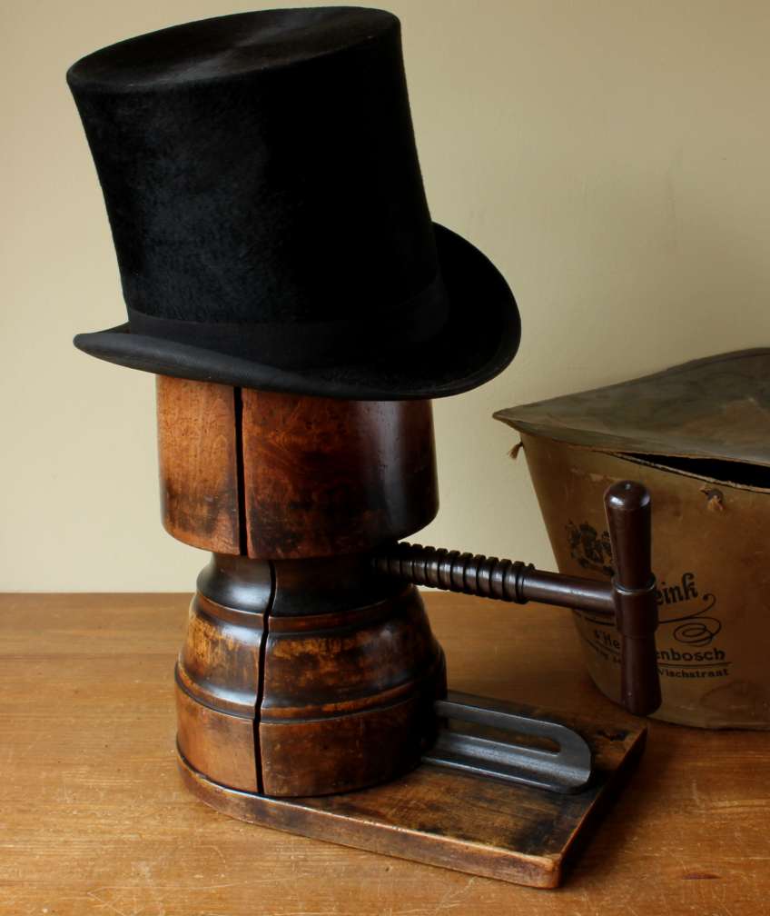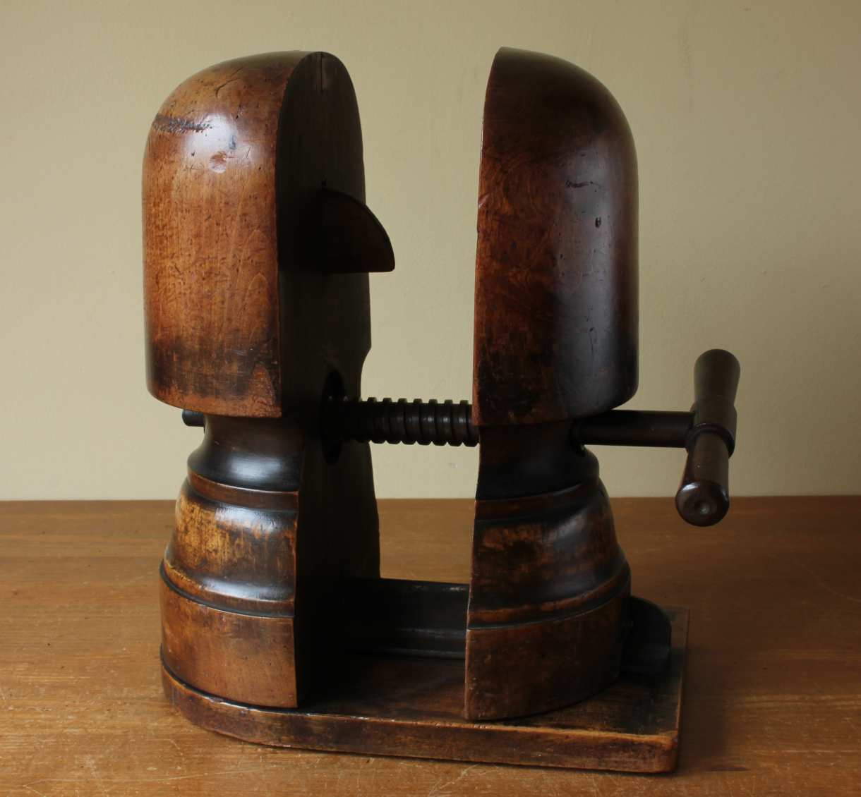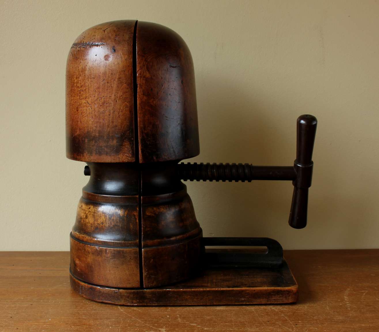 This Victorian hat maker's stretcher which dates from c1900 has a metal handle which adjusts the size when turned and has a wonderful rich patina so looks fantastic on display.