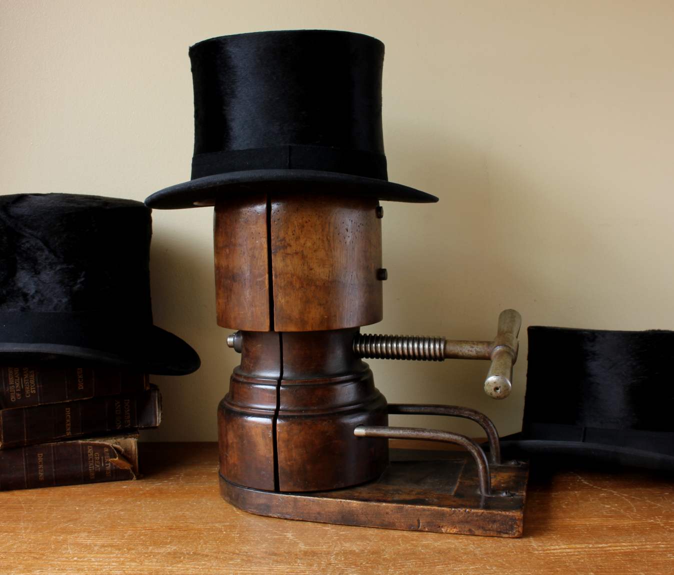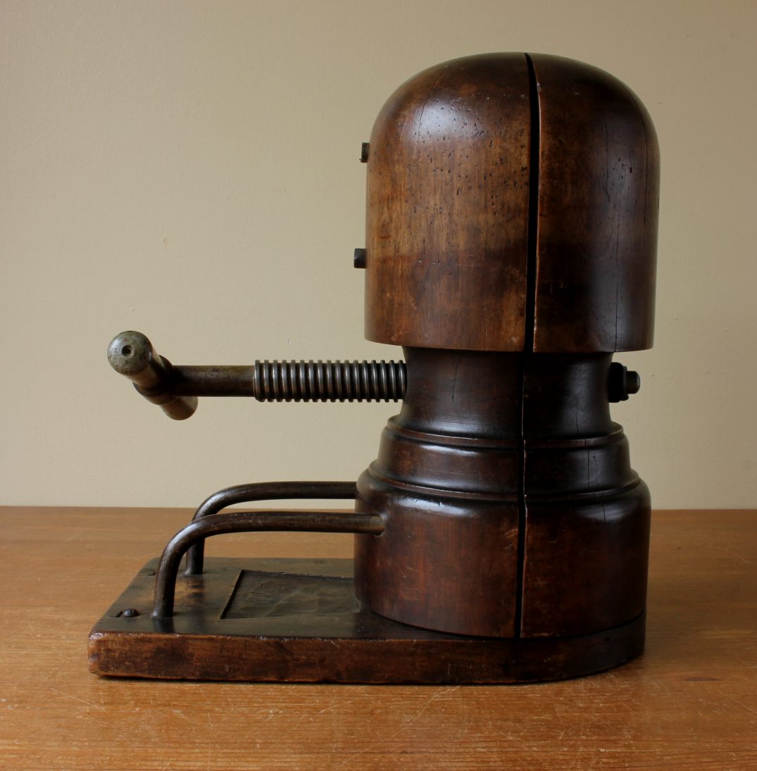 This type of mechanical wooden stretcher was originally used to manufacture and size hats. Today they make wonderful items for displaying hats and this handsome piece has a great patina so looks fantastic on display in the home.
