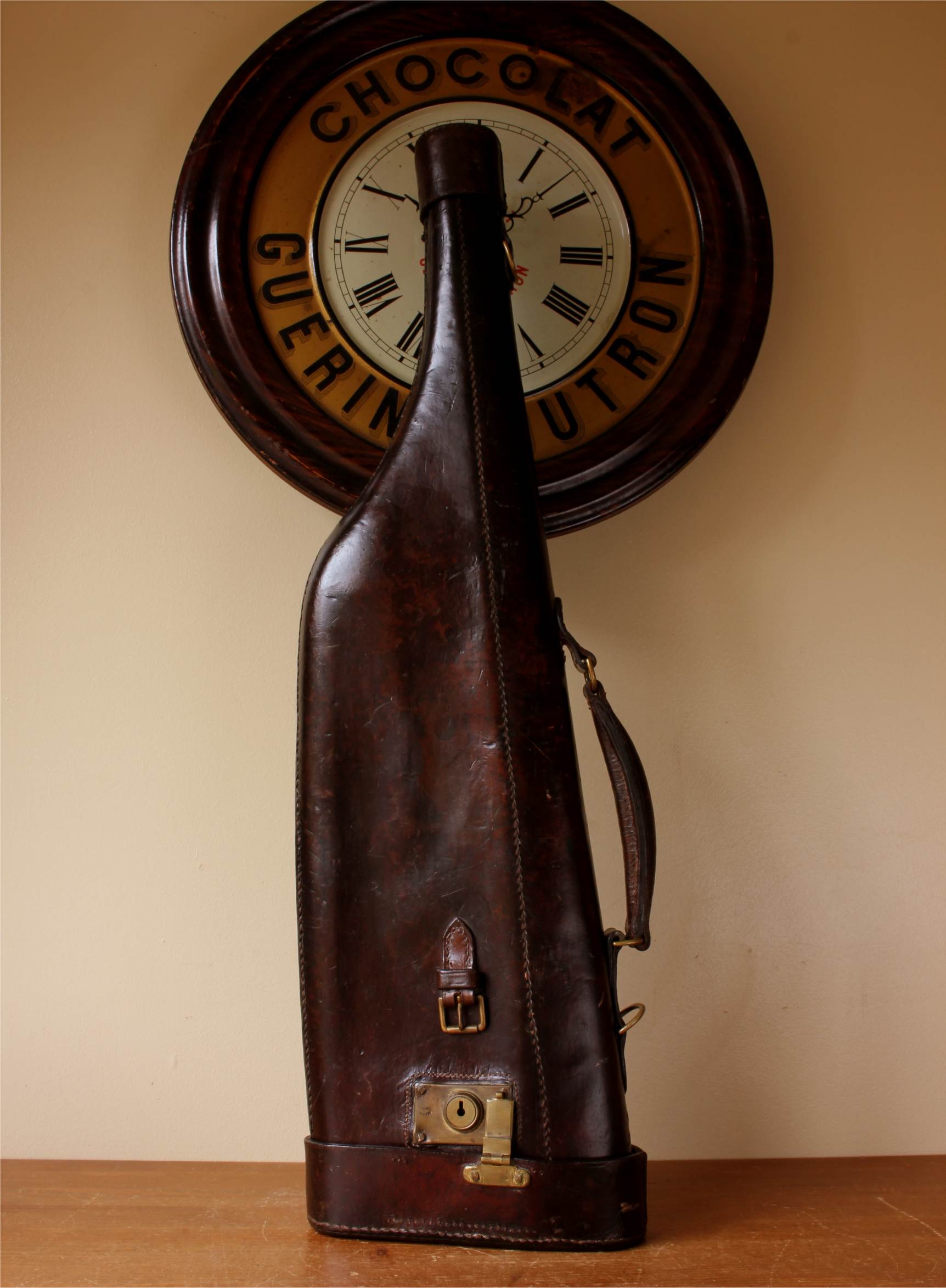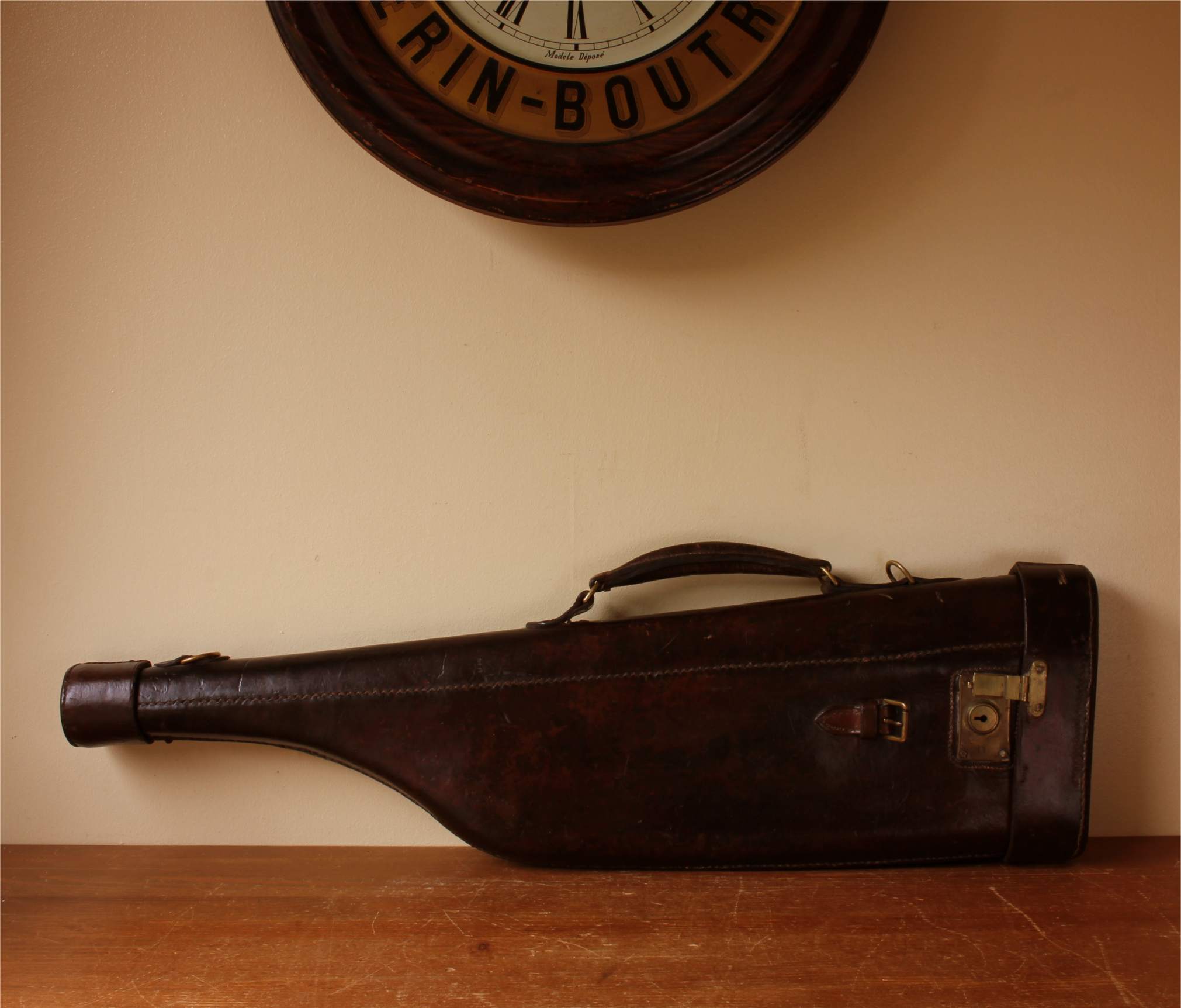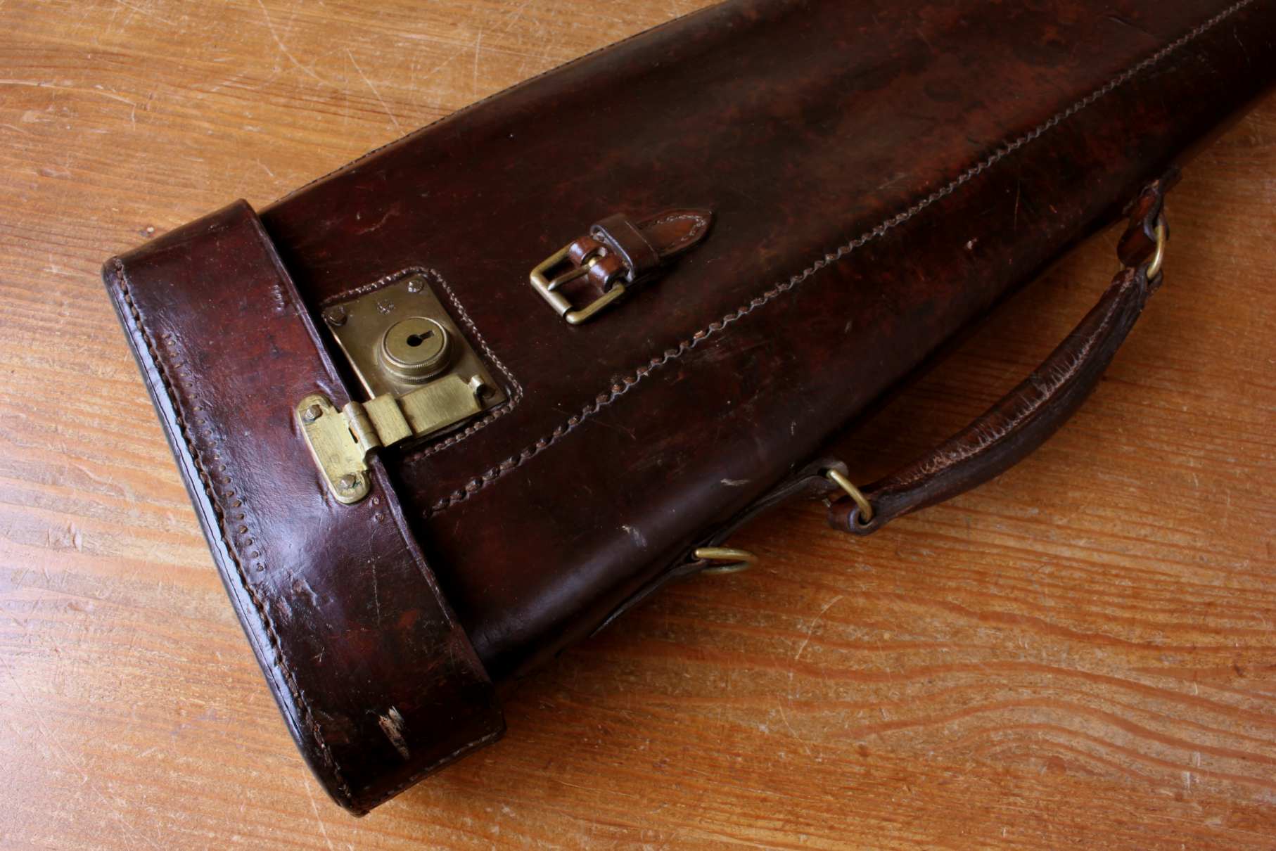 This handsome antique case comes complete with a separate leather end cap which fits over the end nicely to protect and is in good usable condition so could be used to carry and store a shotgun. Would also make a nice display item in a bar, stables, hunting shop or for home decor.