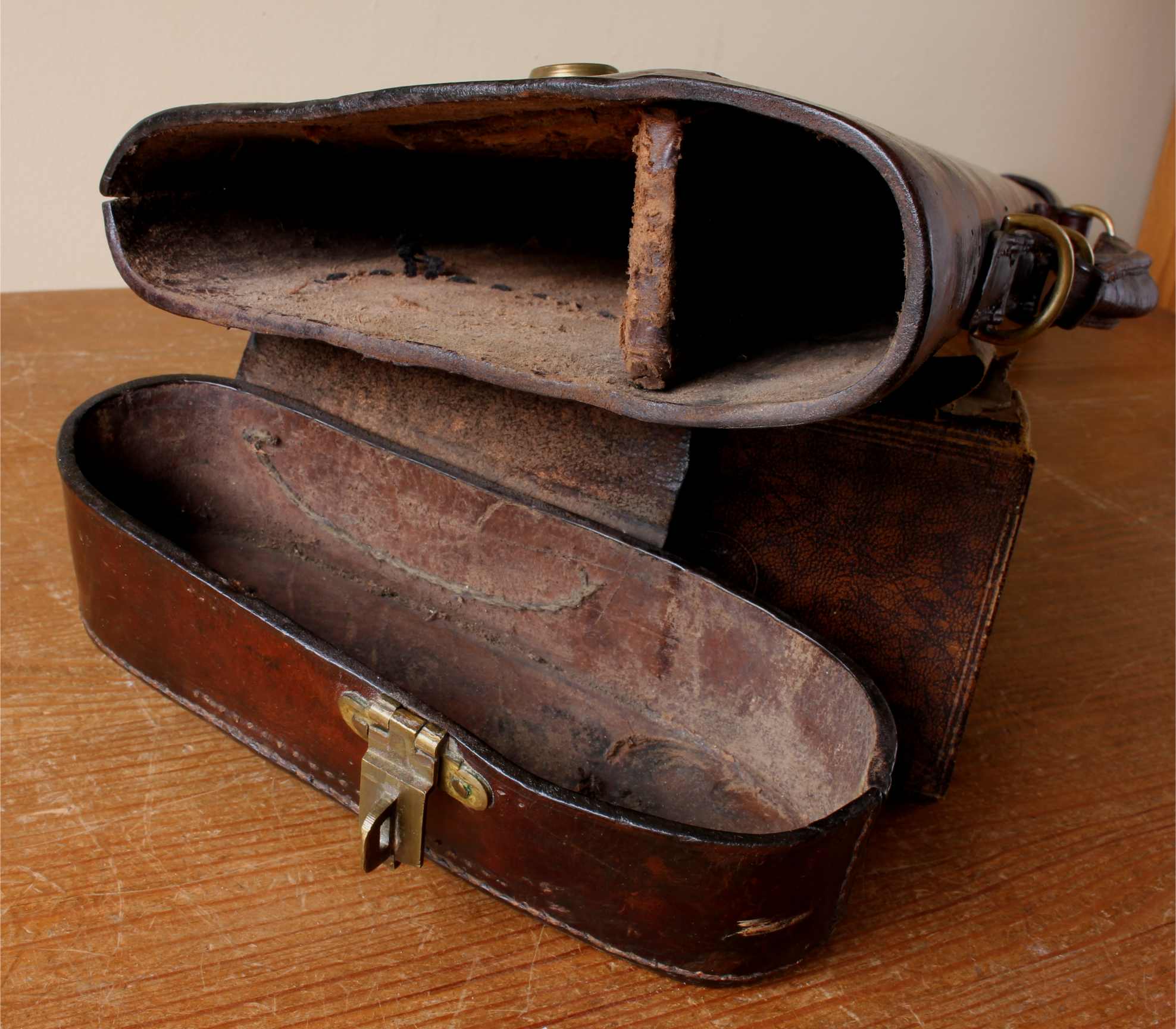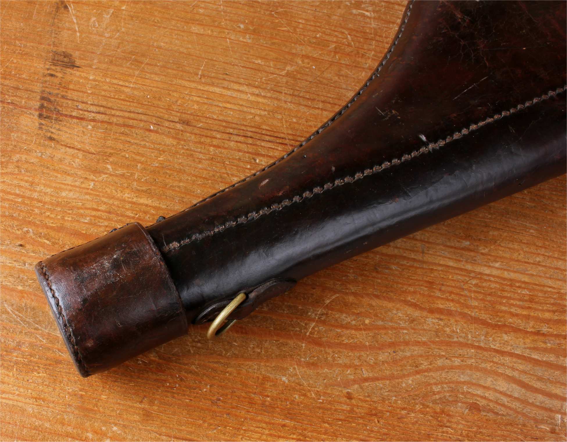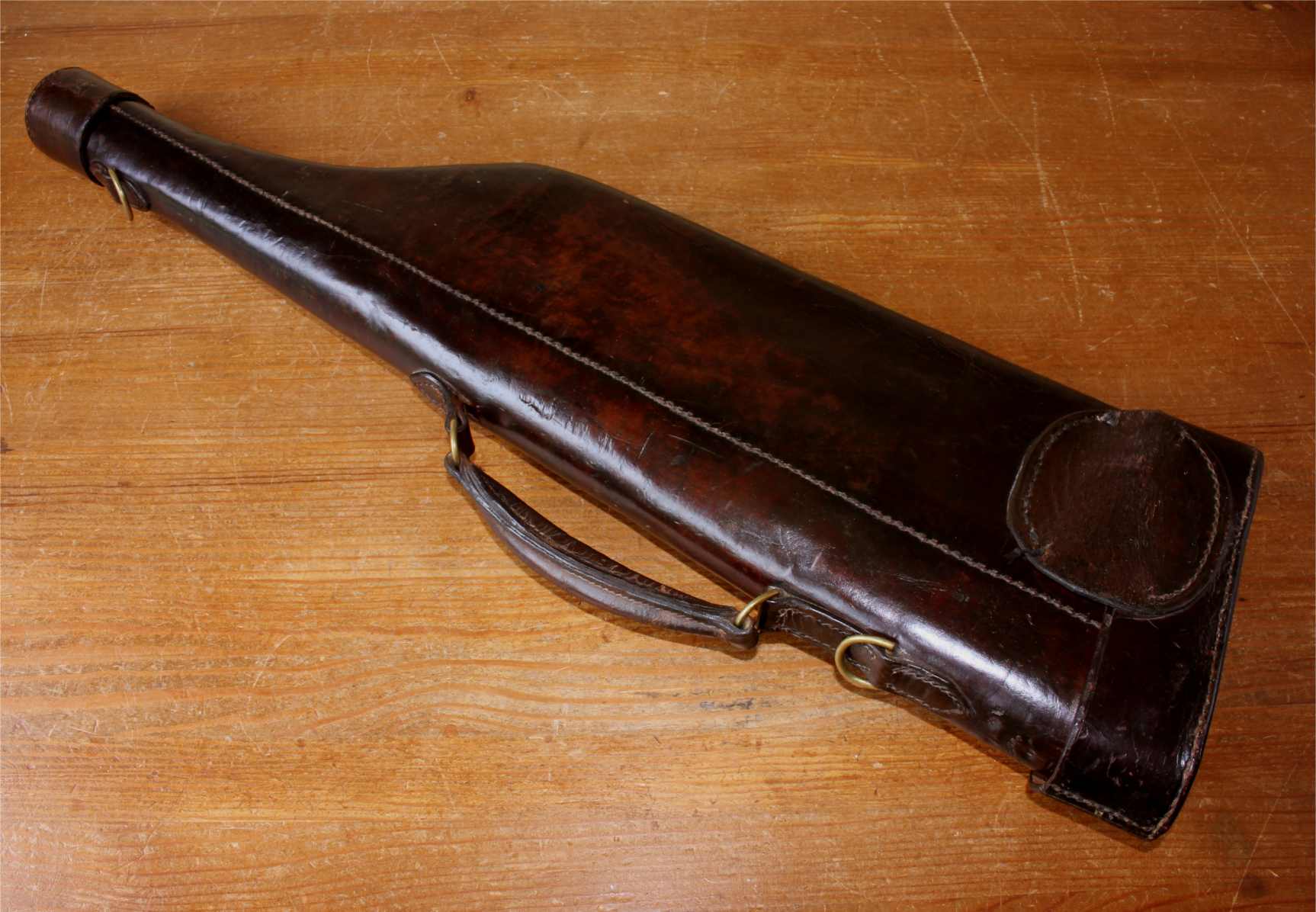 This handsome antique case comes complete with a separate leather end cap which fits over the end nicely to protect and is in good usable condition so could be used to carry and store a shotgun. Would also make a nice display item in a bar, stables, hunting shop or for home decor.