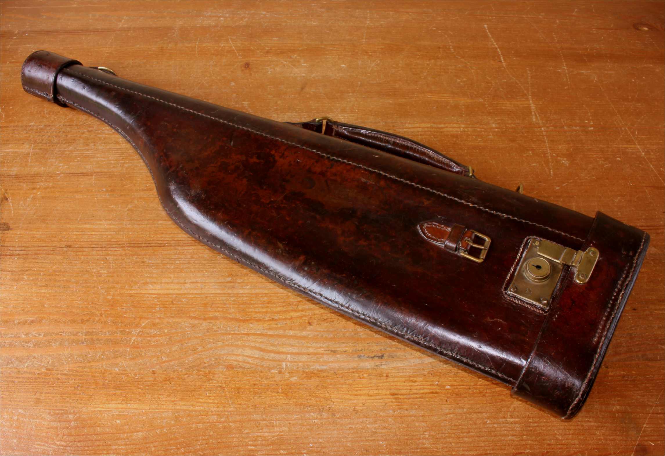 This nice quality Leg of Mutton shotgun case which has a rich brown thick leather outer hard shell has a carry handle, brass lock, brass fittings and dates from the late 19th / early 20th century.